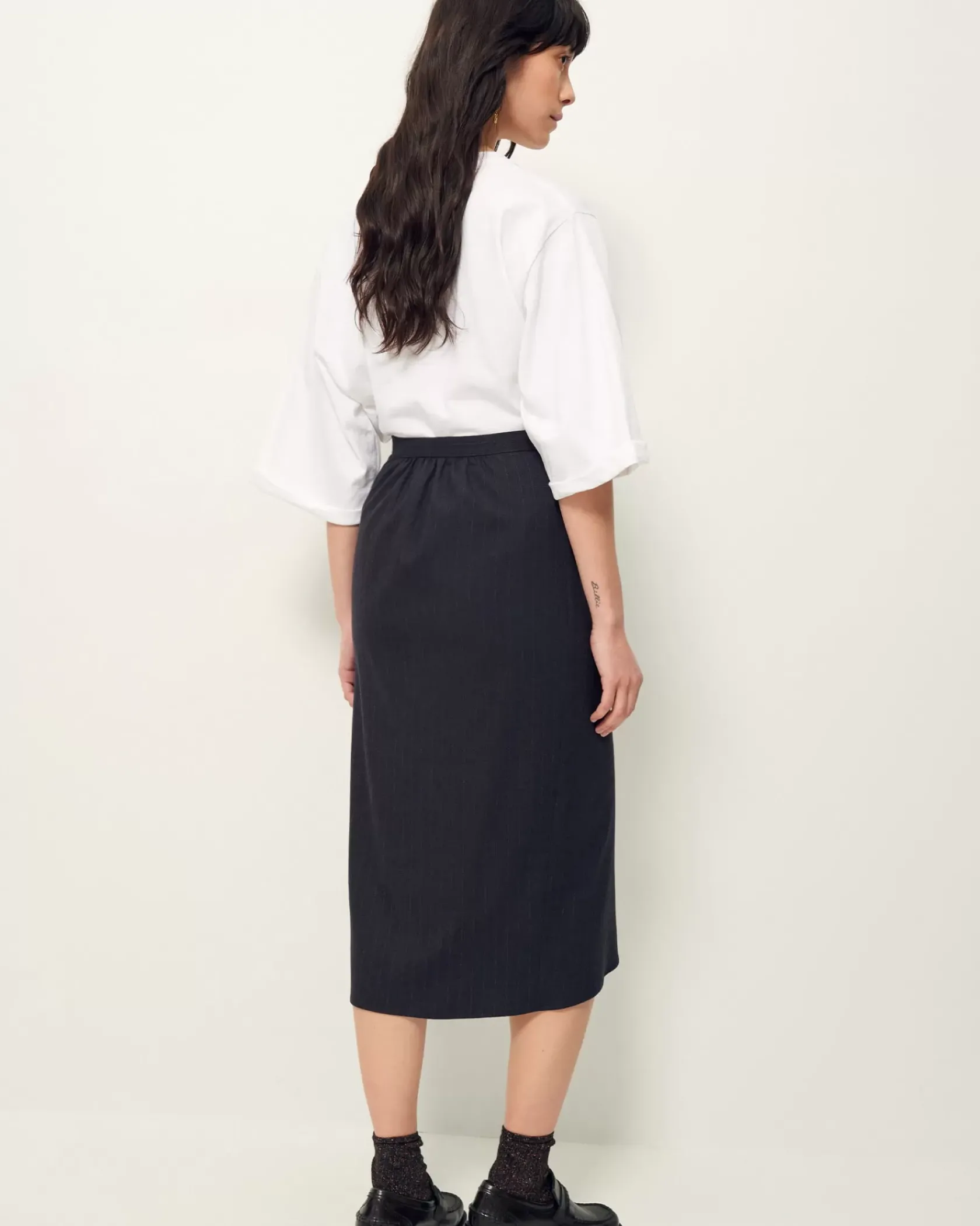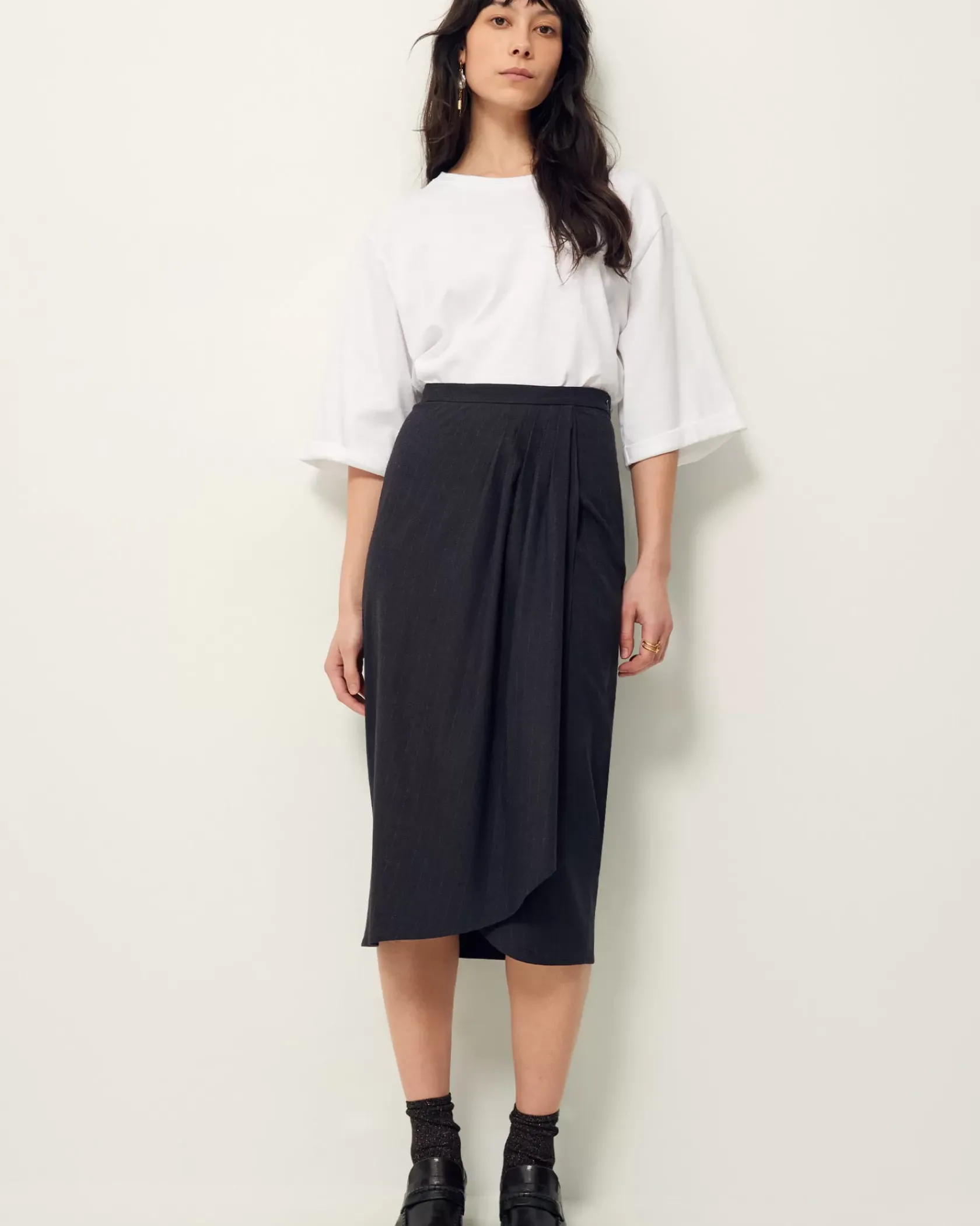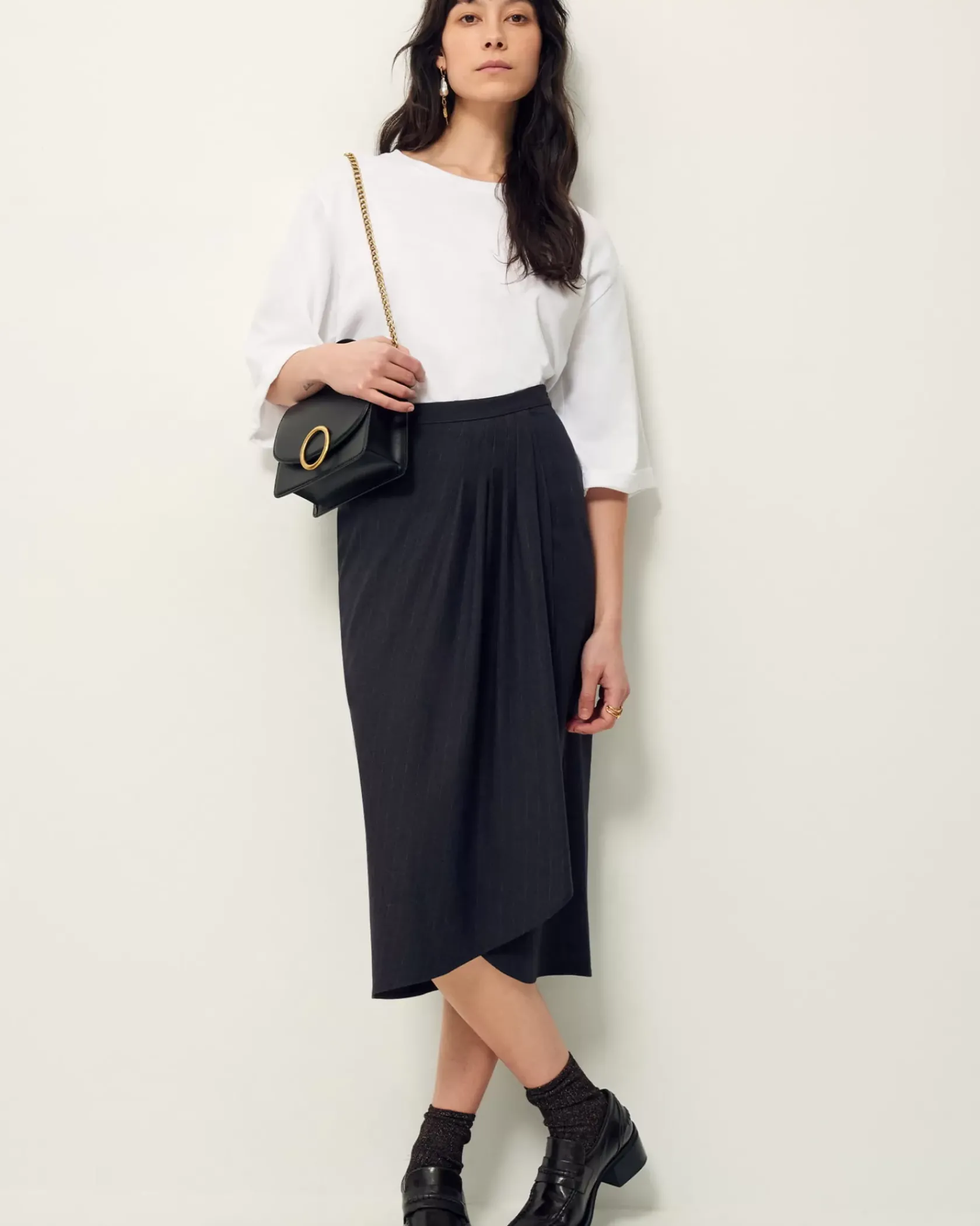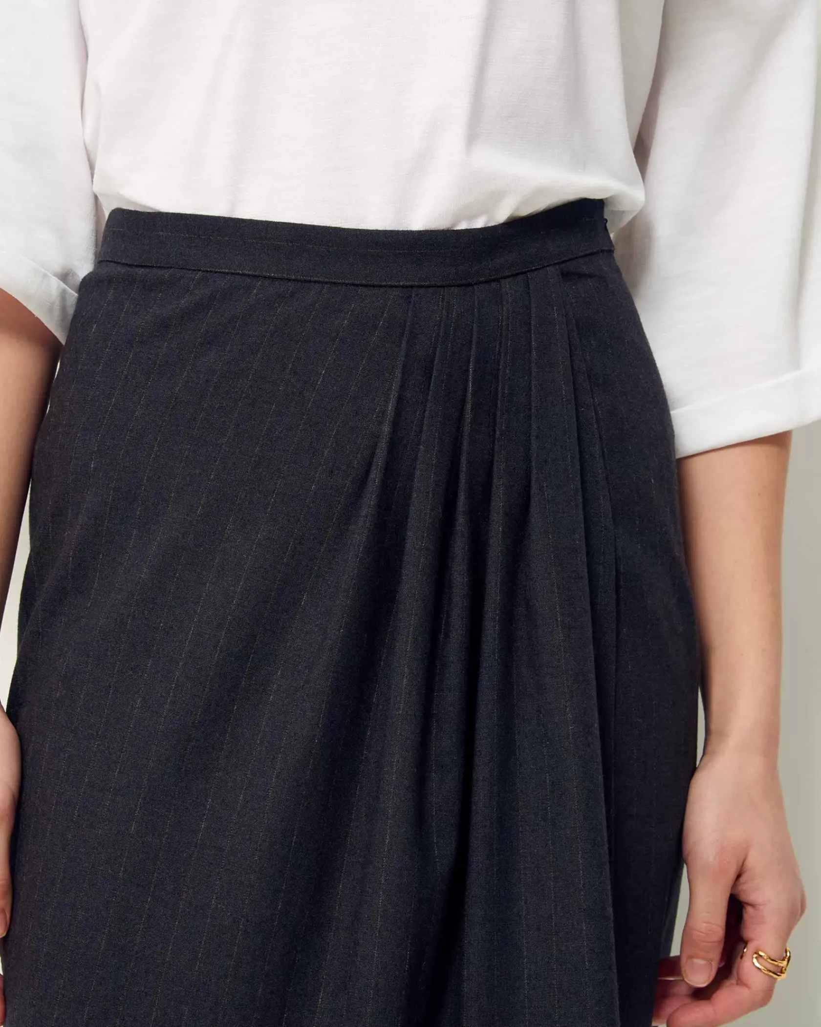 Jupe portefeuille à plis couchés à la taille, mi-longue en flanelle chinée à fines rayures tennis, tissée en Italie.
