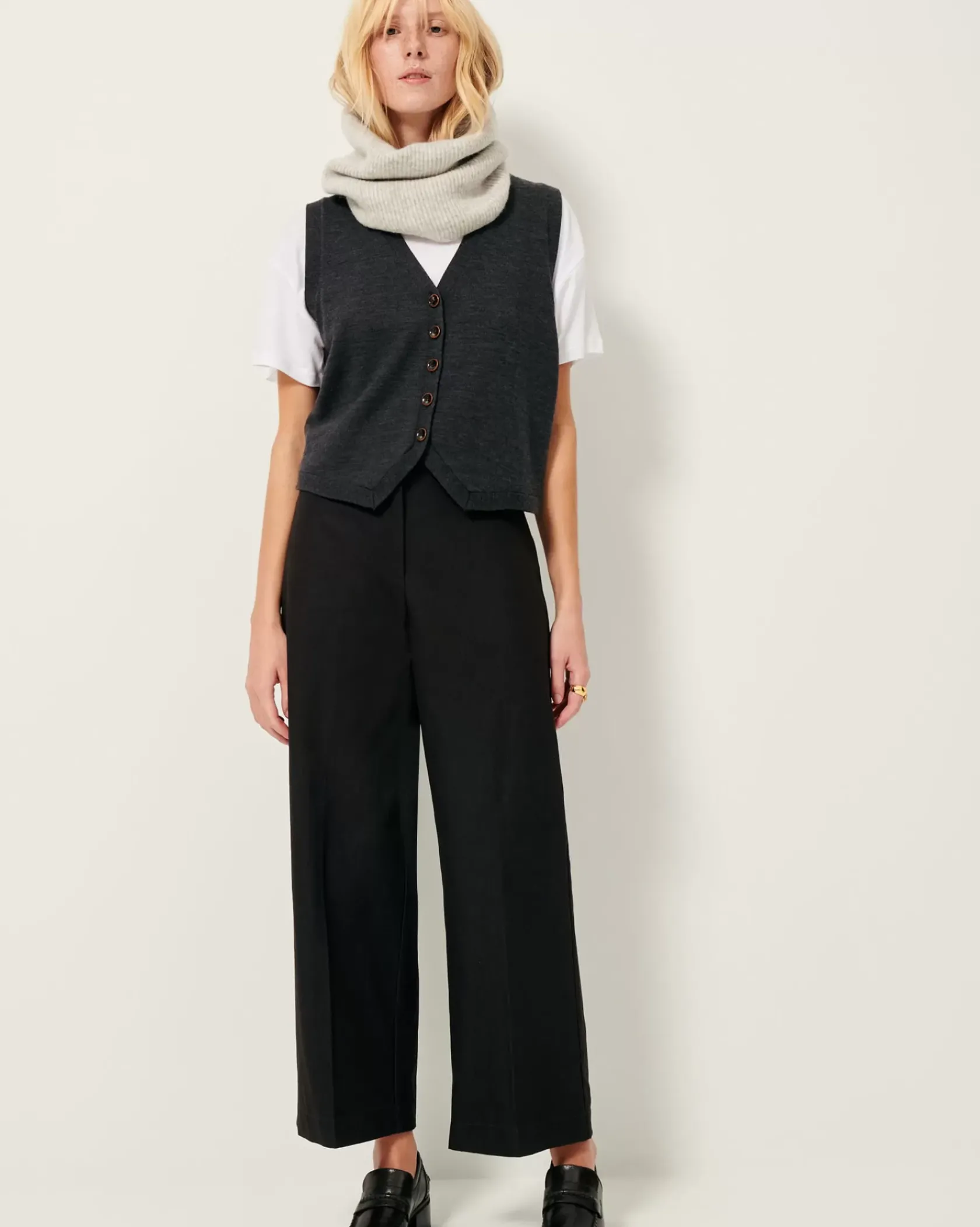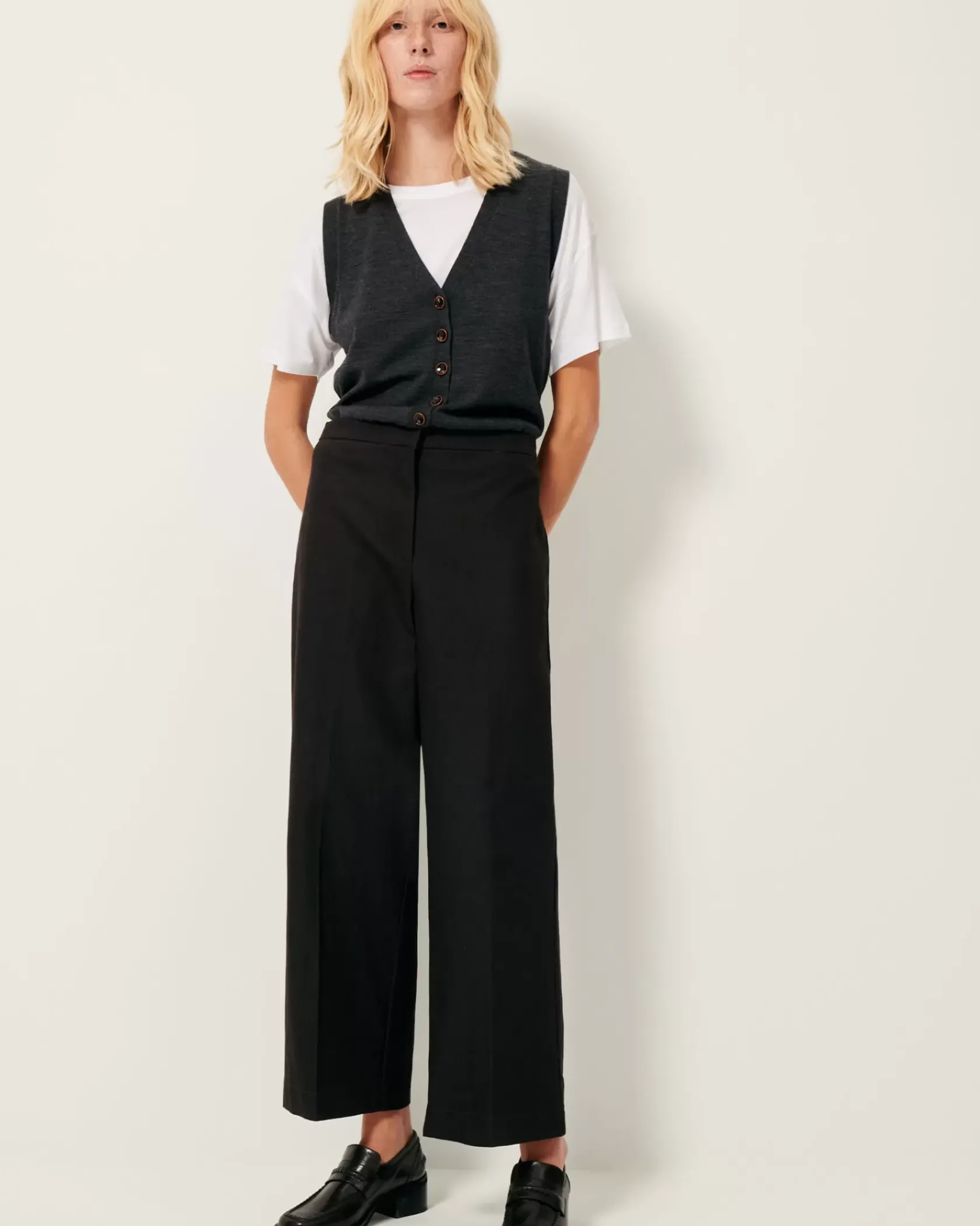Pantalon droit à plis marqués en gabardine à armure fantaisie, lavée et émerisée.