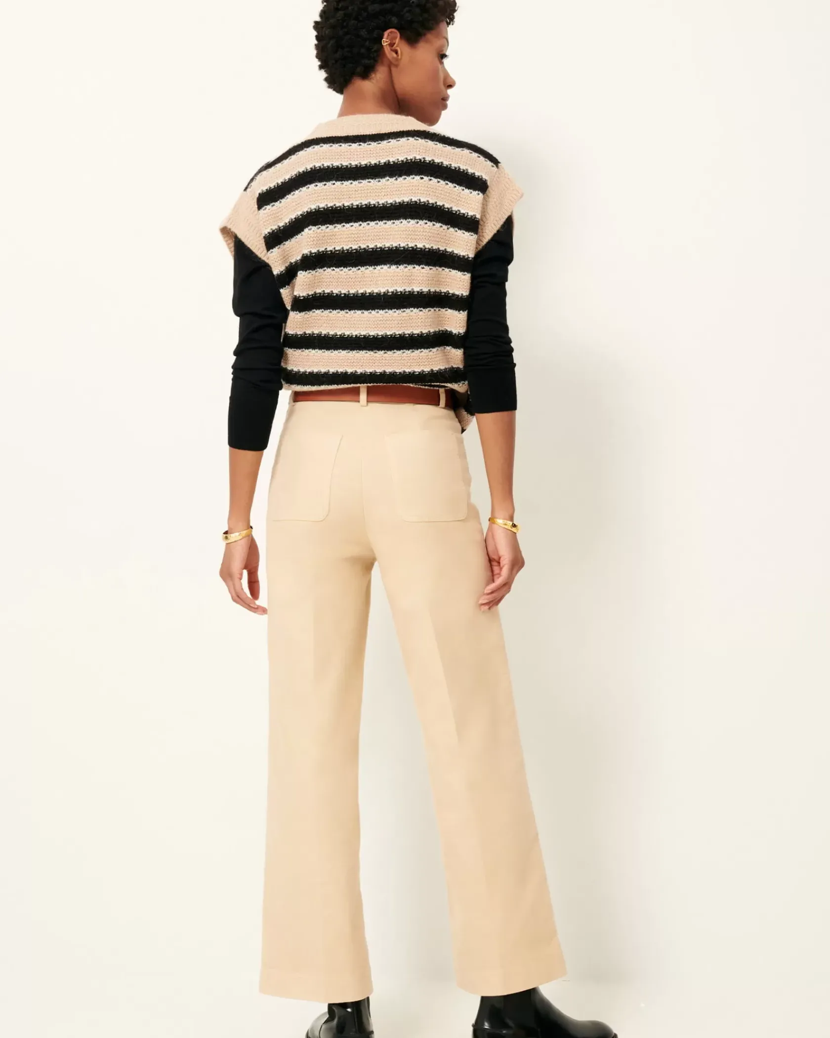 Pantalon droit à plis marqués en gabardine grattée, finition velvet, teint en plongée.