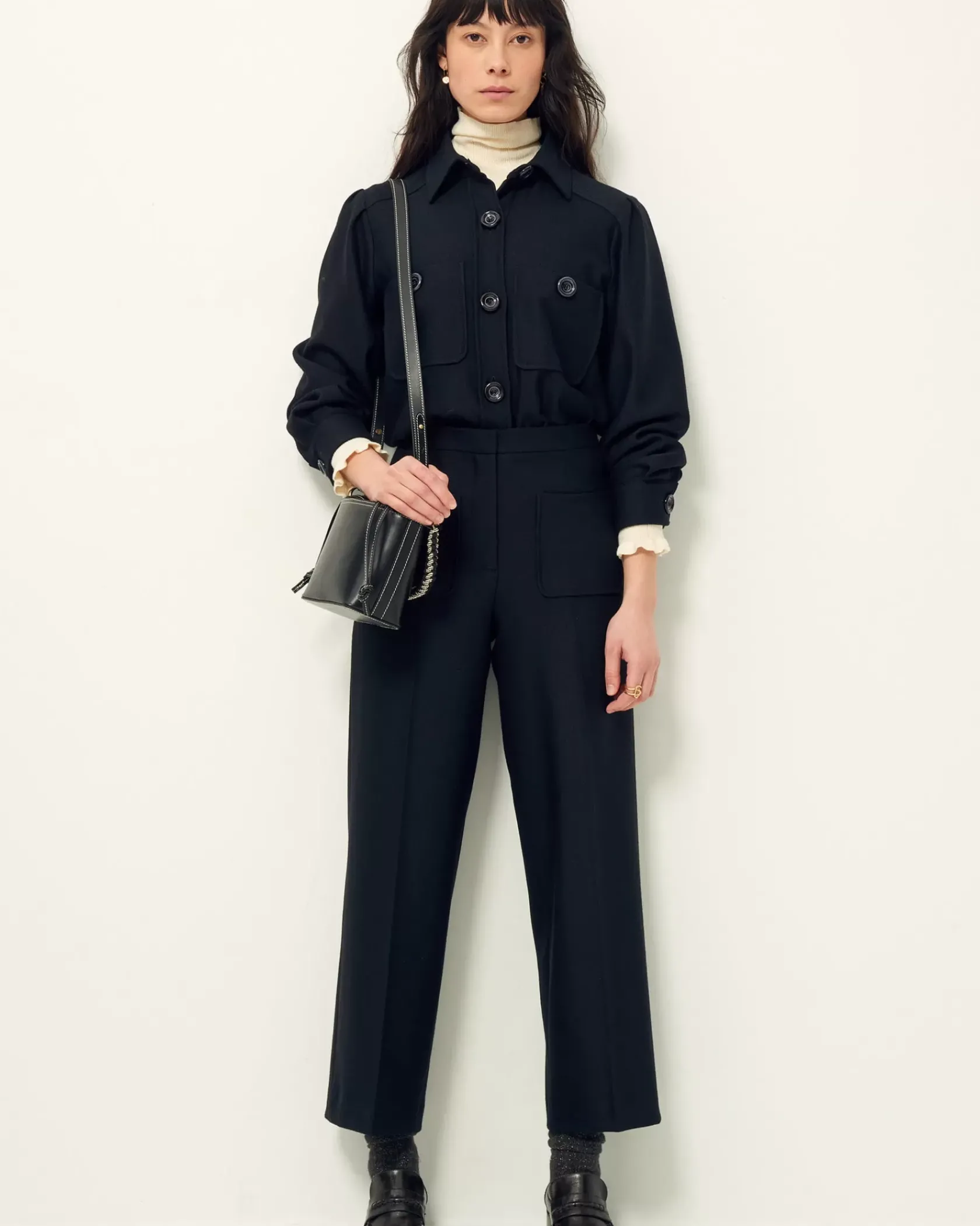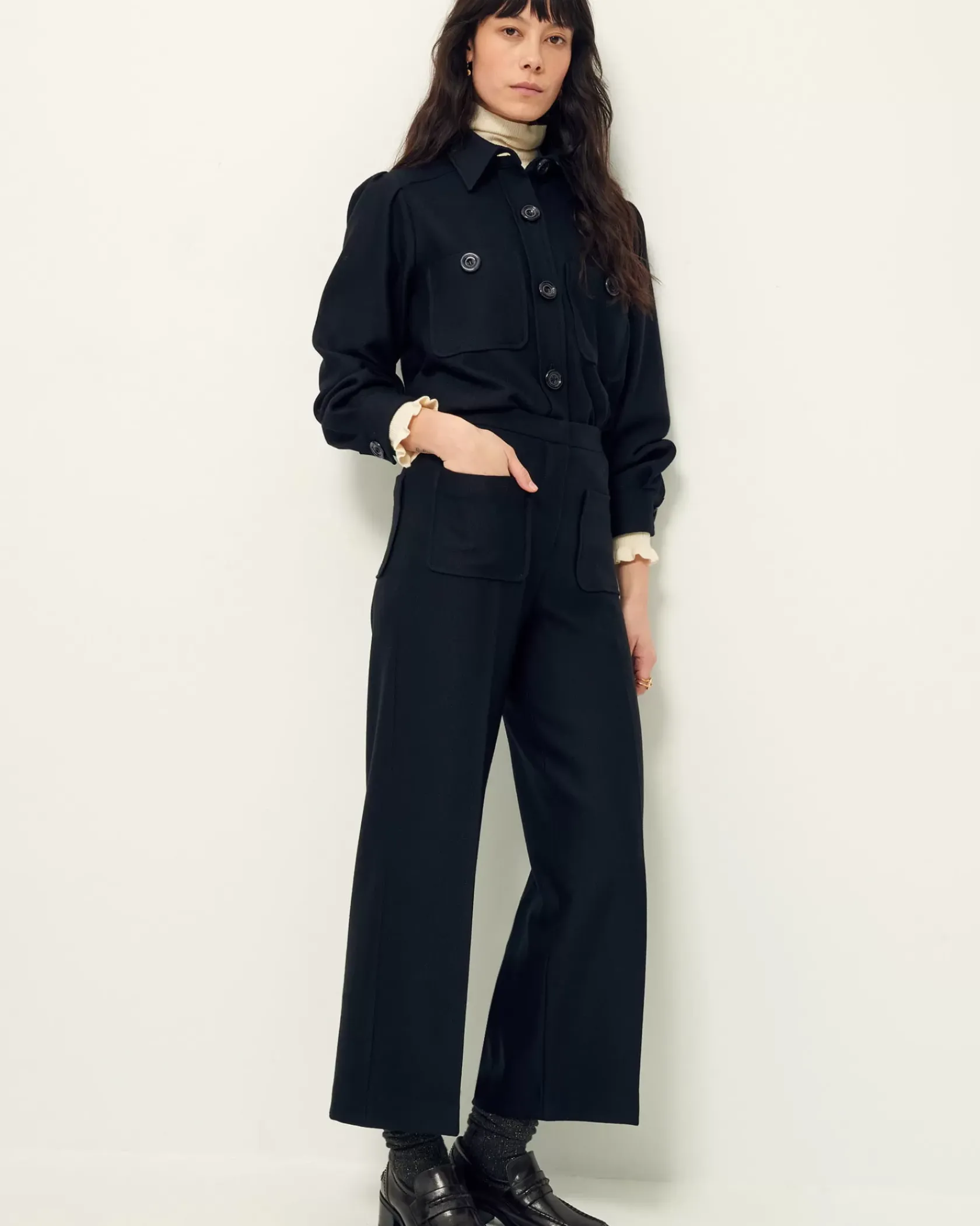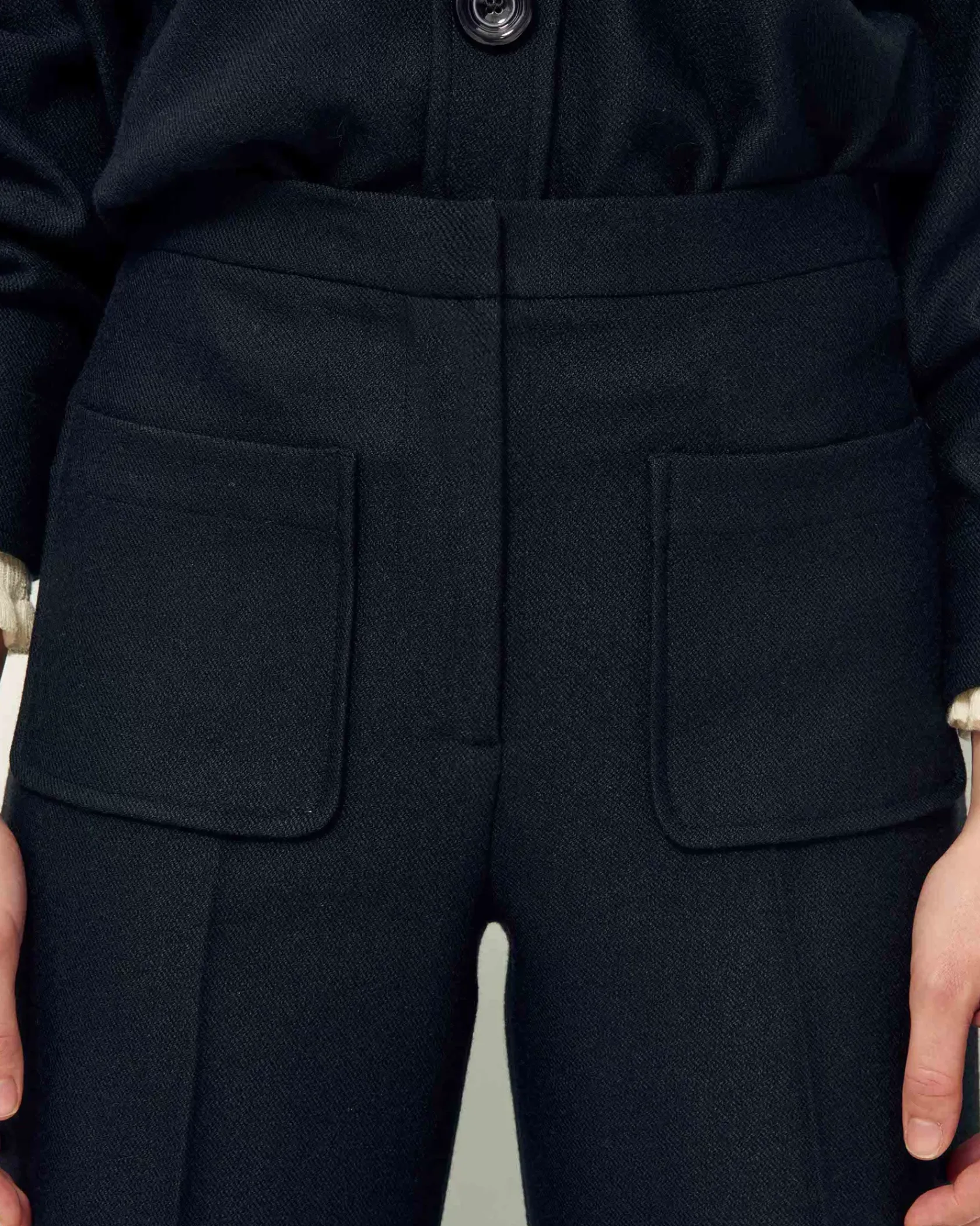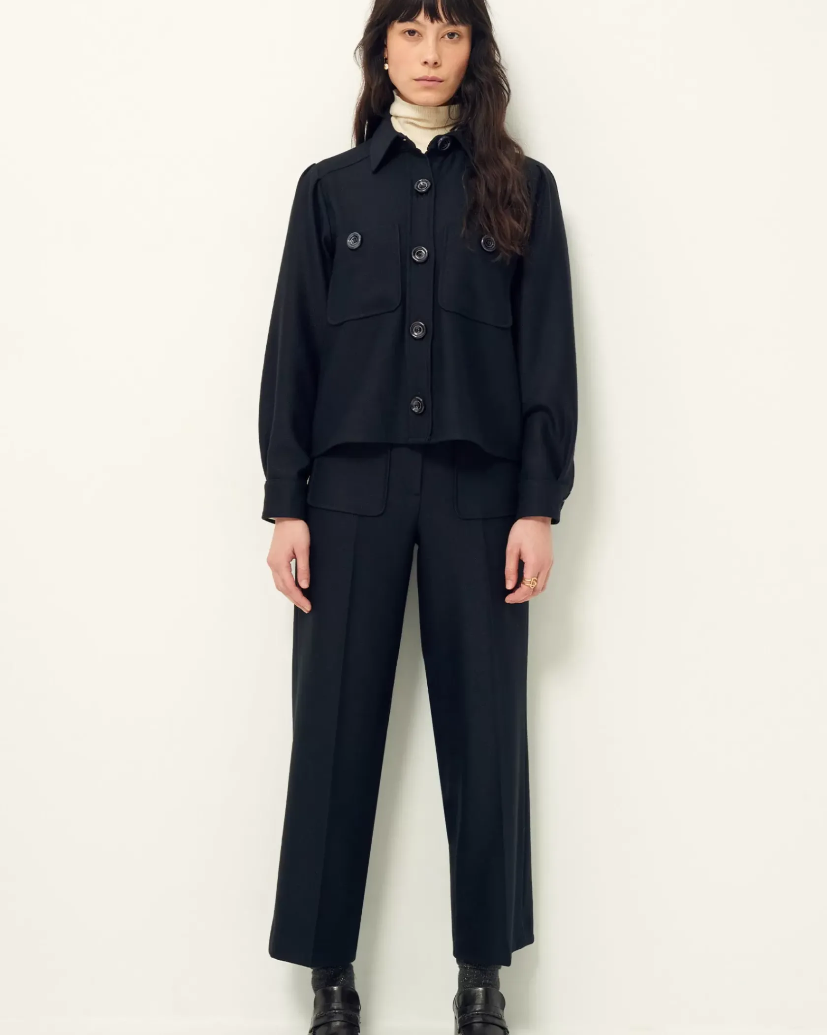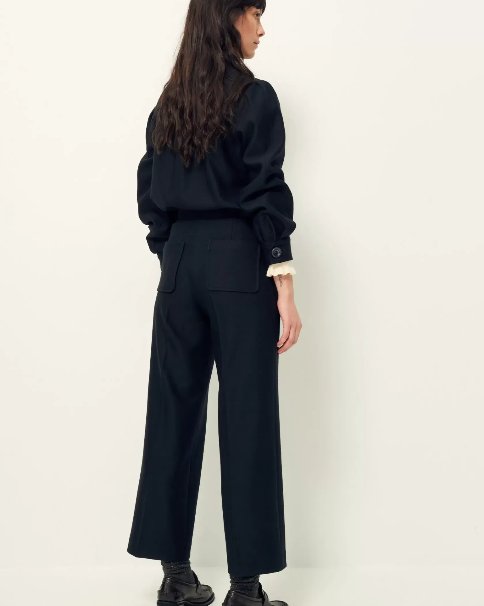 Pantalon droit à plis marqués en tricotine fluide, tissée au Portugal.