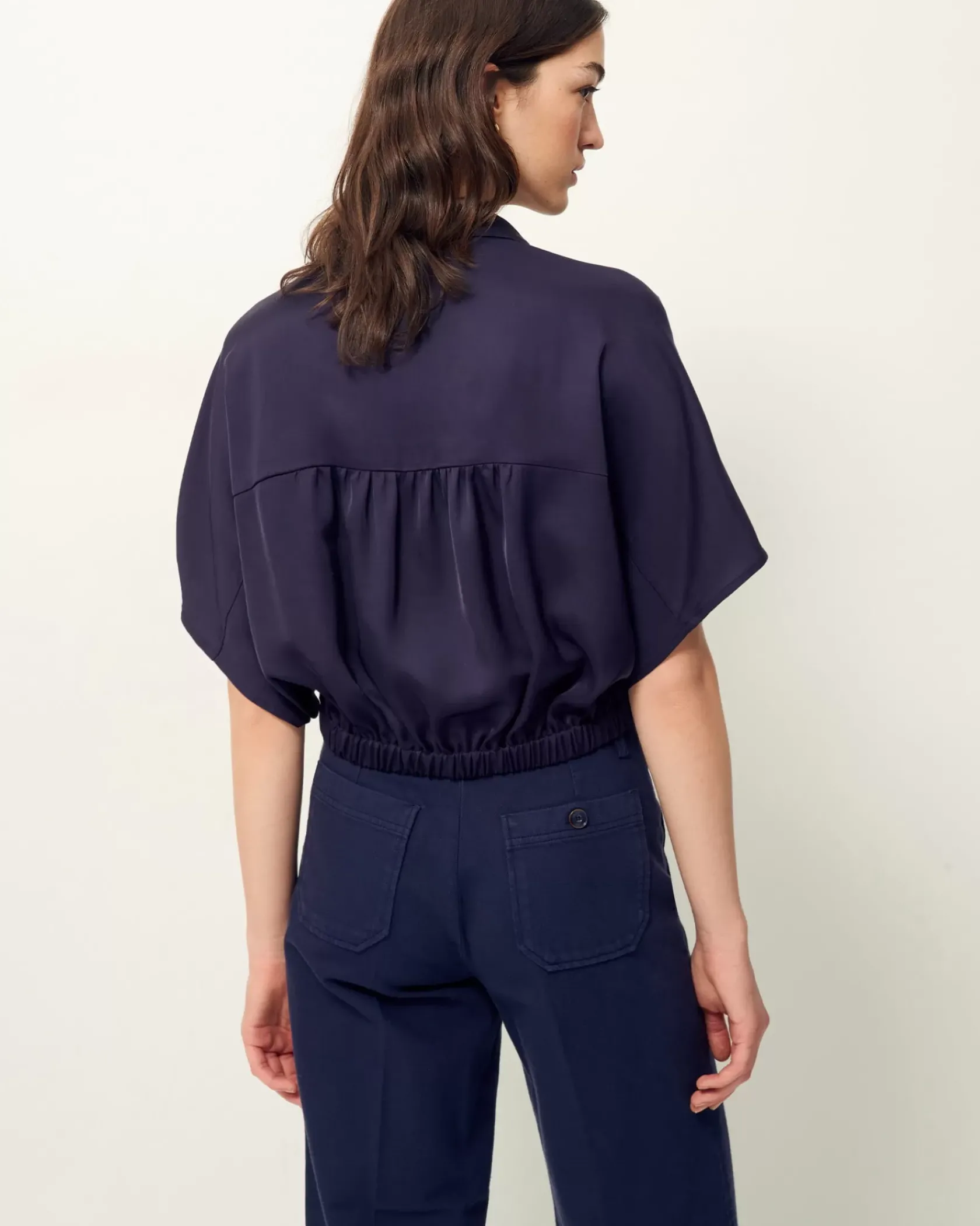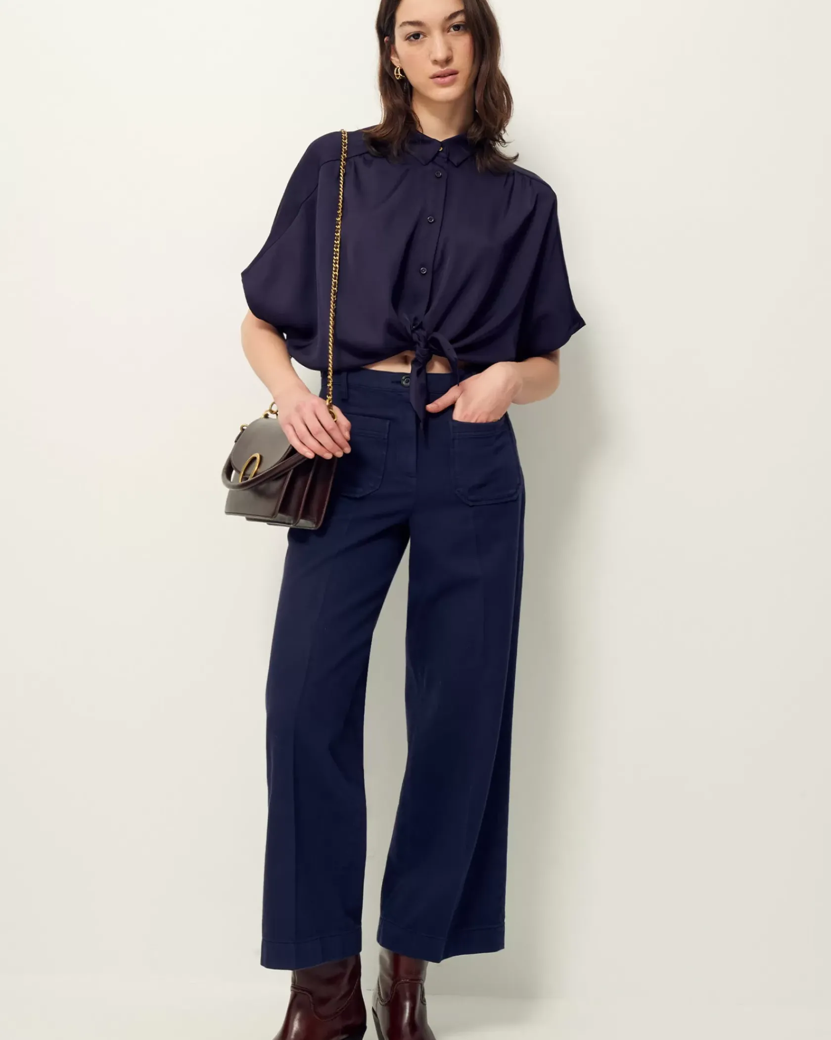 Pantalon droit à plis marqués en sergé souple teint en plongée tissée en Espagne.