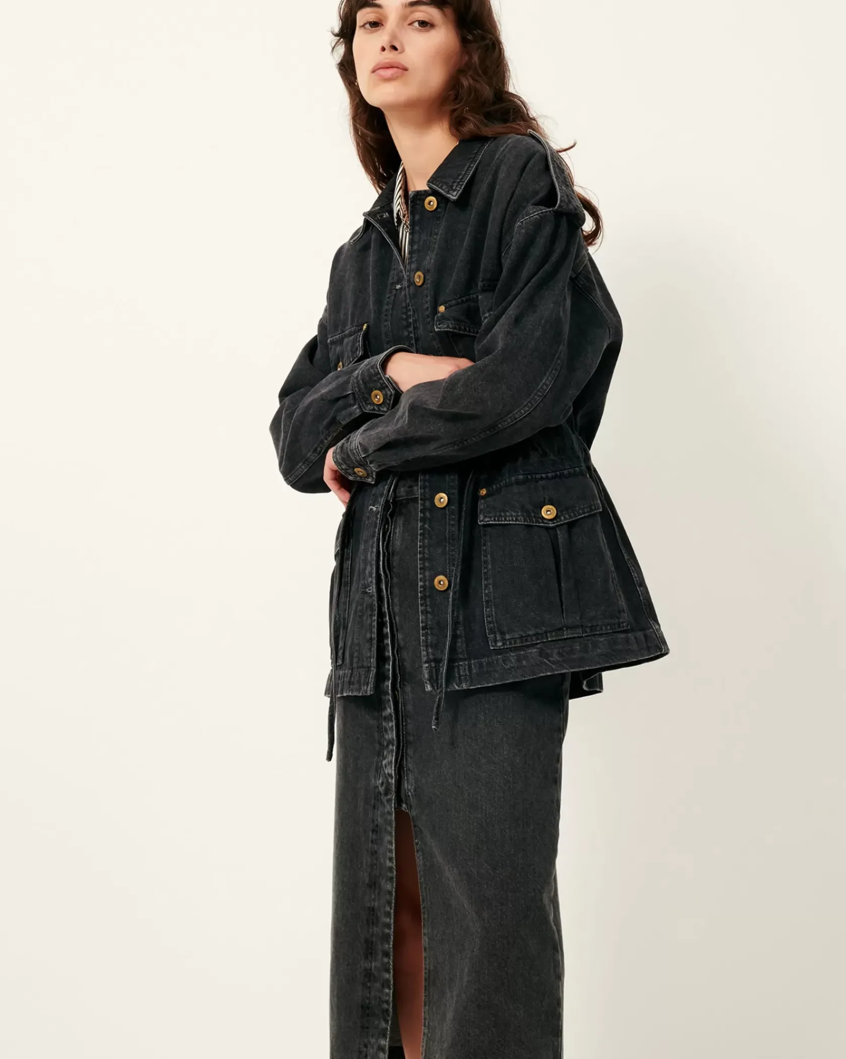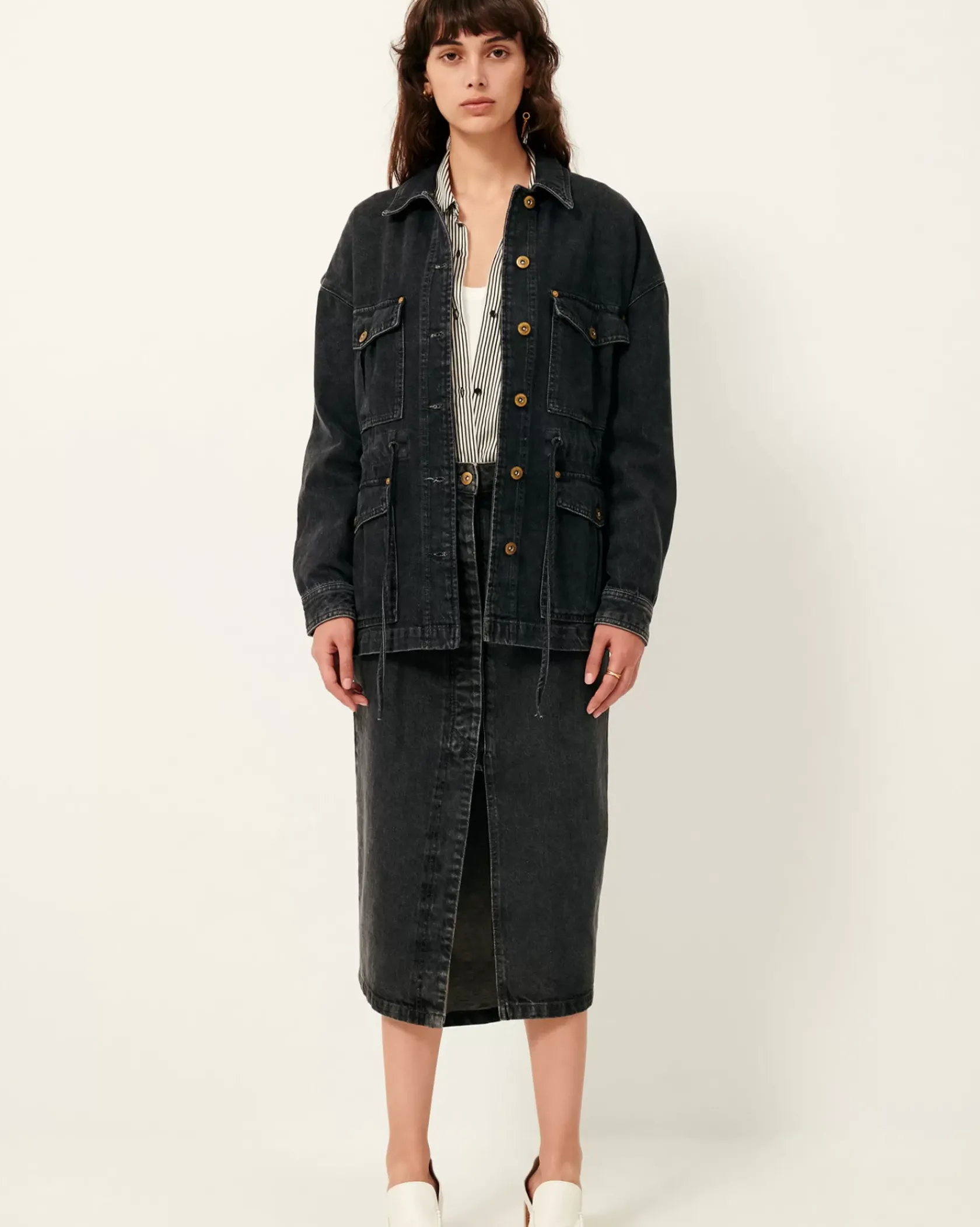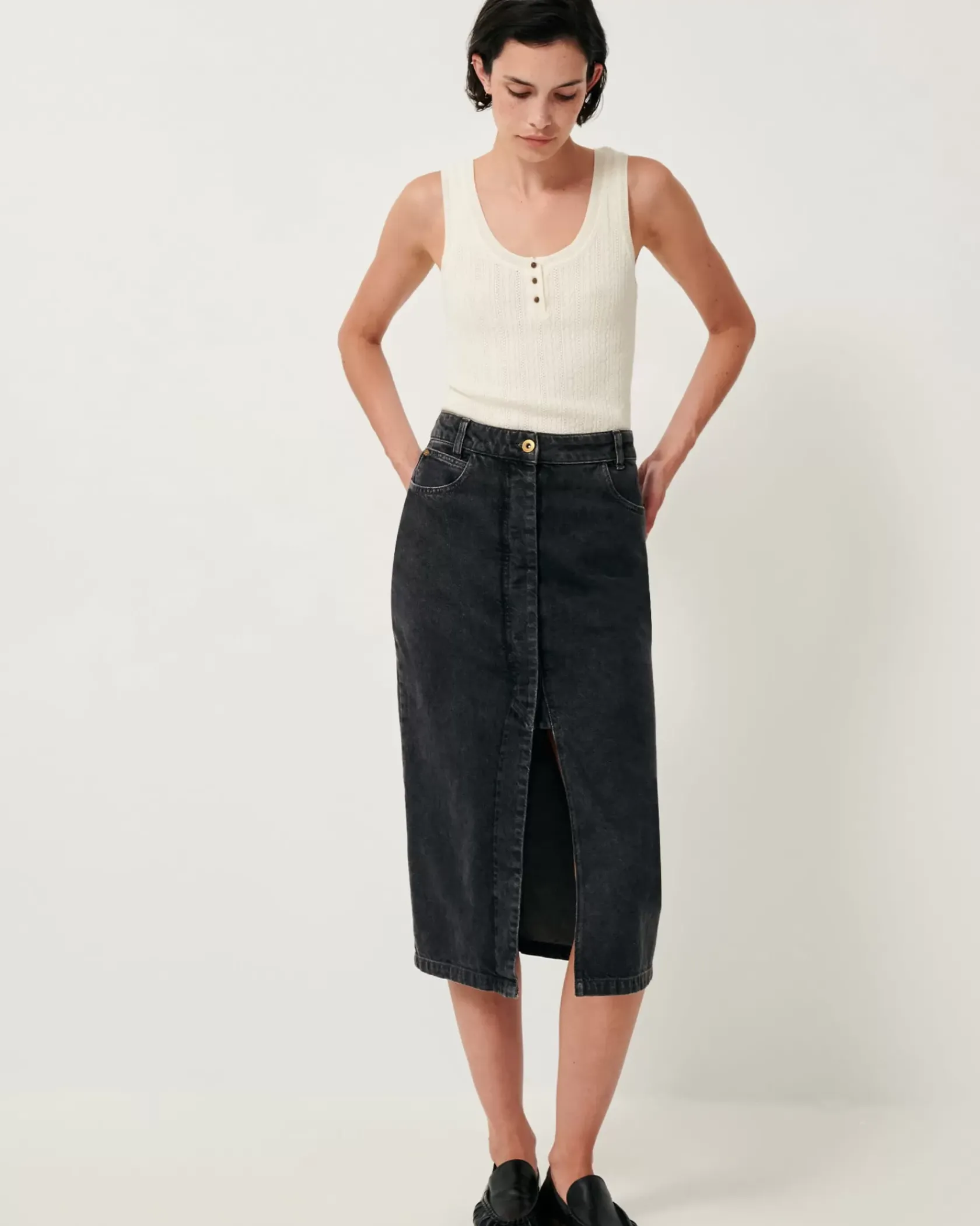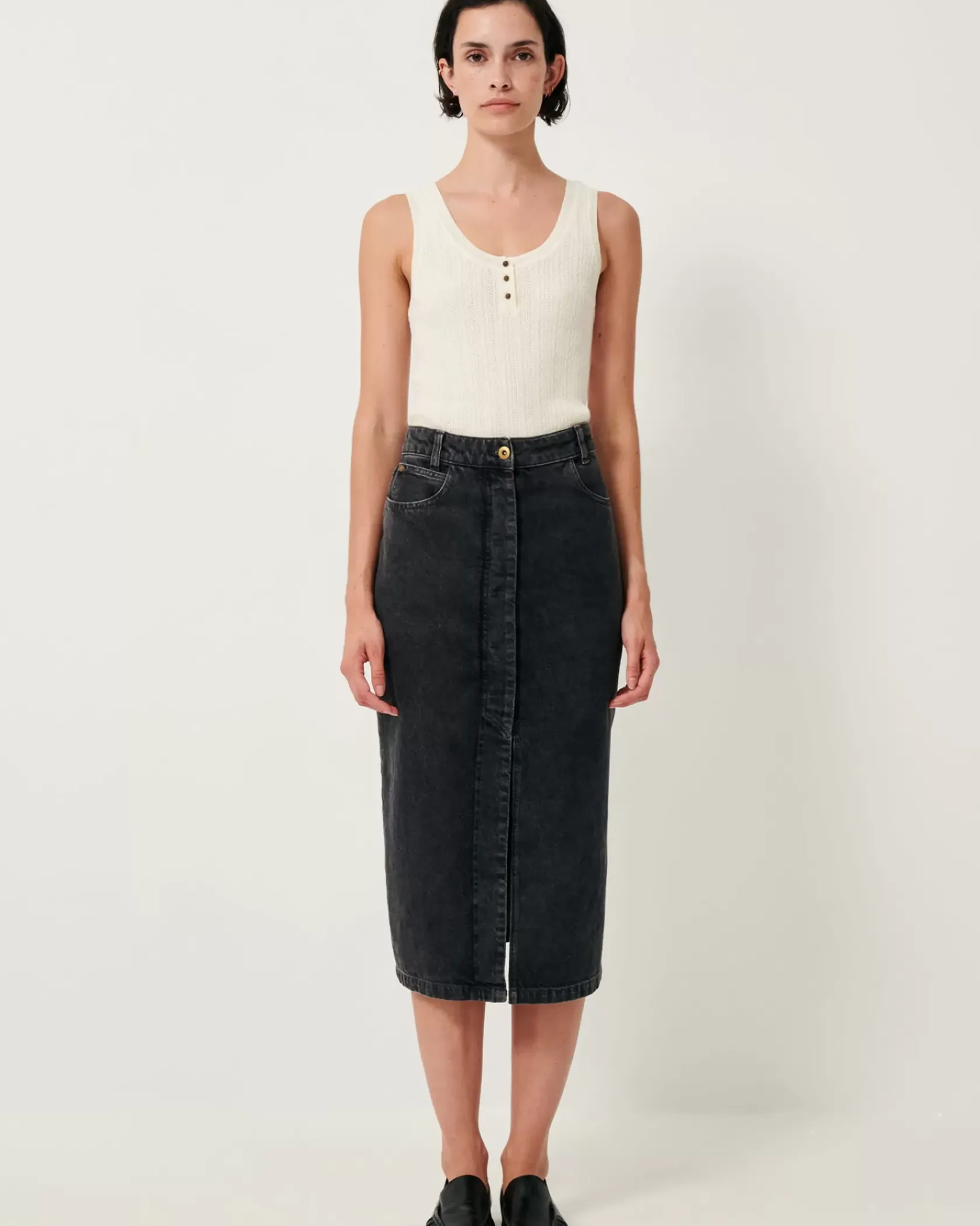 Jupe droite mi-longue fendue sur le devant en denim stonewashé.