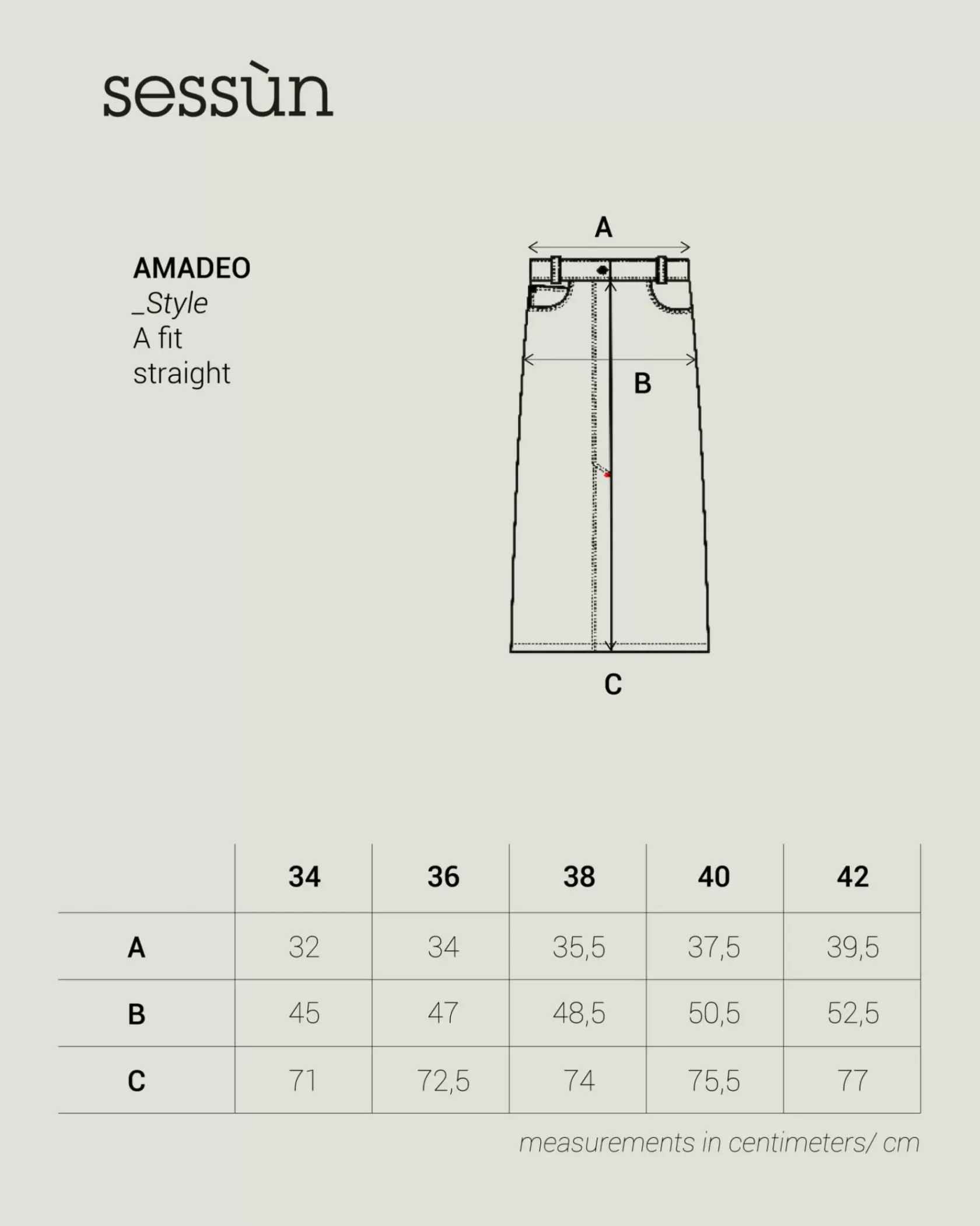 | Size | 34, 36, 38, 40, 42 |