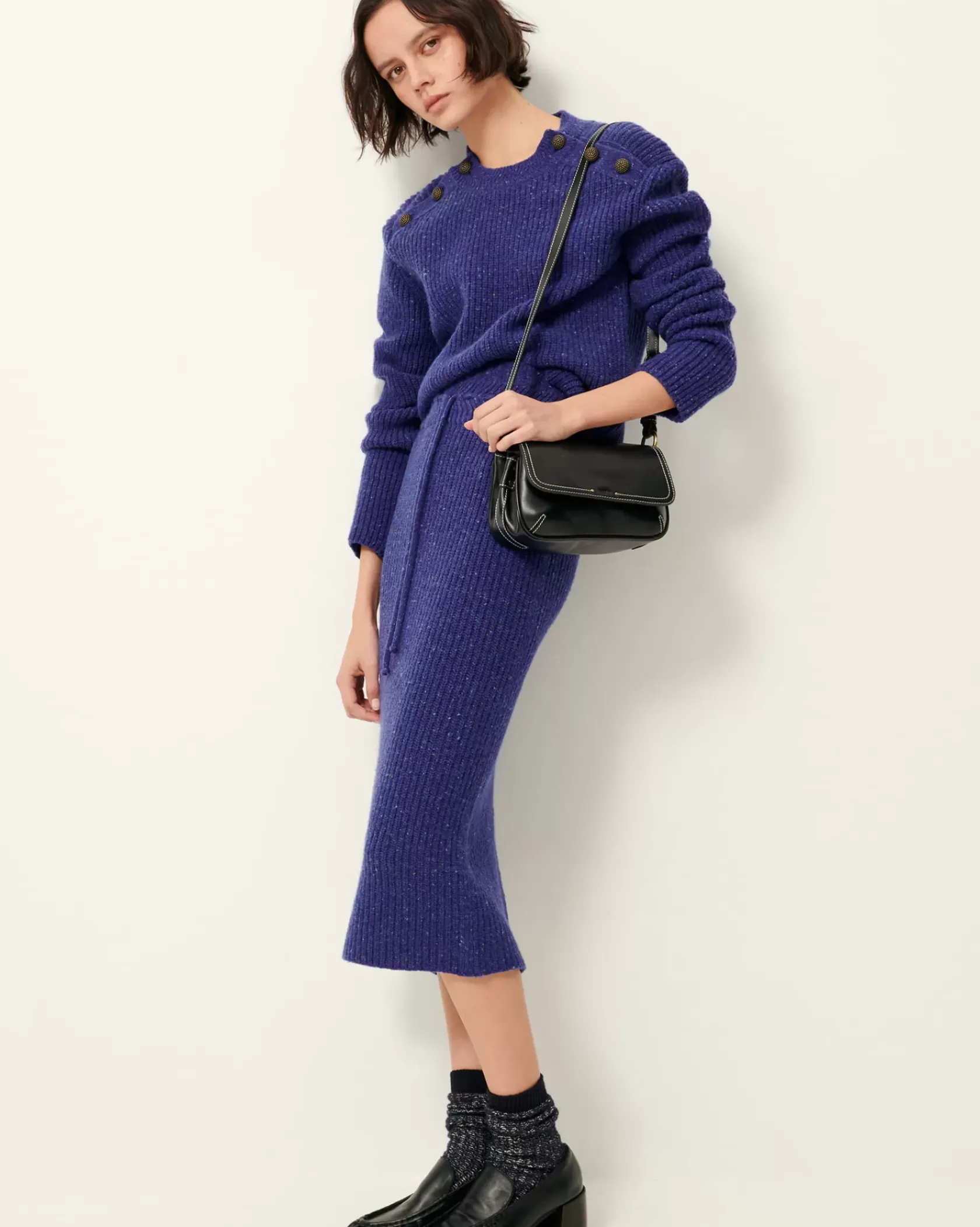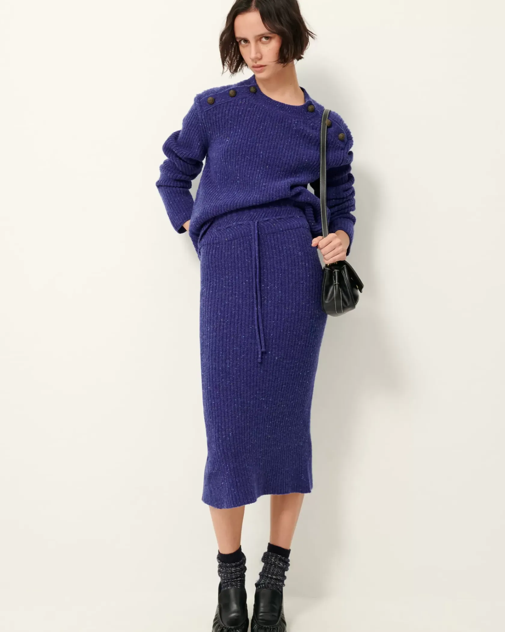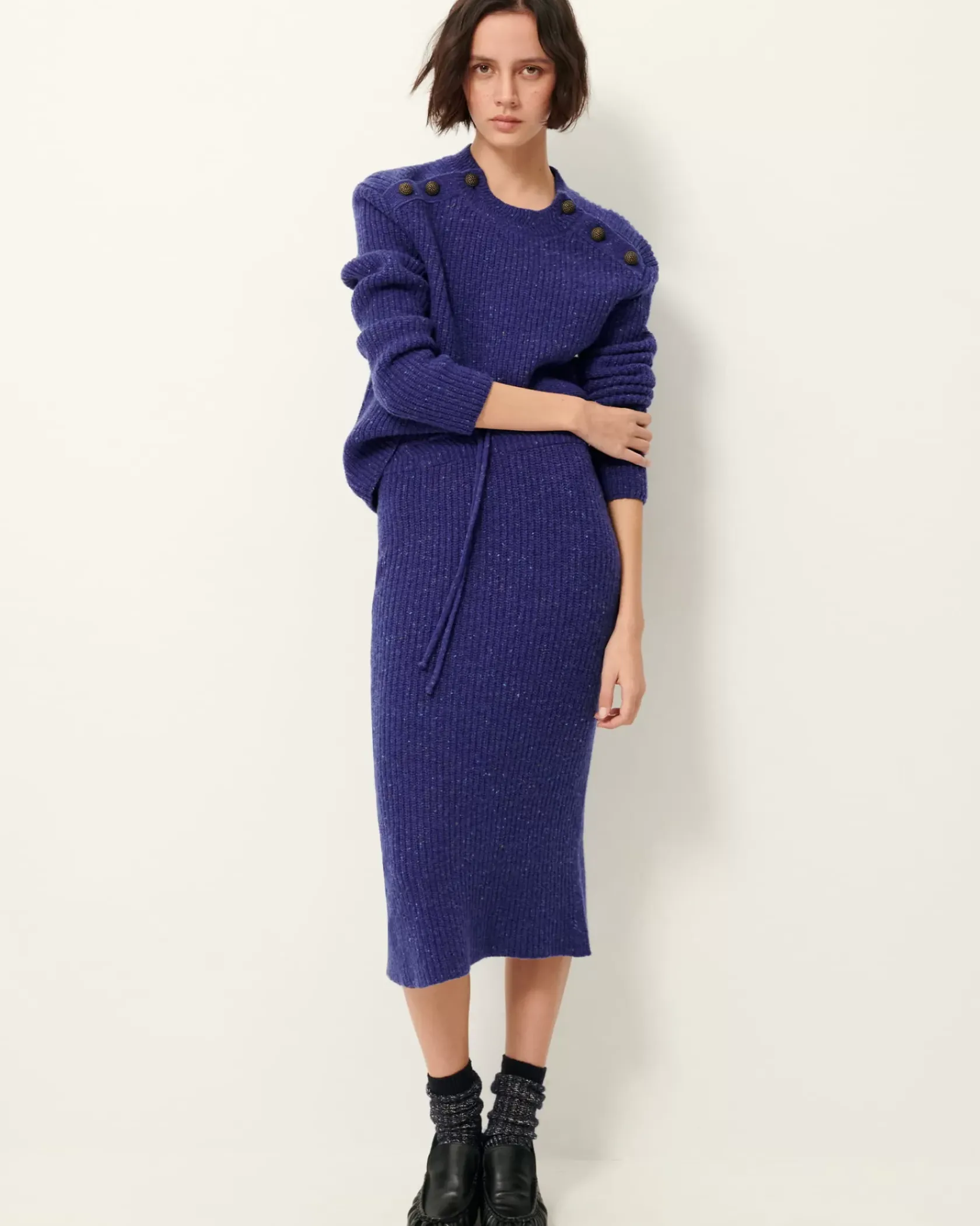 Jupe crayon mi-longue en côtes anglaises duveteuses.