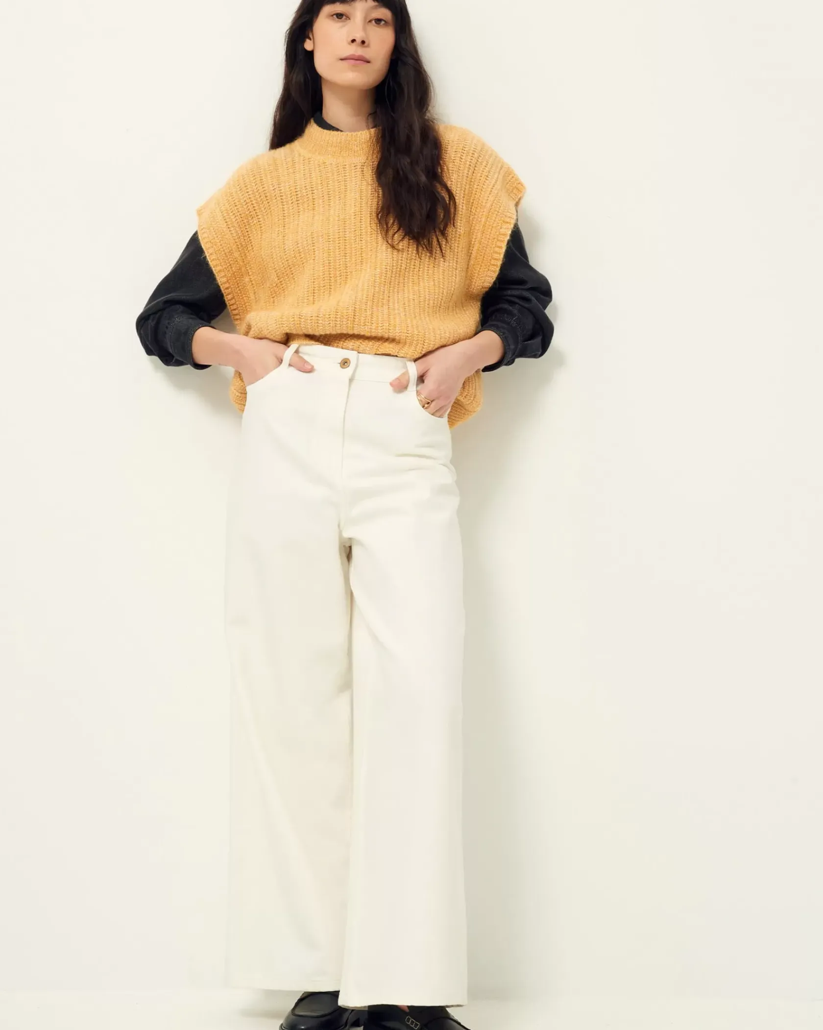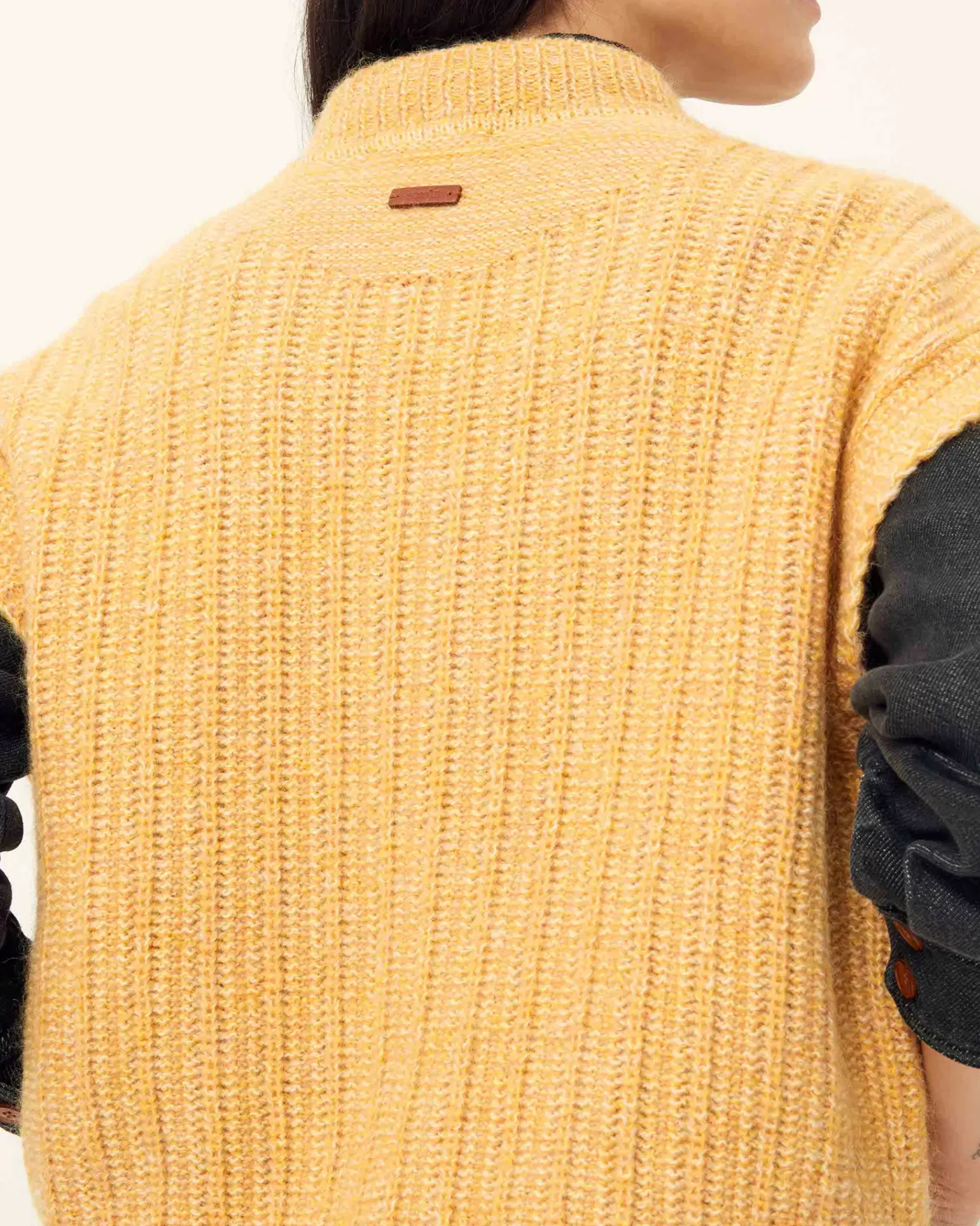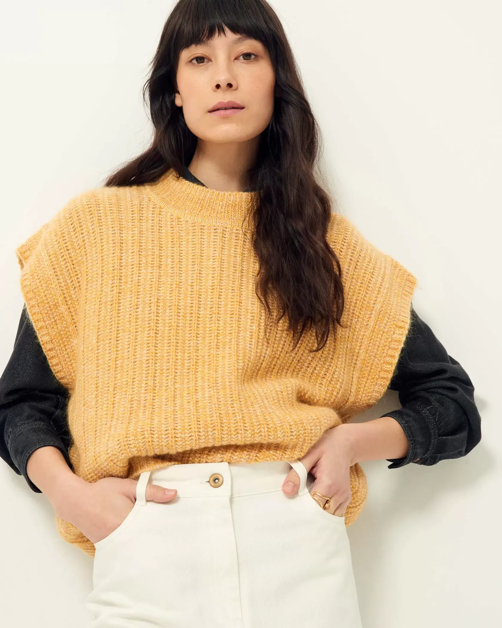 Pull sans manches en maille duveteuse côtelée et texturée, tricoté en Italie.