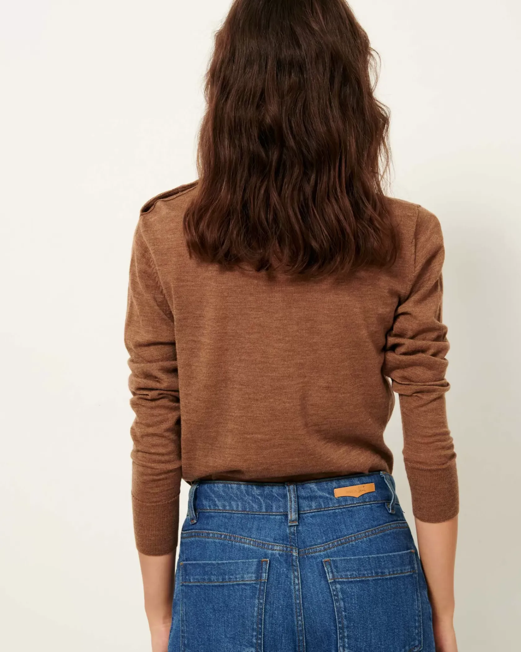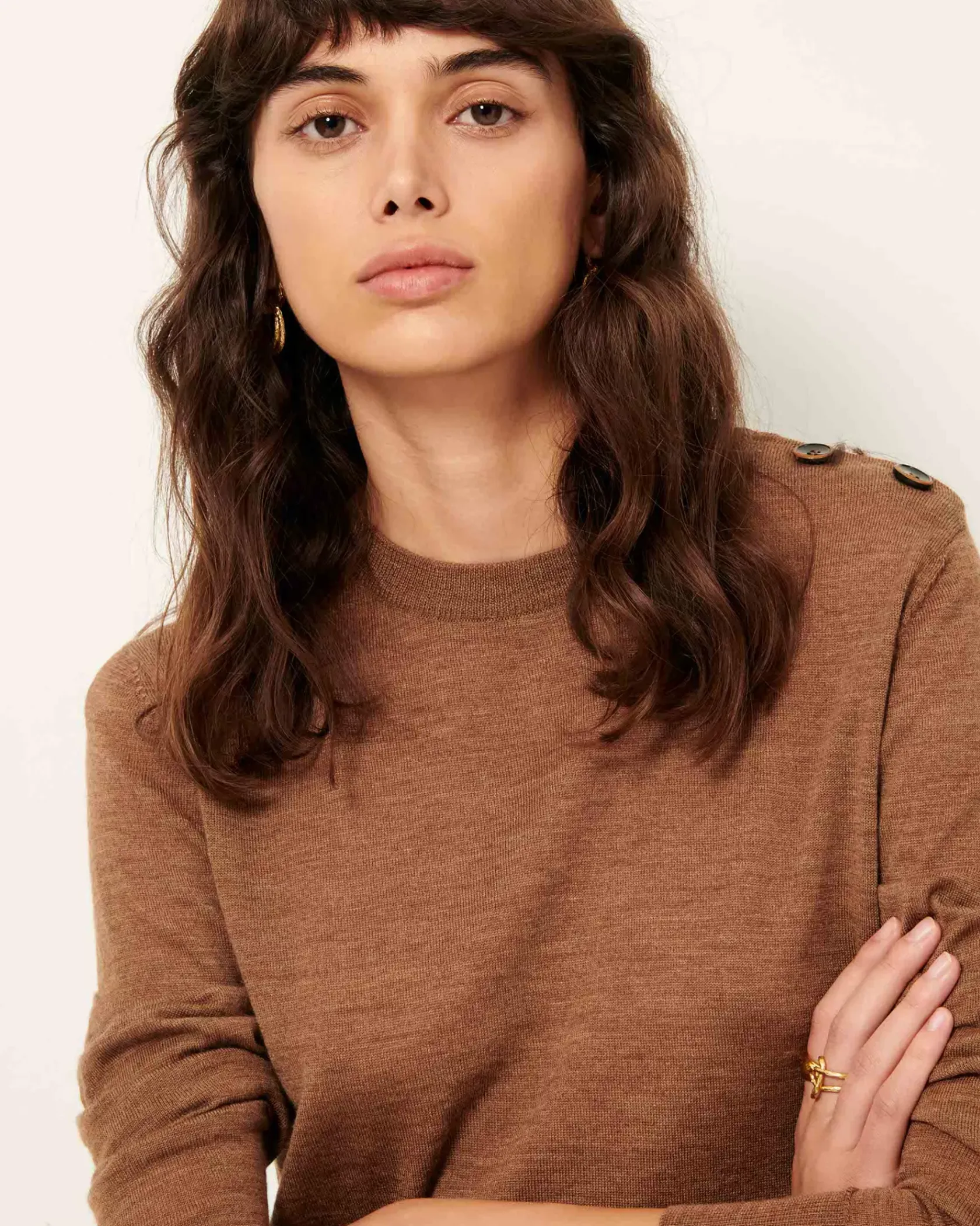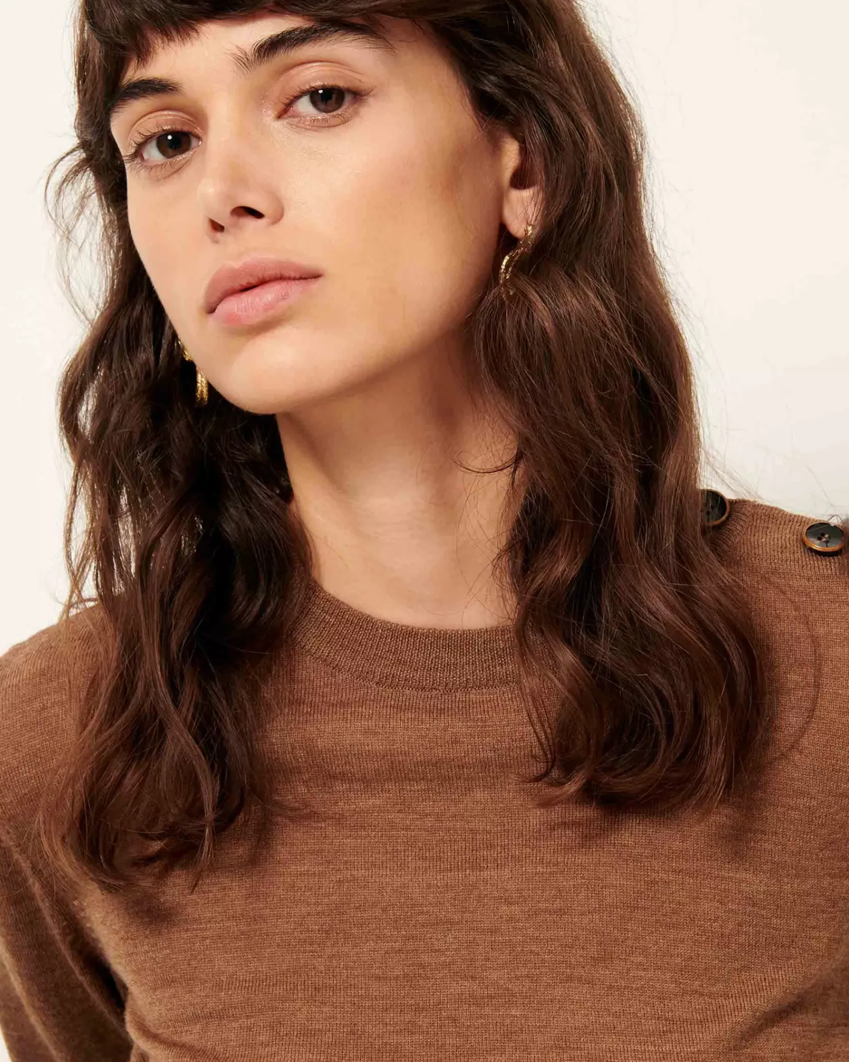 Pull ajusté à patte épaule boutonnée en maille fine jauge mérinos, point jersey.