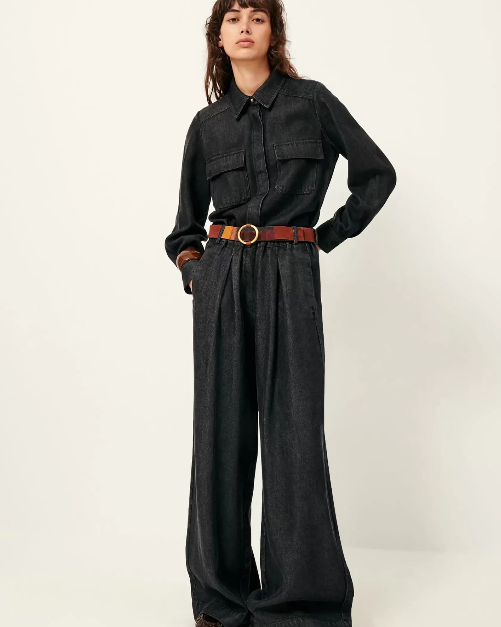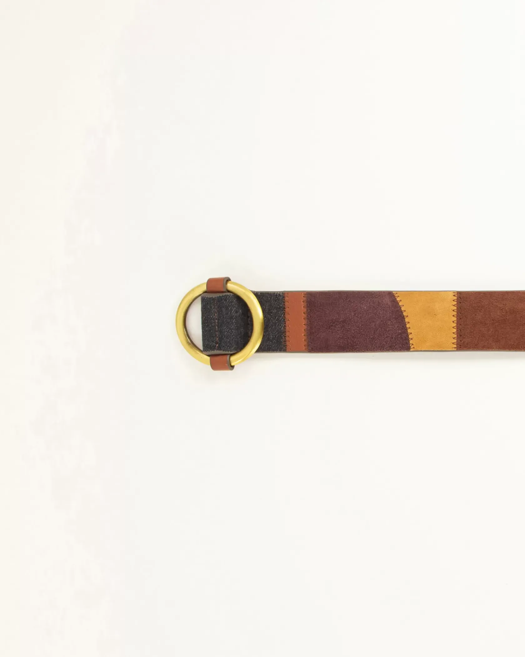 Ceinture boucle coulissante, en patchwork de chèvre suédé, cuir d’agneau, cuir de chèvre et denim coton.