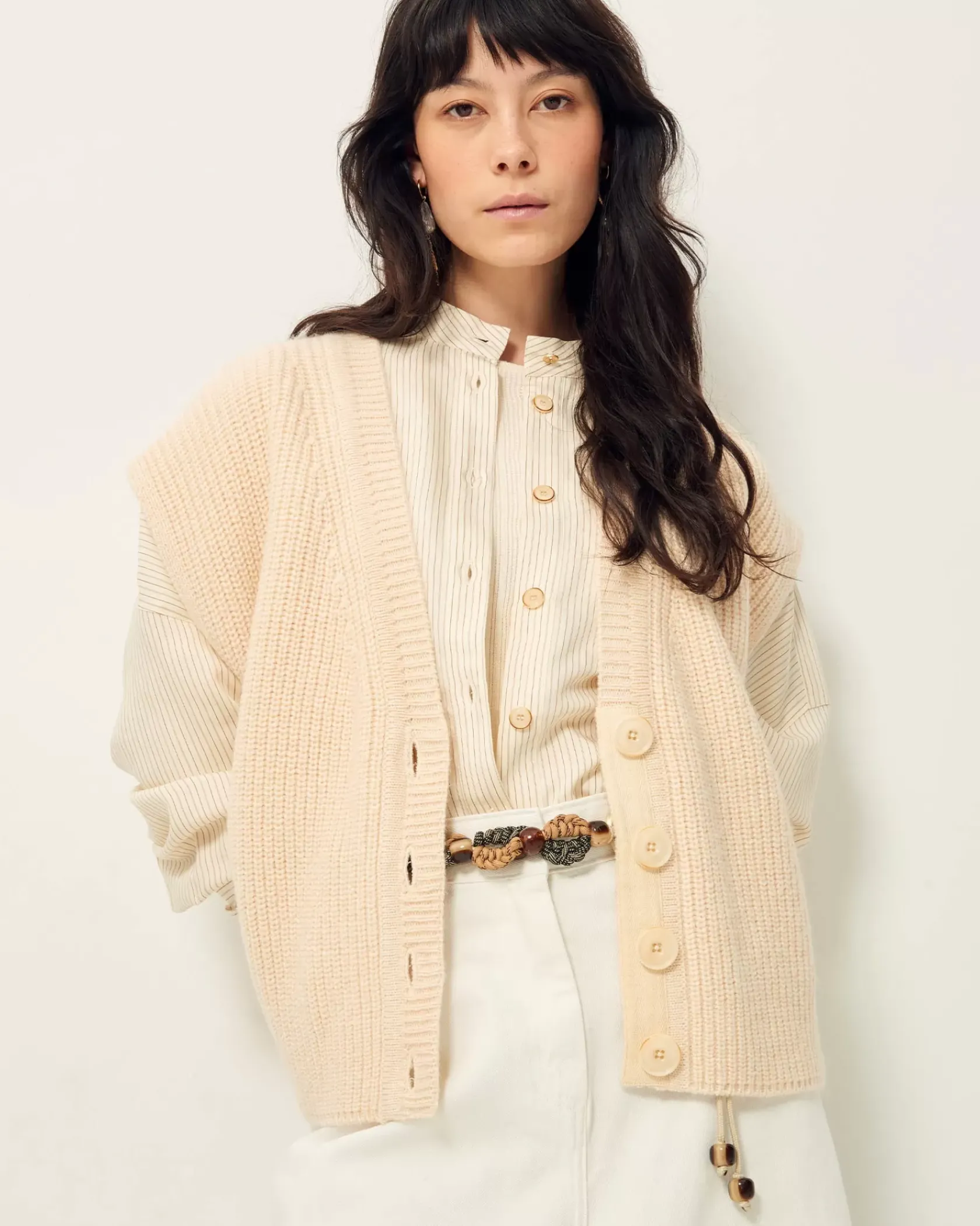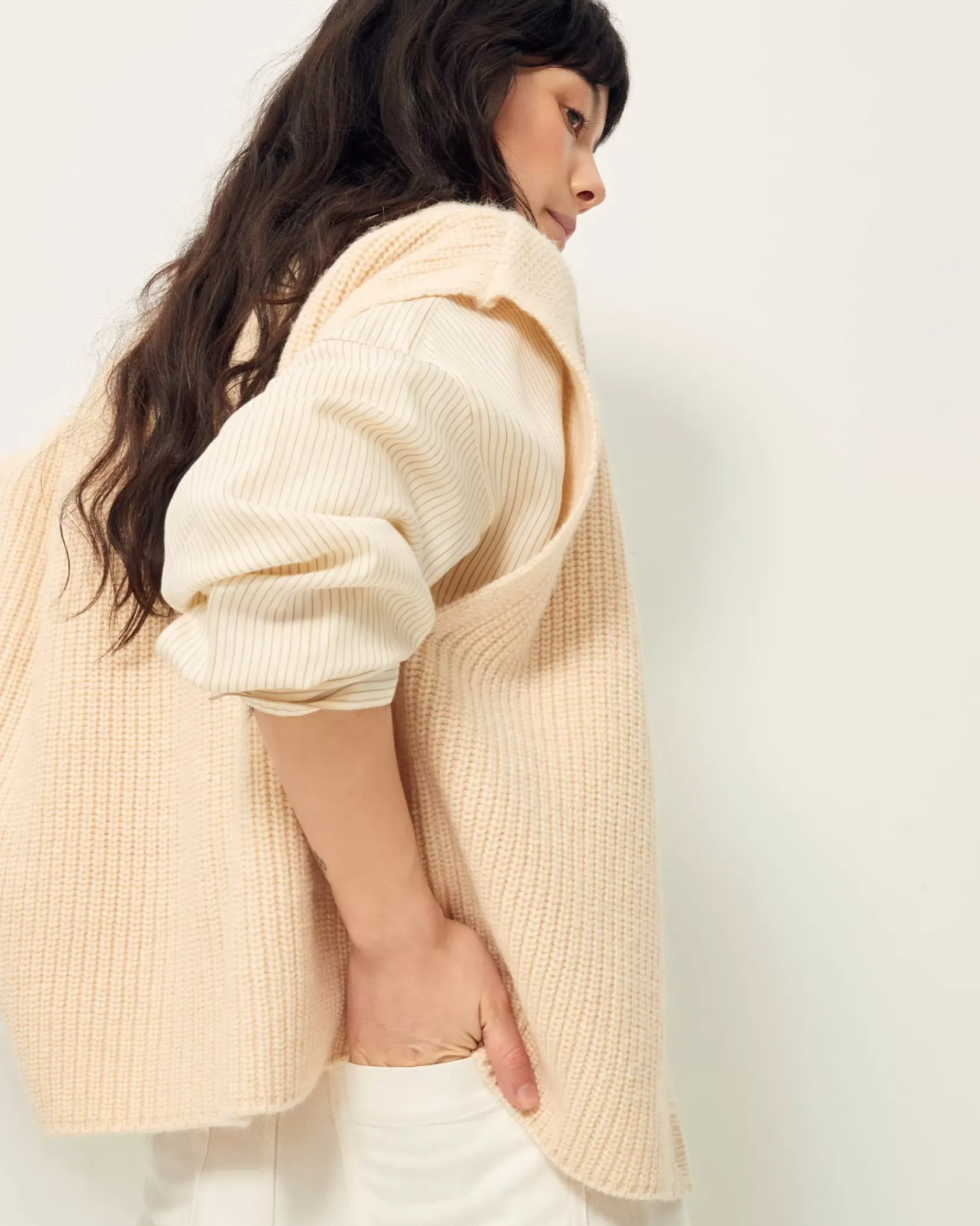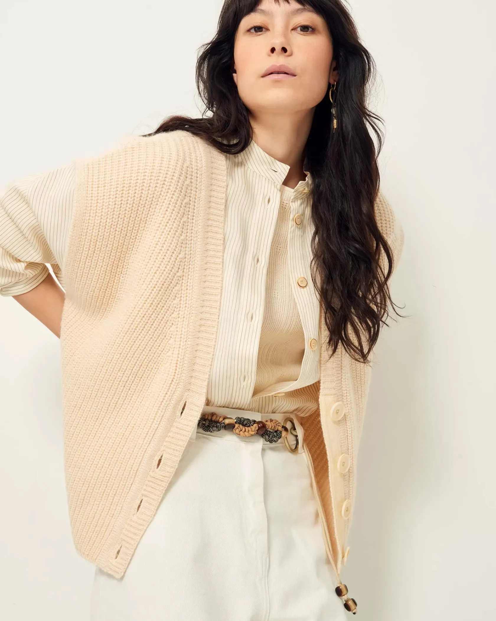 Cardigan sans manches oversize col V en côtes perlées grosse jauge maille duveteuse.