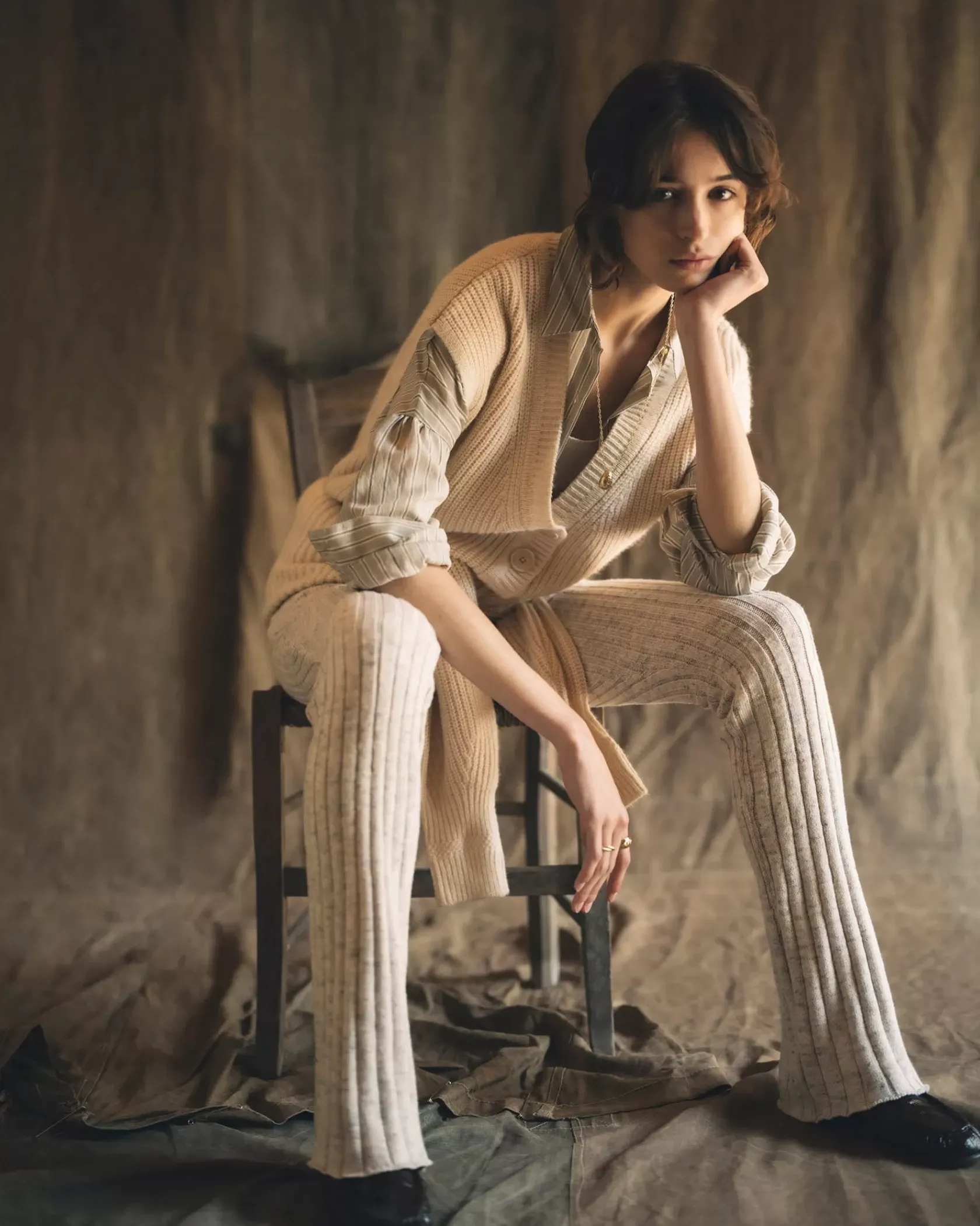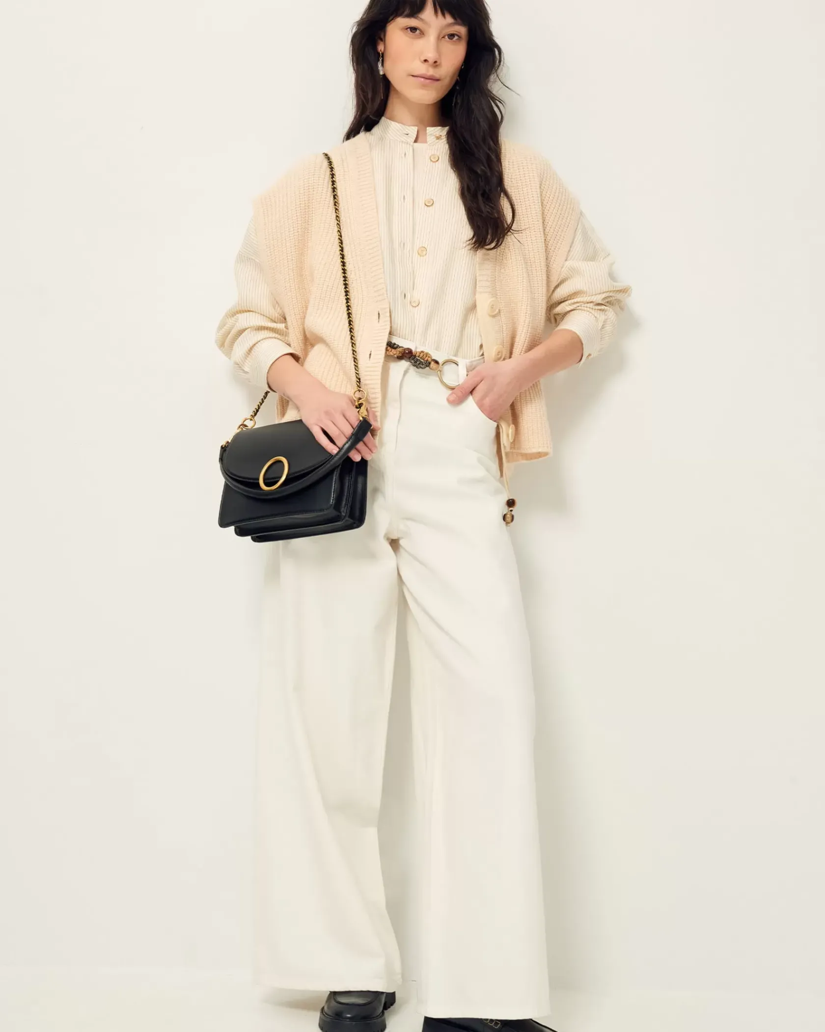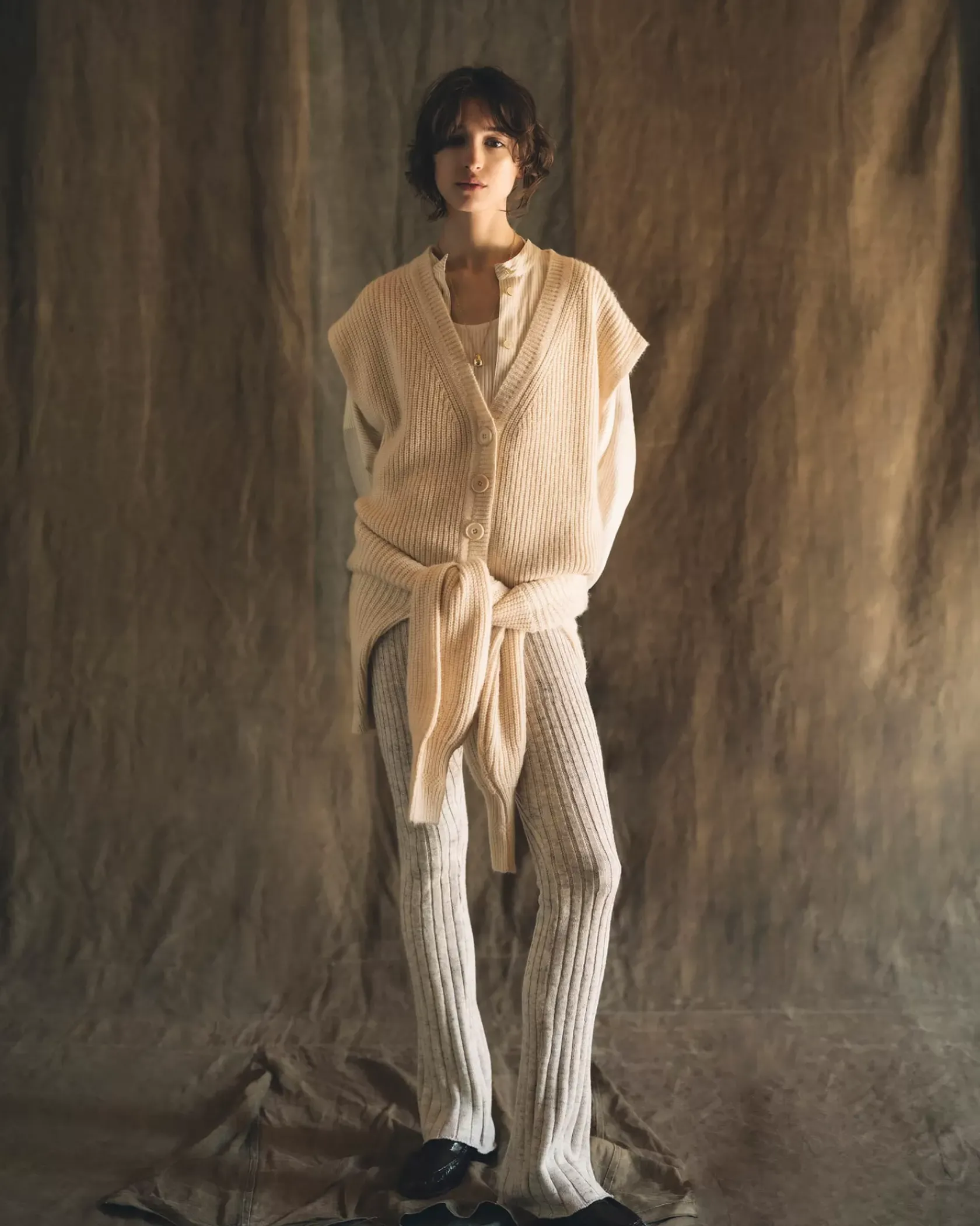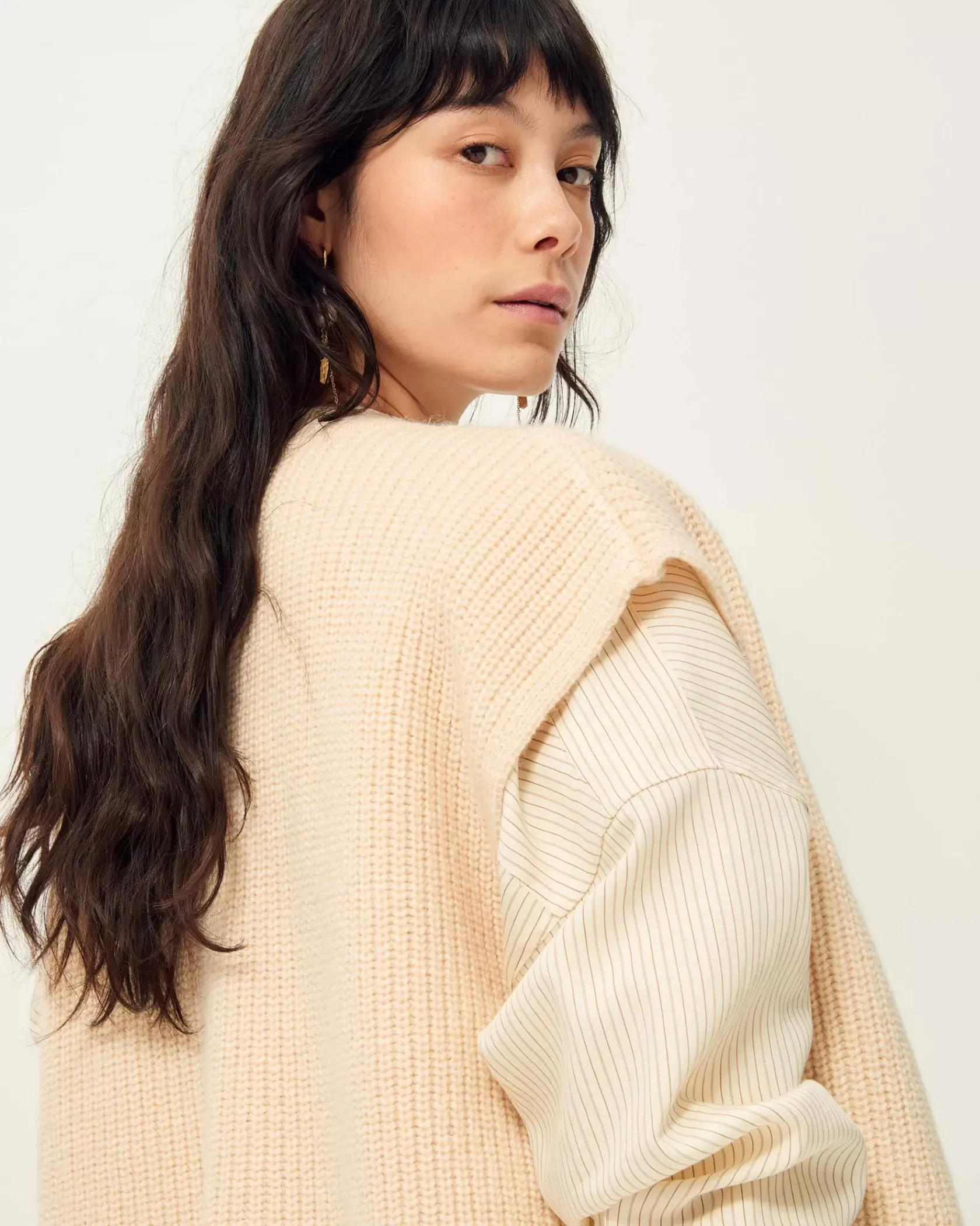 Cardigan sans manches oversize col V en côtes perlées grosse jauge maille duveteuse.