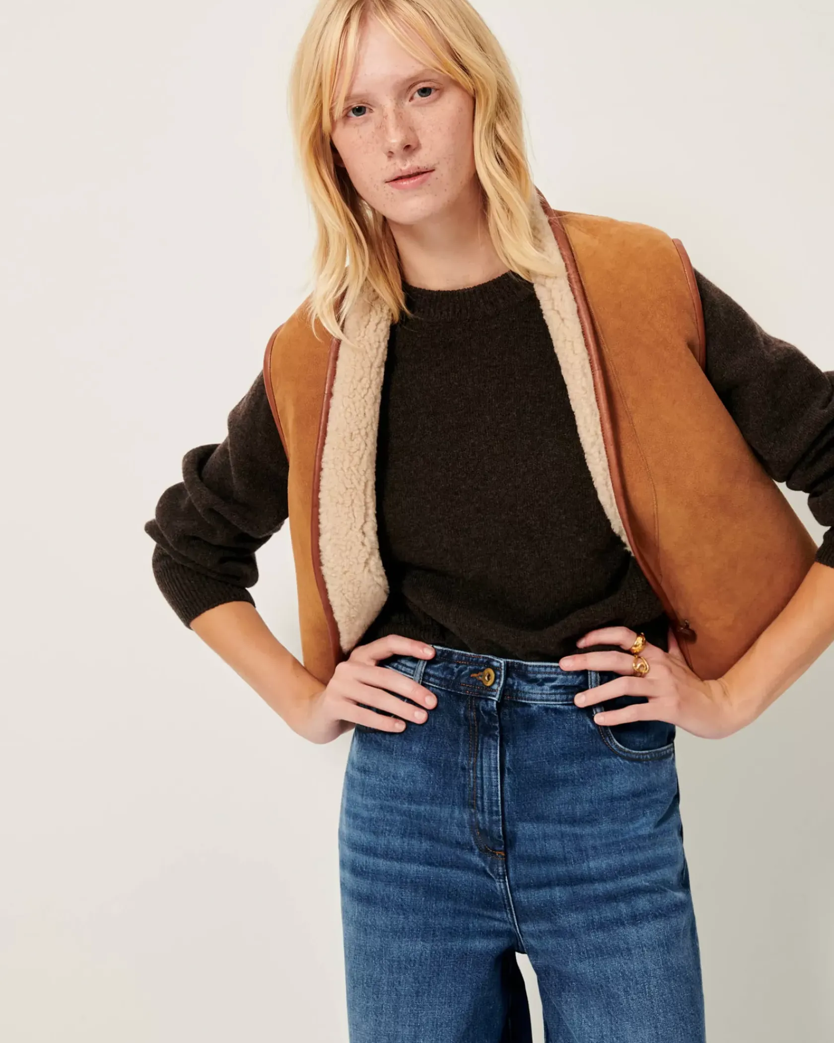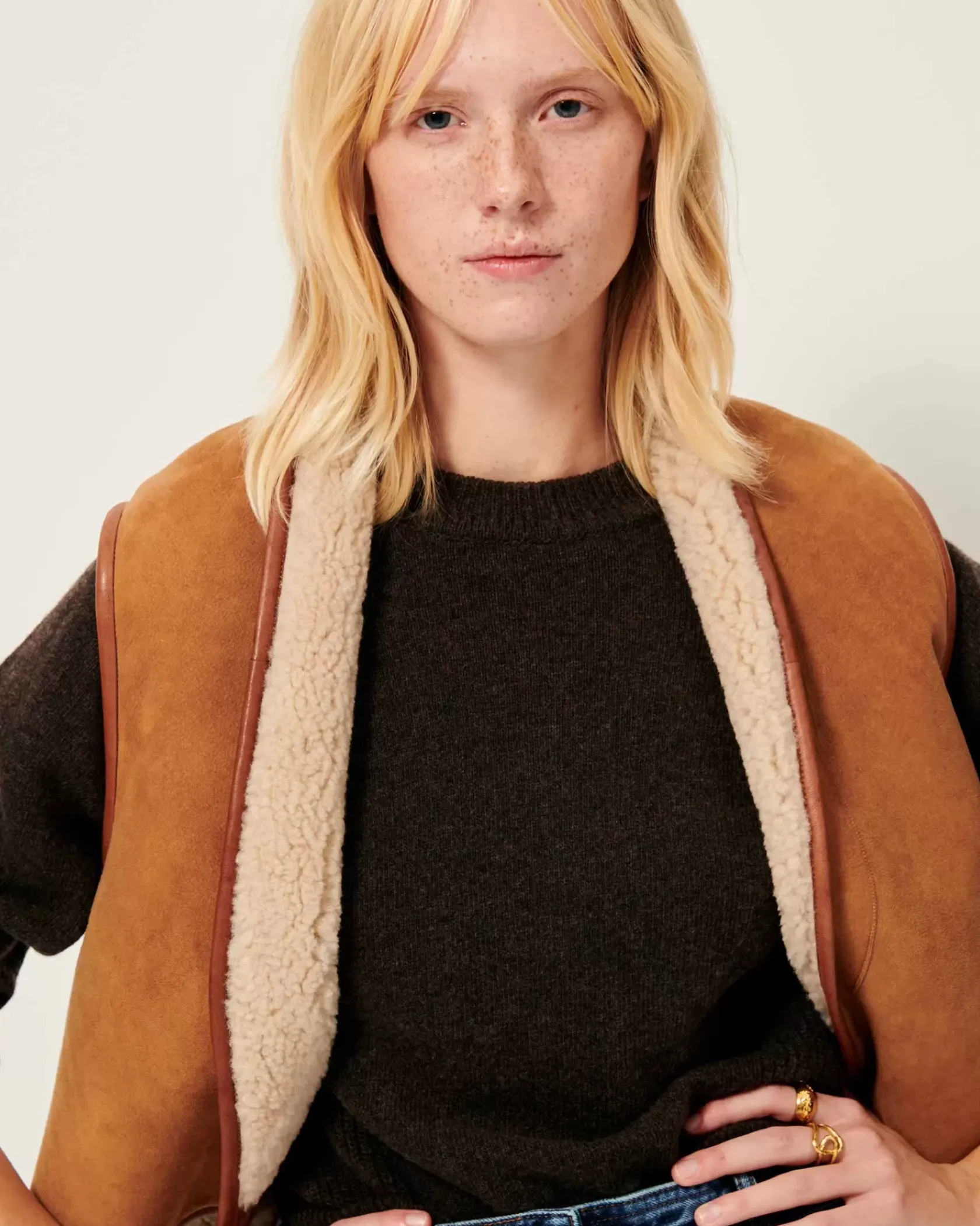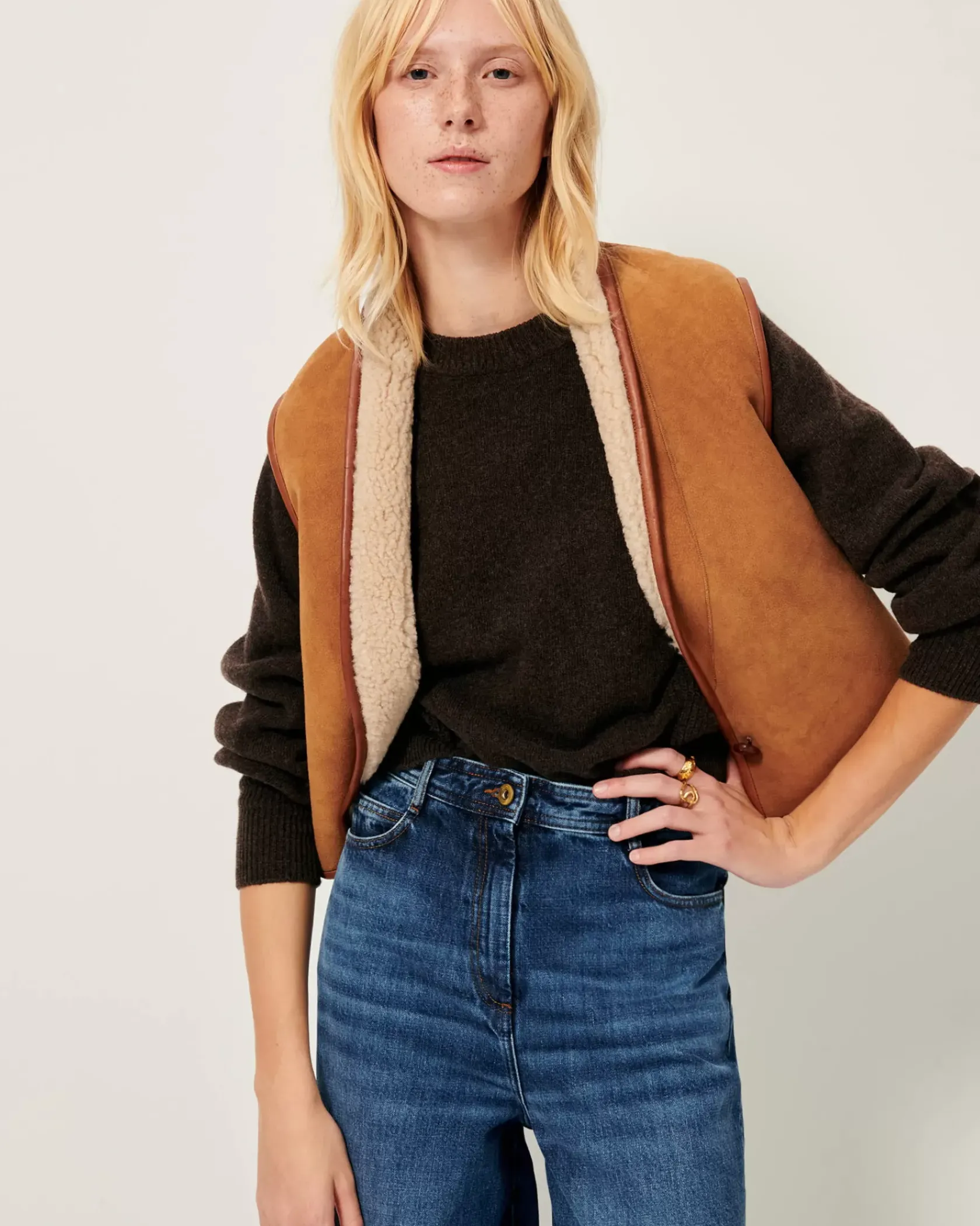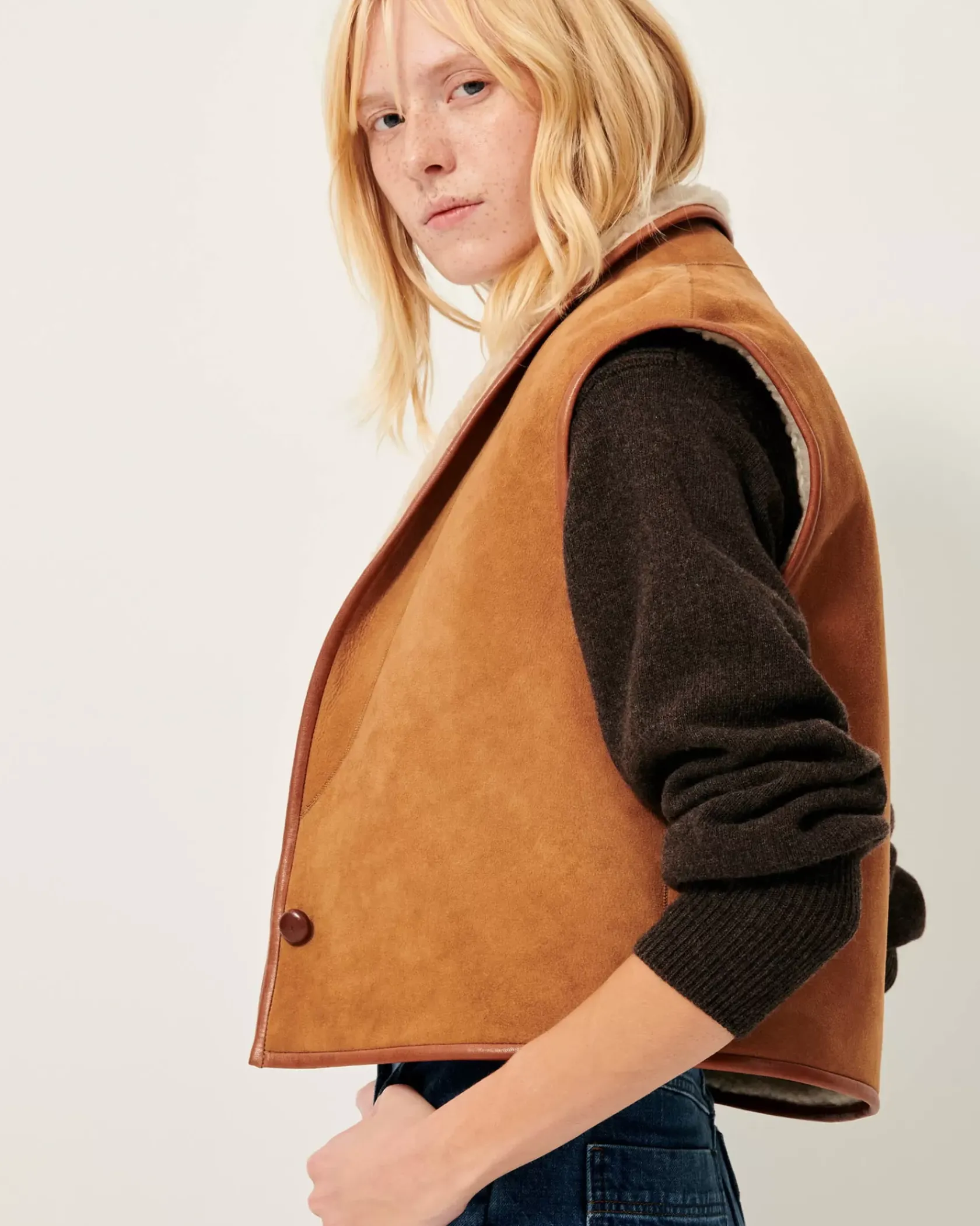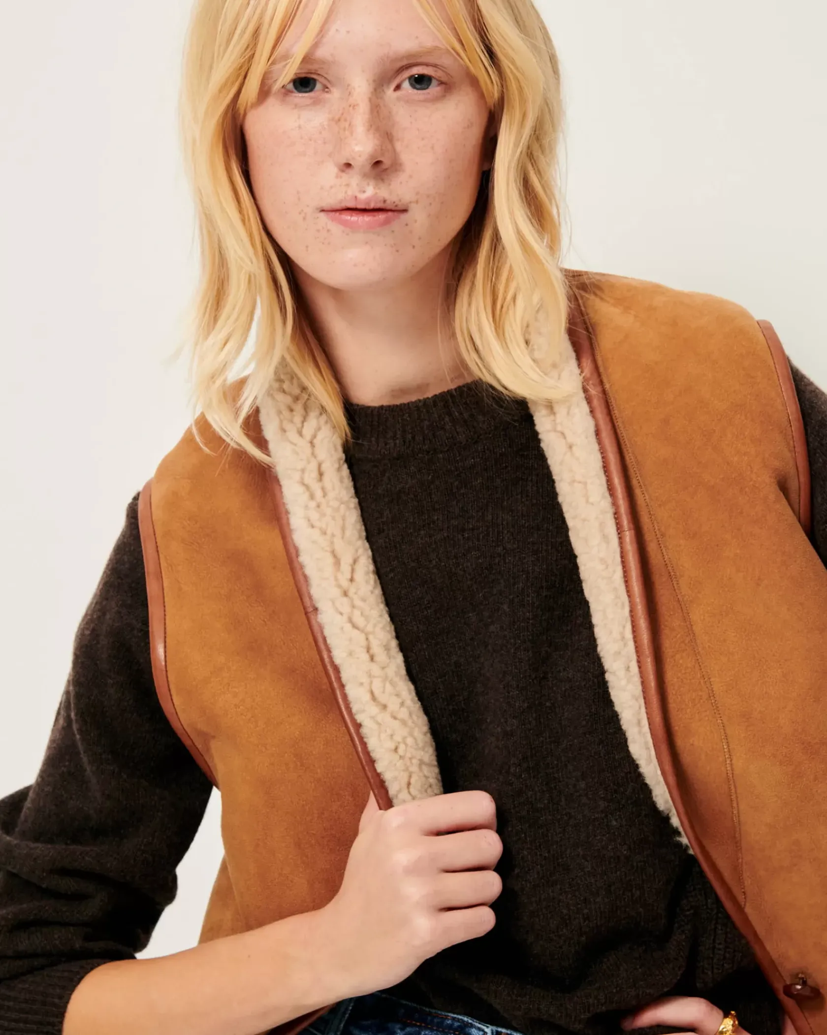 Veste sans manches réversible en peau lainée de mouton, biais contrasté en cuir d’agneau à tannage végétal.