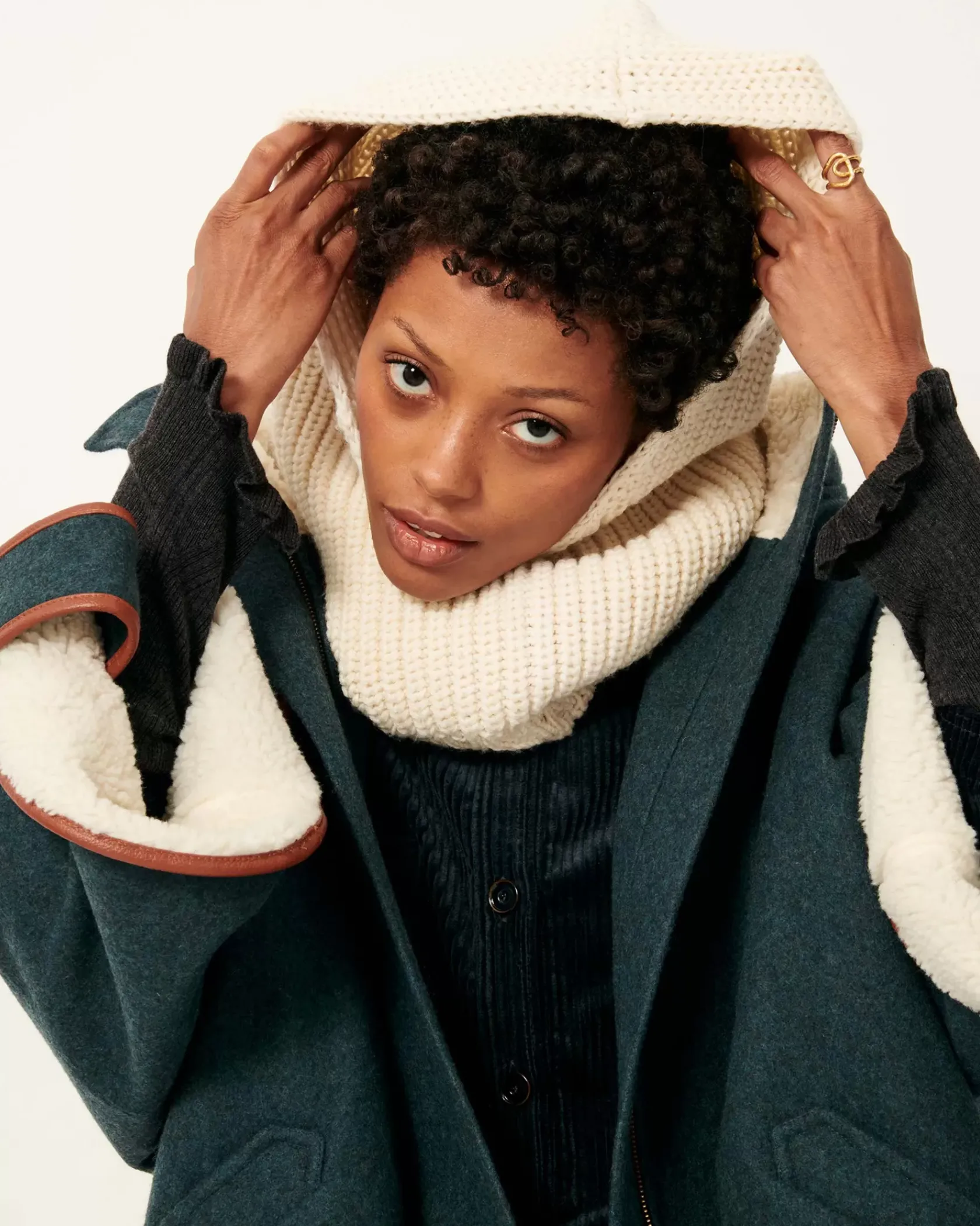 Cagoule en maille grosse jauge côtes perlées, tricotée en Italie.