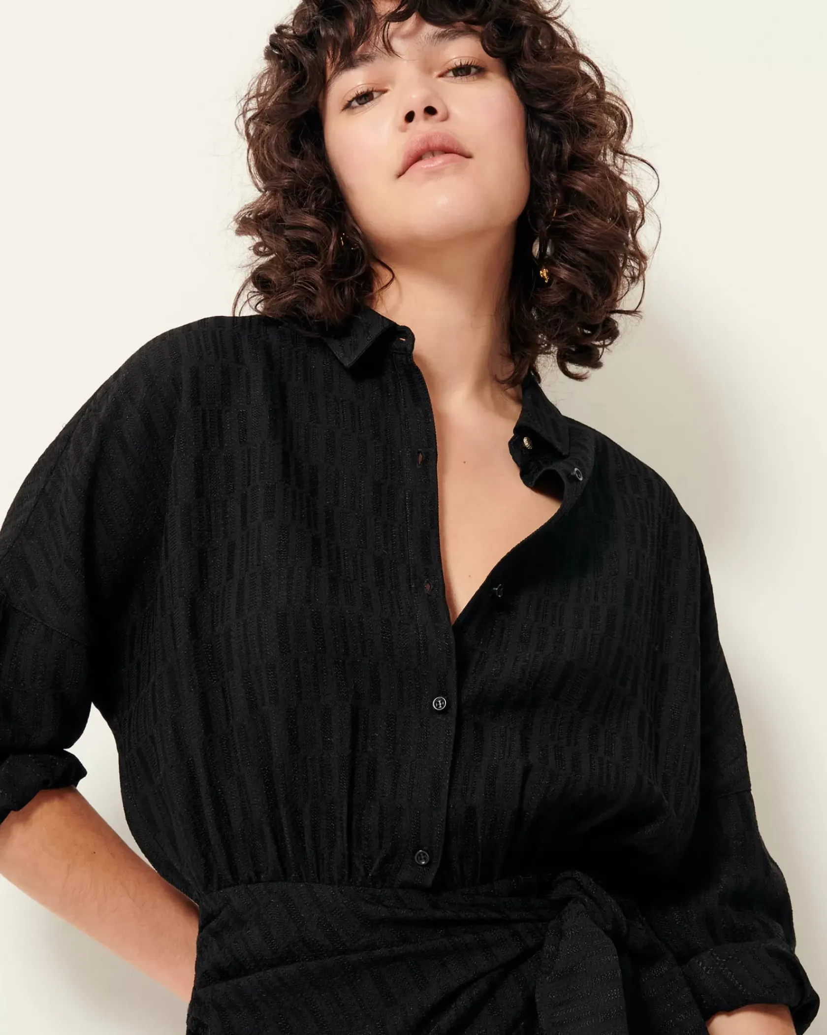 Robe courte chemisier nouée sur le bas en crêpon jacquard ton sur ton de viscose.