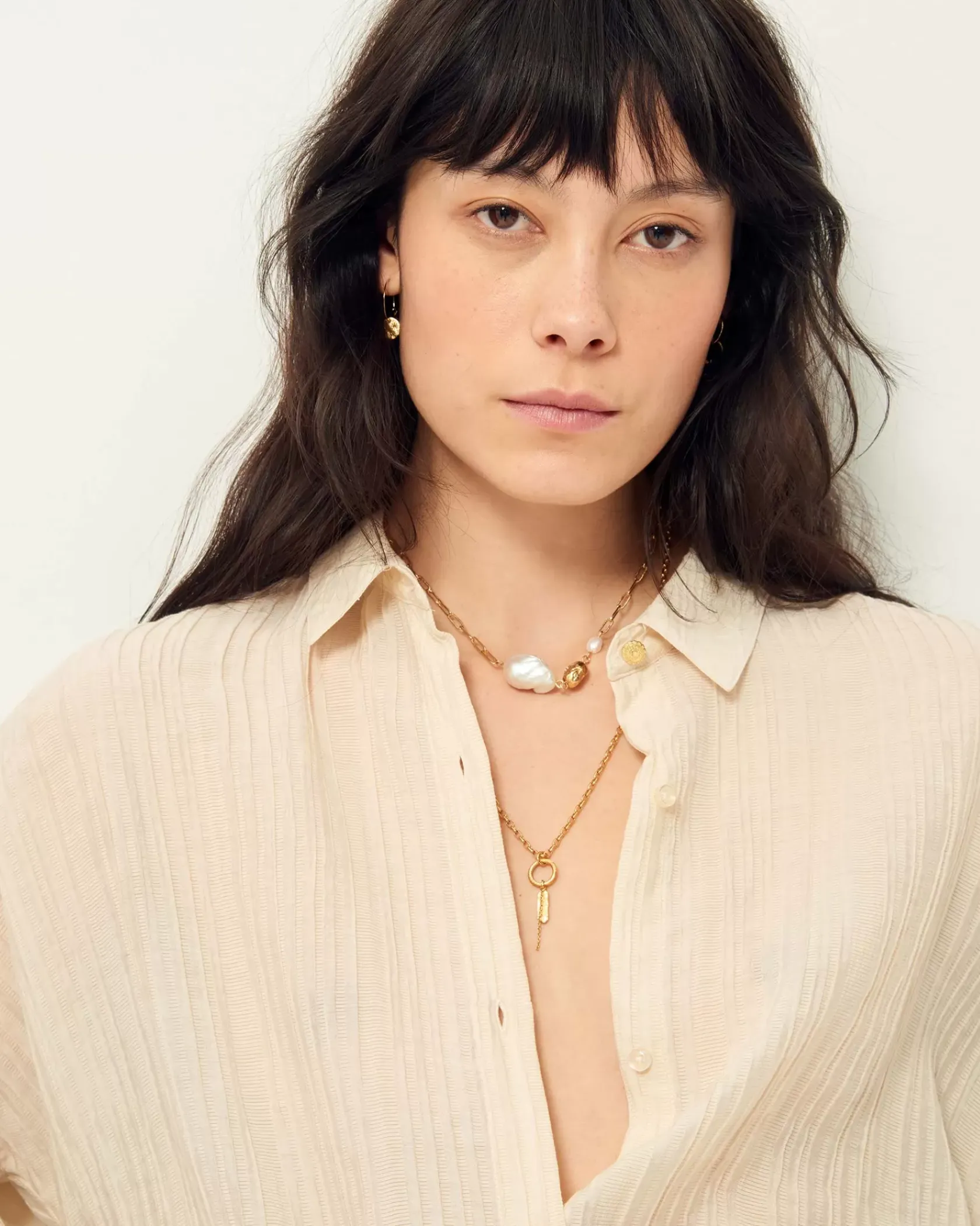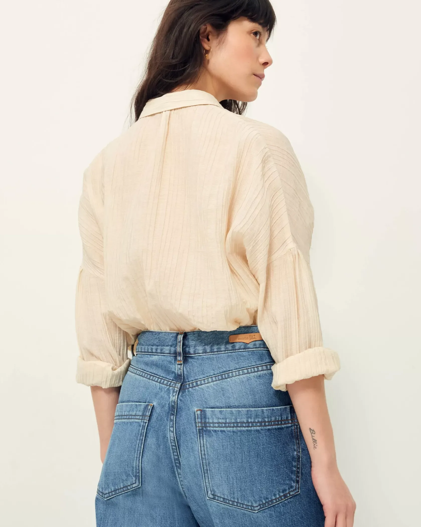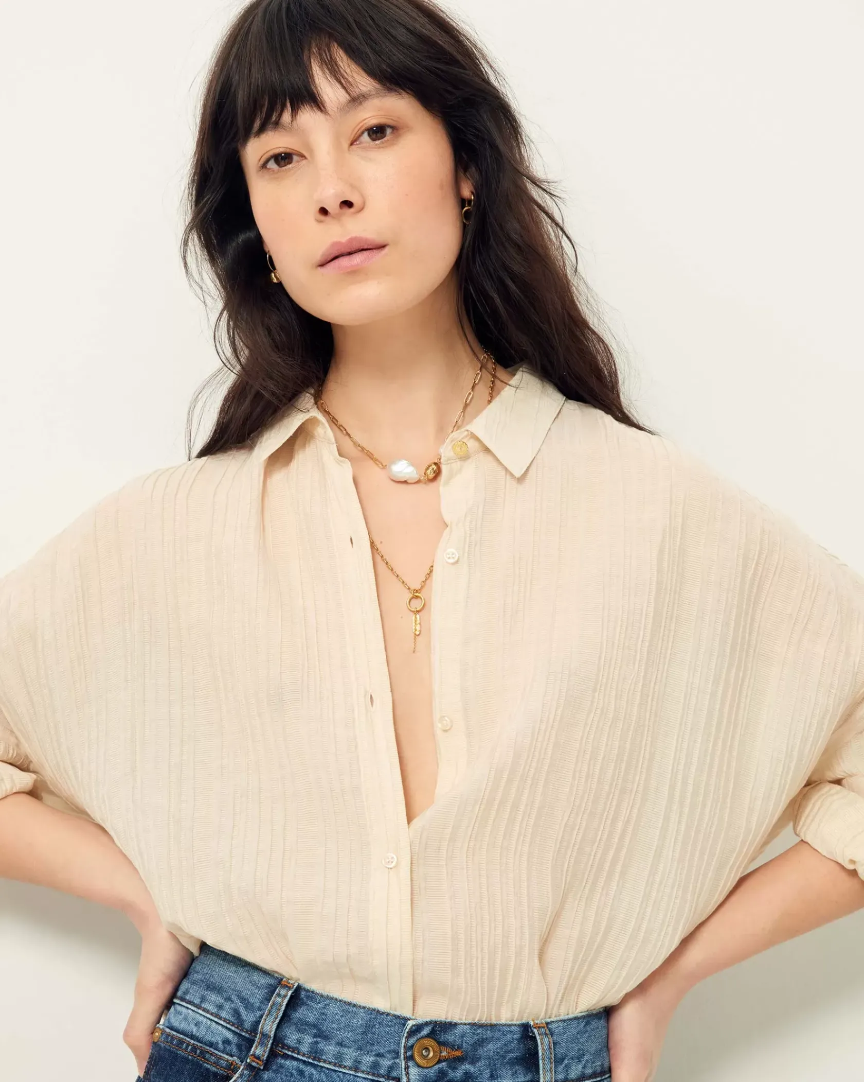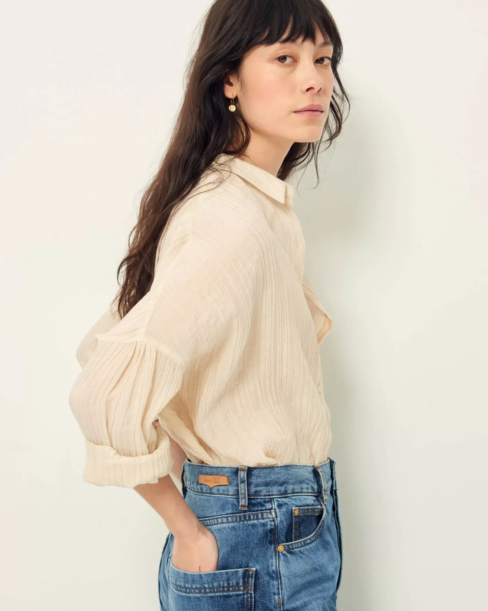 Chemise à emmanchures basses froncées en crépon à rayures ton sur ton à relief.