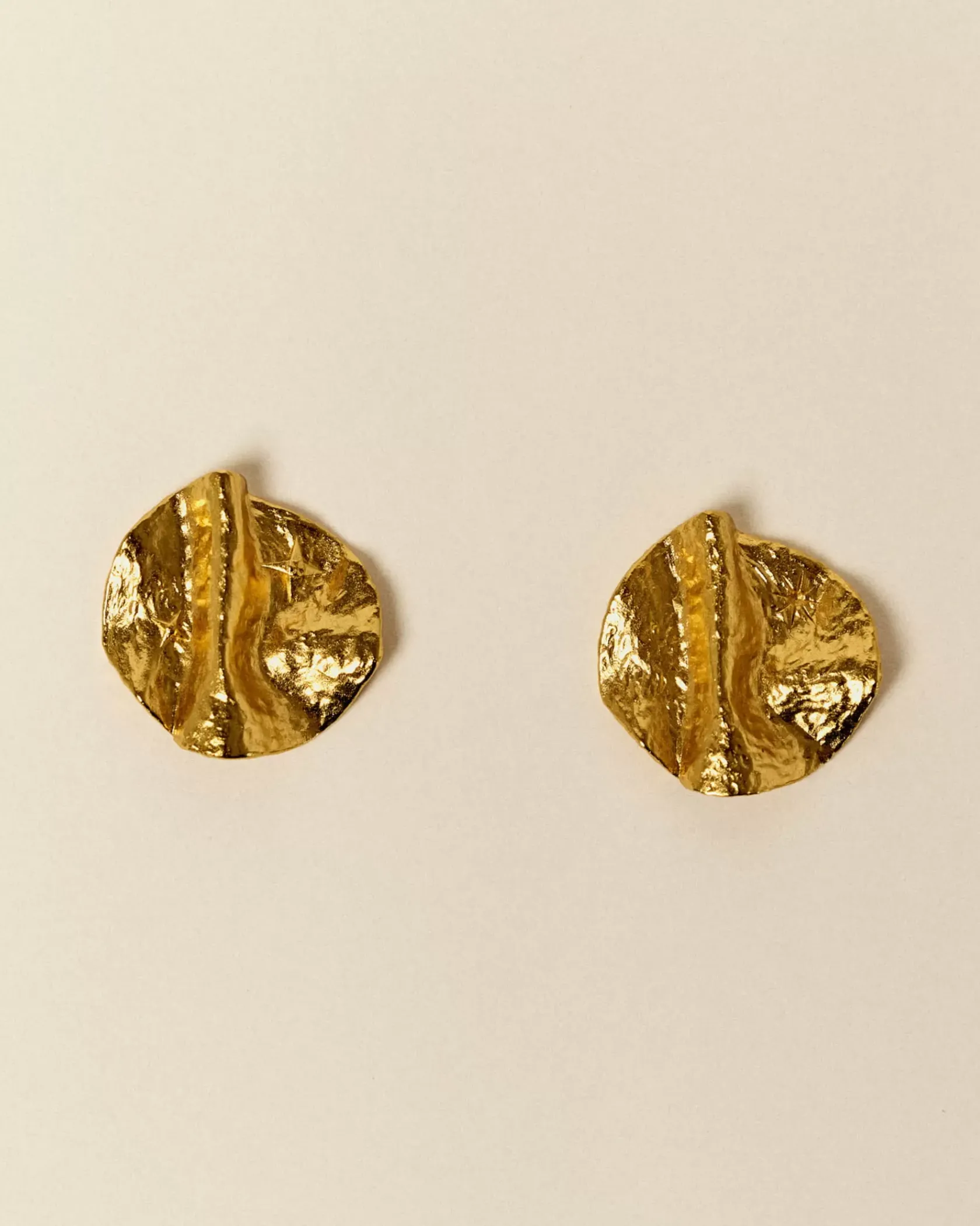Boucles d’oreilles pastilles finition dorée avec effet matiéré et reliefs étoilés.