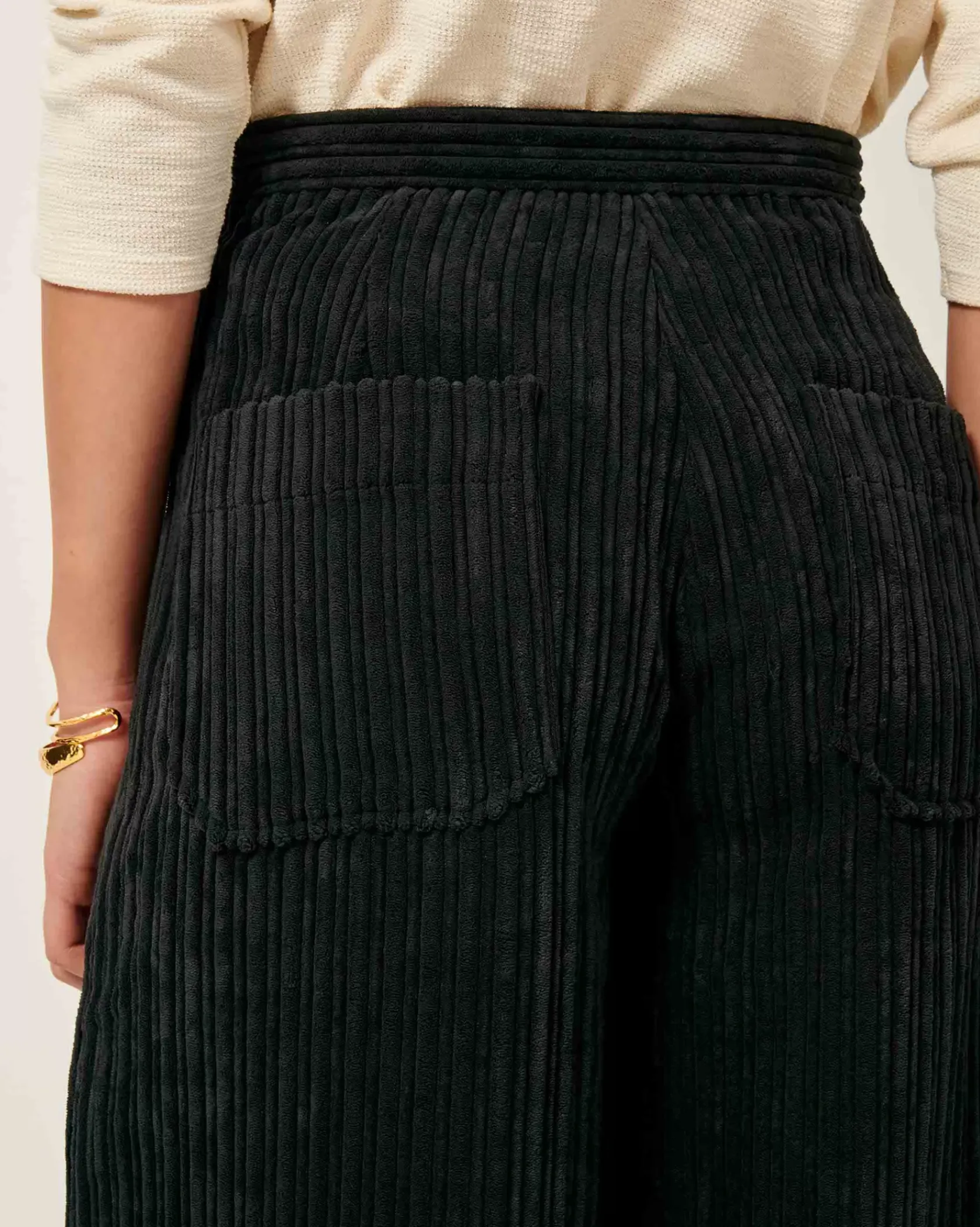 Pantalon ample taille haute en velours côtelé fluide à côtes irrégulières.
