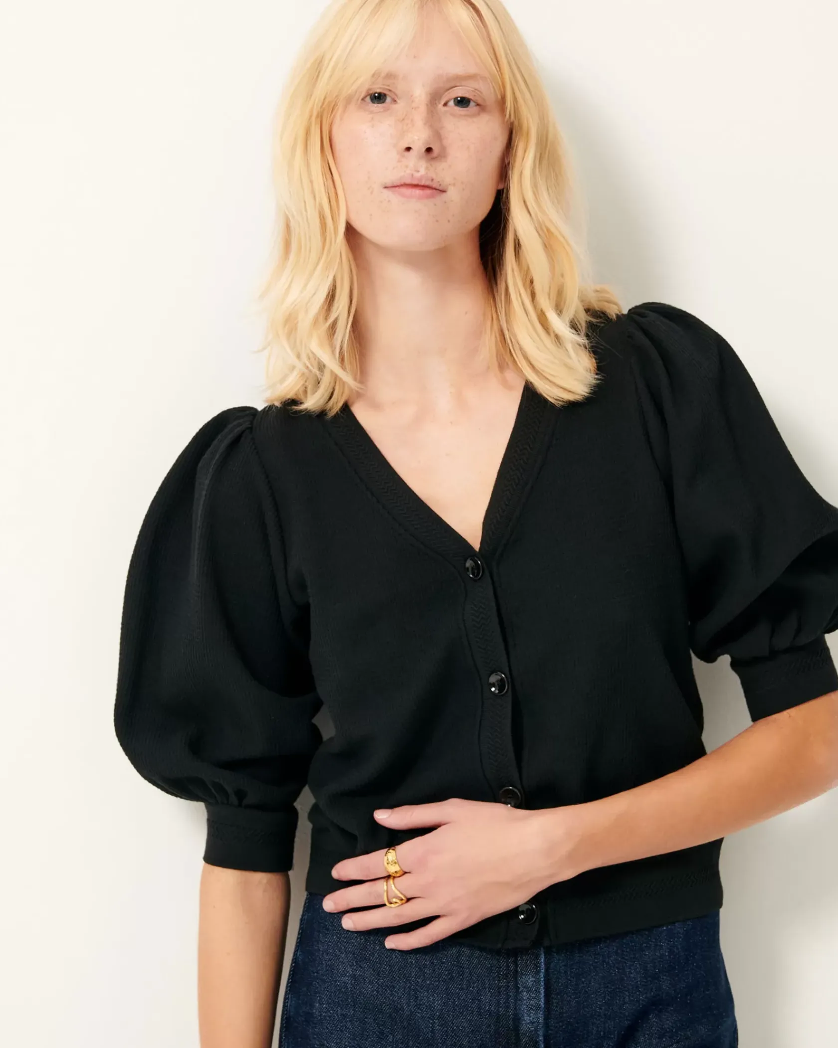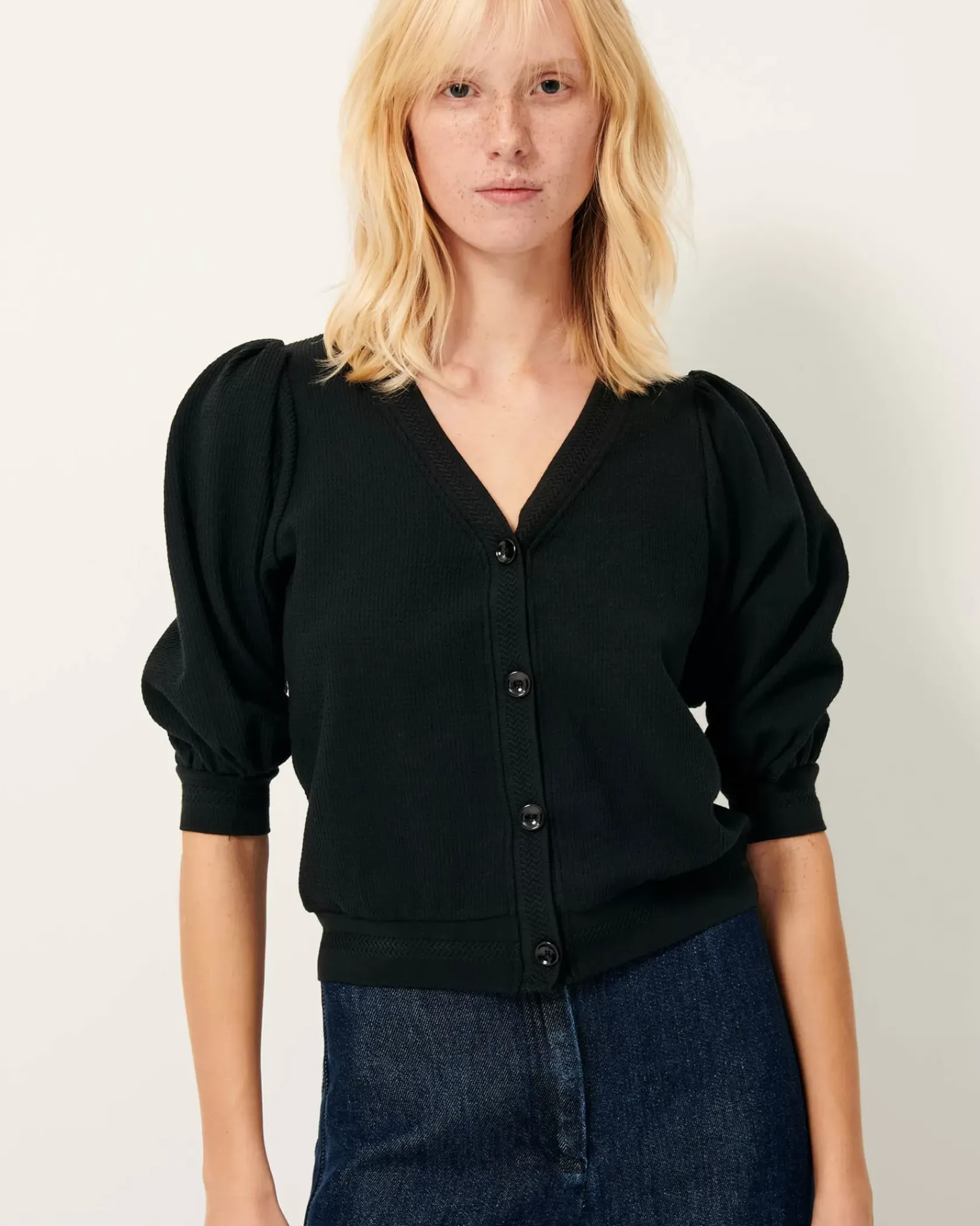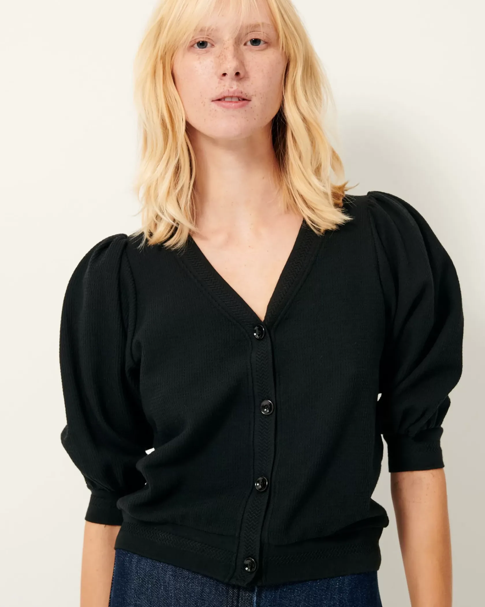 Cardigan en jersey lourd gaufré, effet nid d’abeille fantaisie, bords côtes fantaisie en détail.