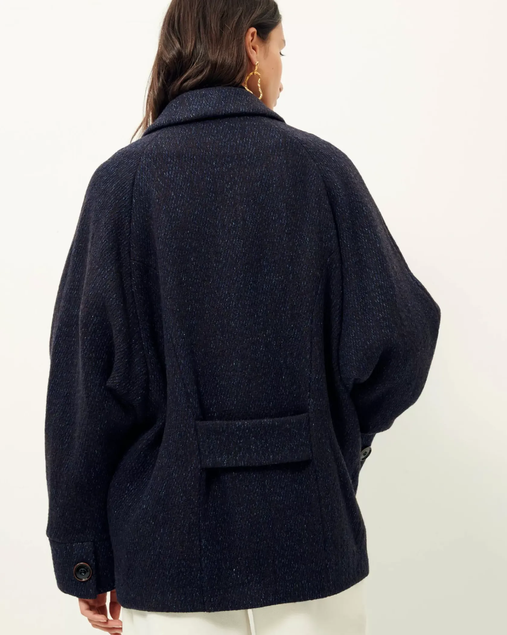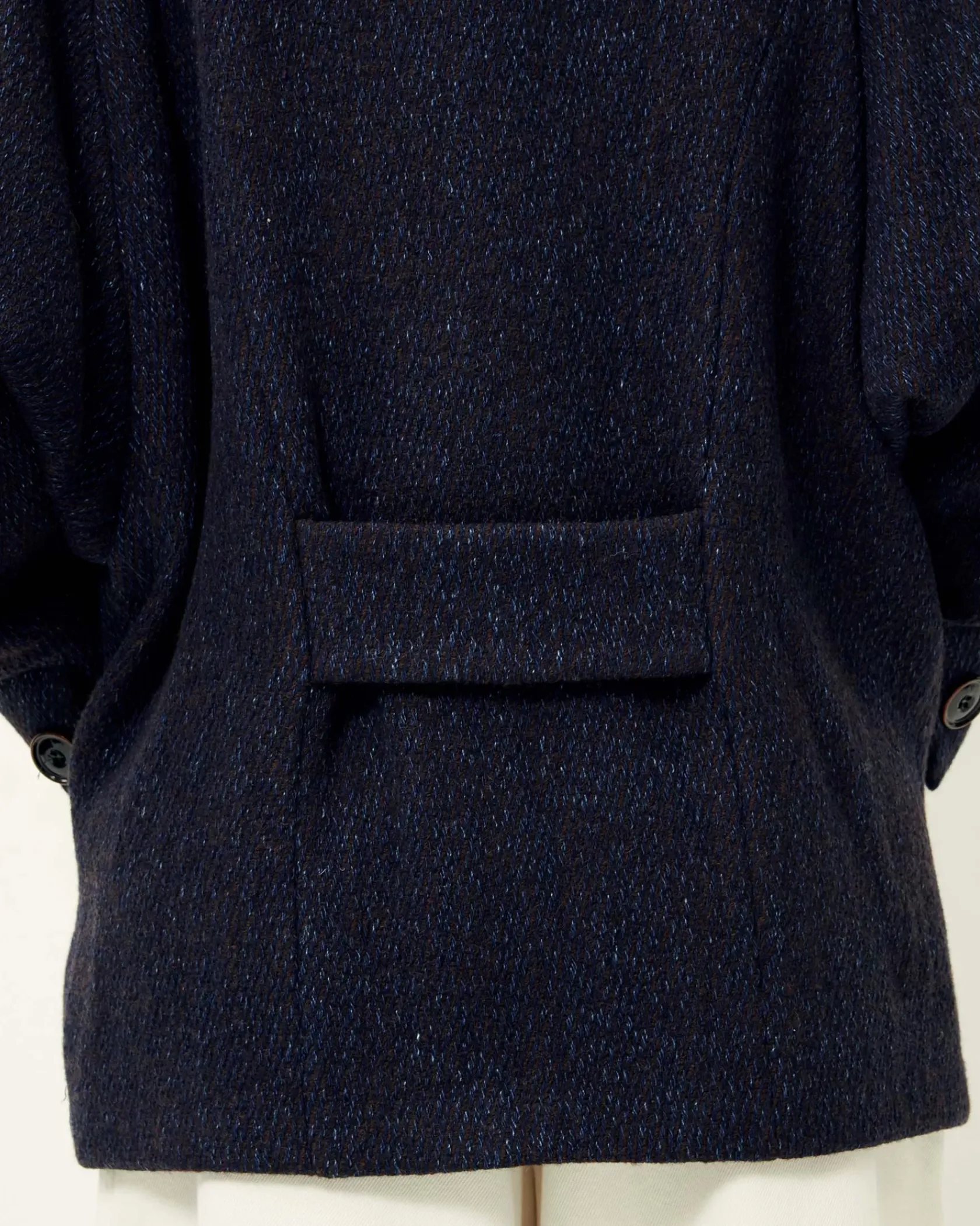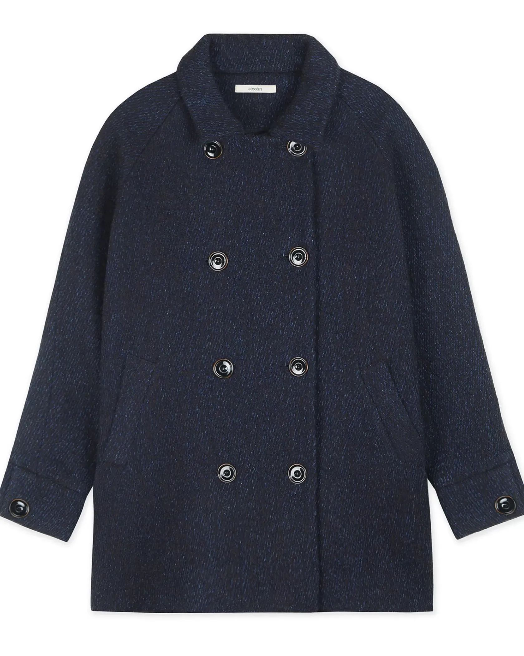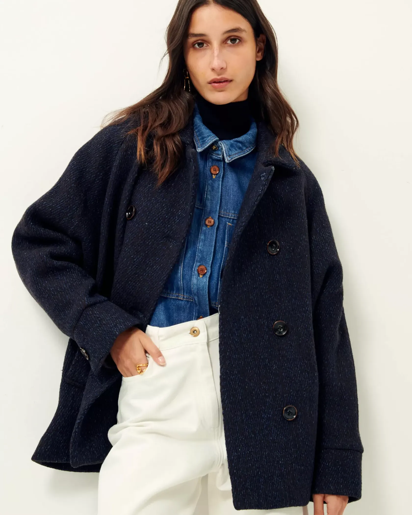 Caban à double boutonnage en whipcord lourd de fils bouclés et fils chinés esprit denim tissé en Italie.