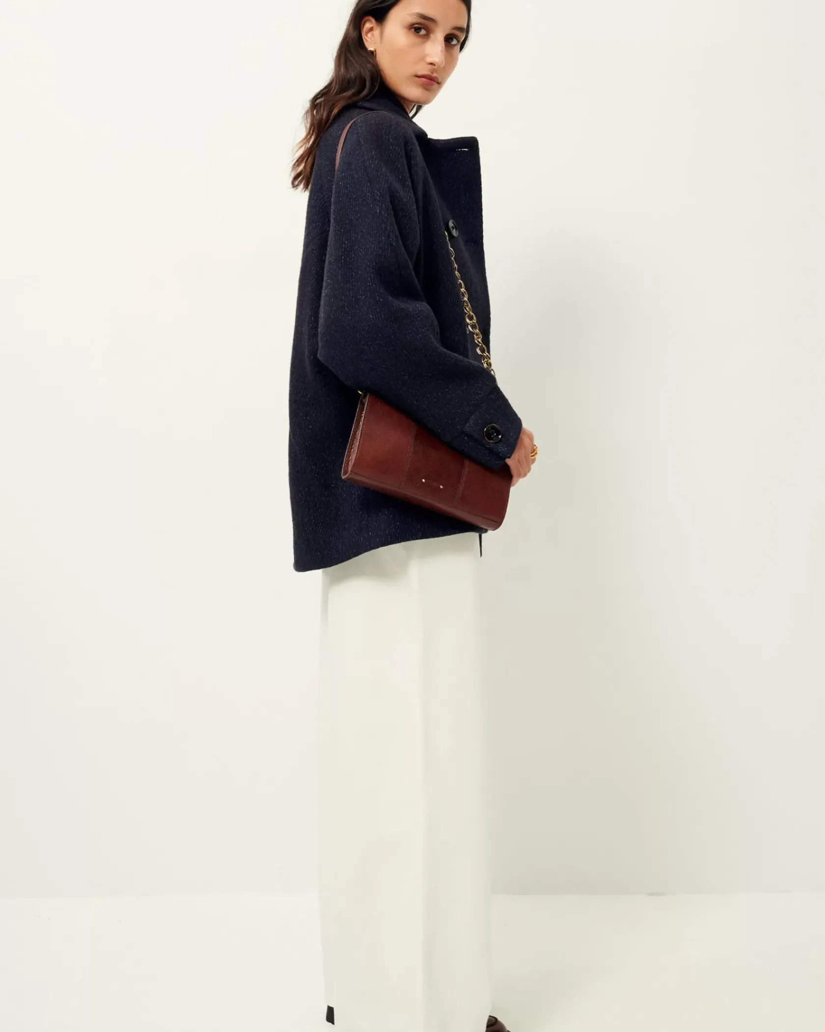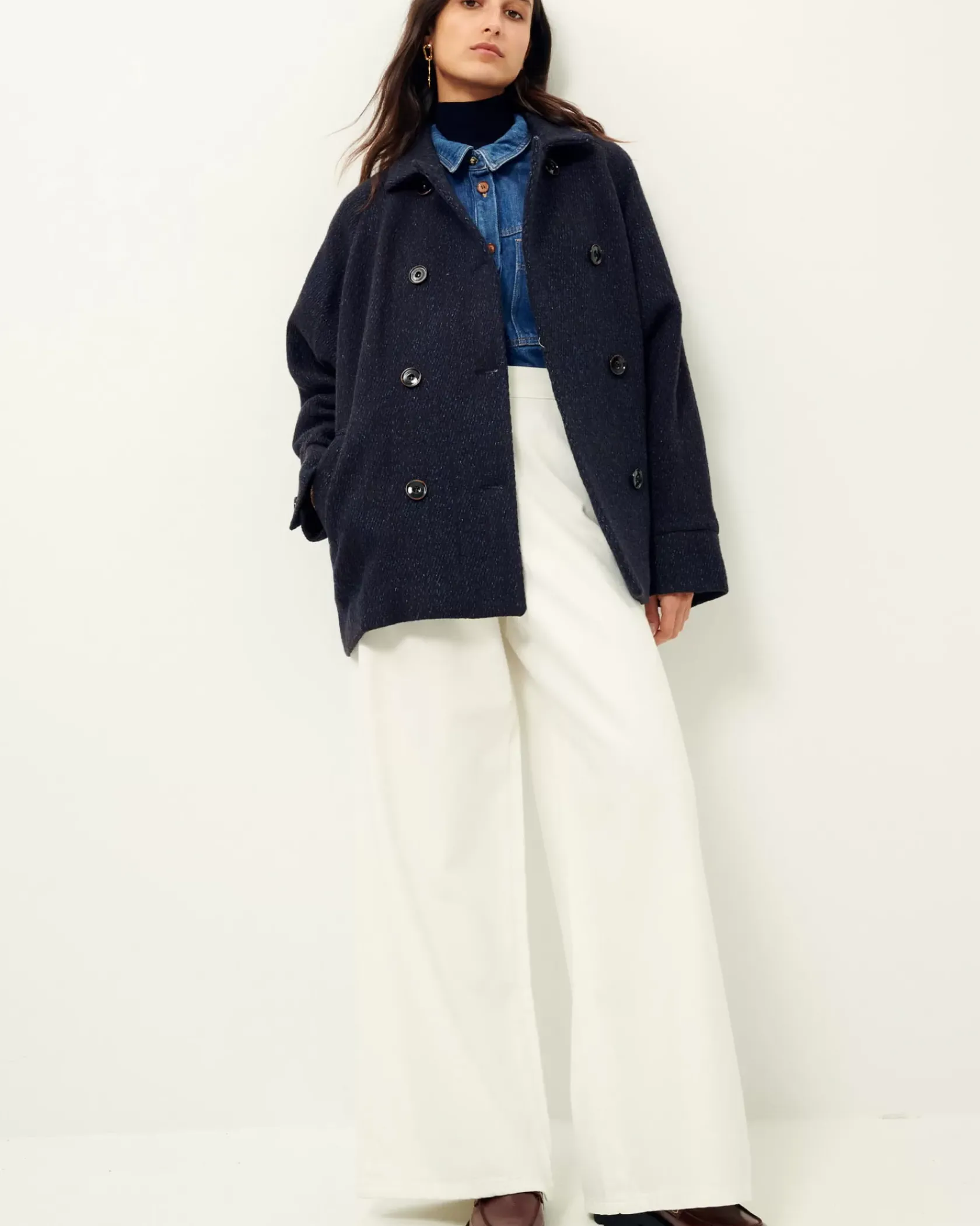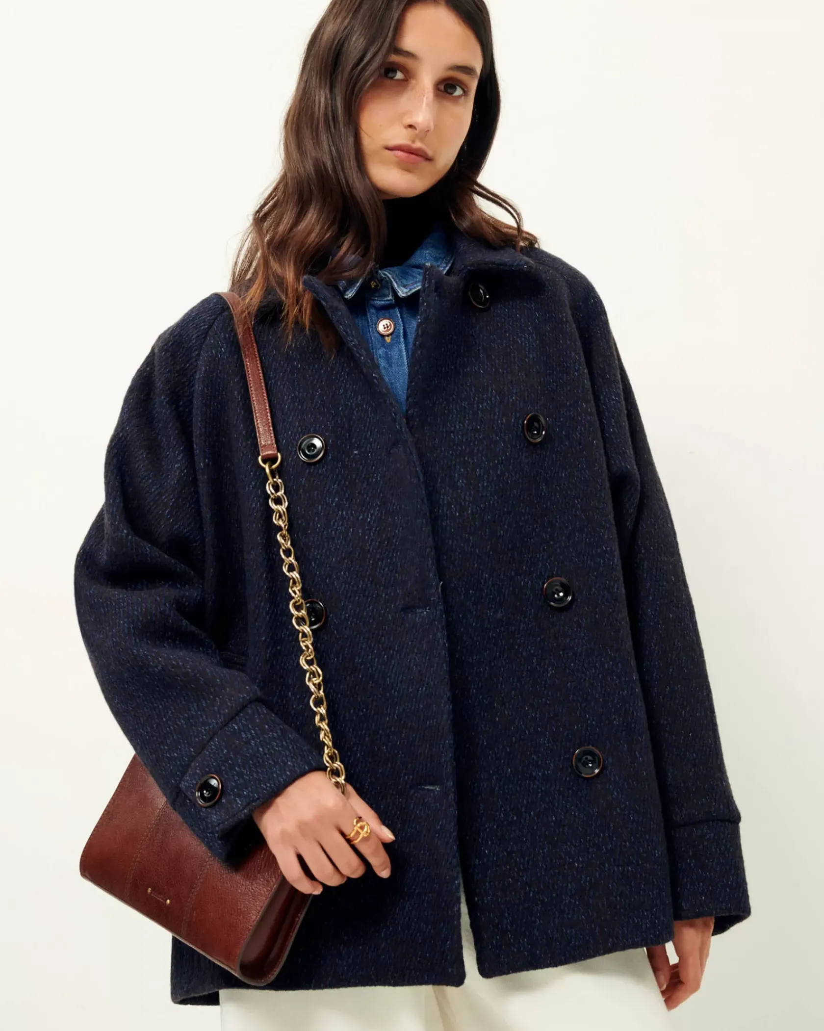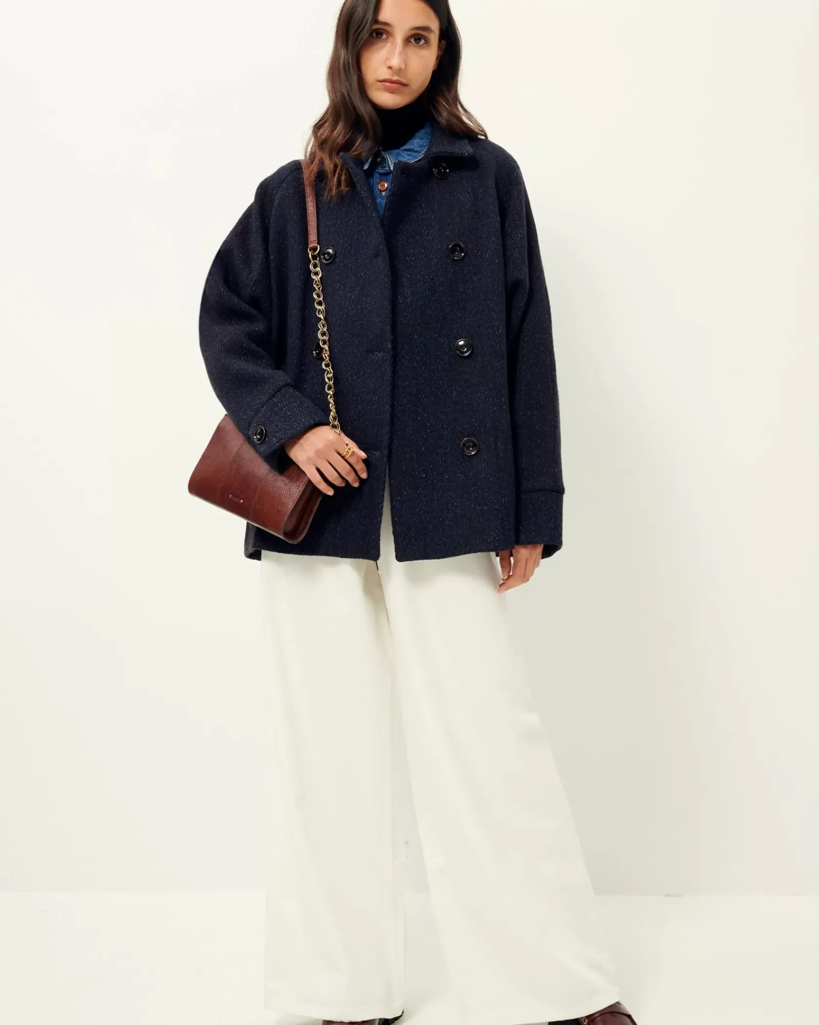 Caban à double boutonnage en whipcord lourd de fils bouclés et fils chinés esprit denim tissé en Italie.