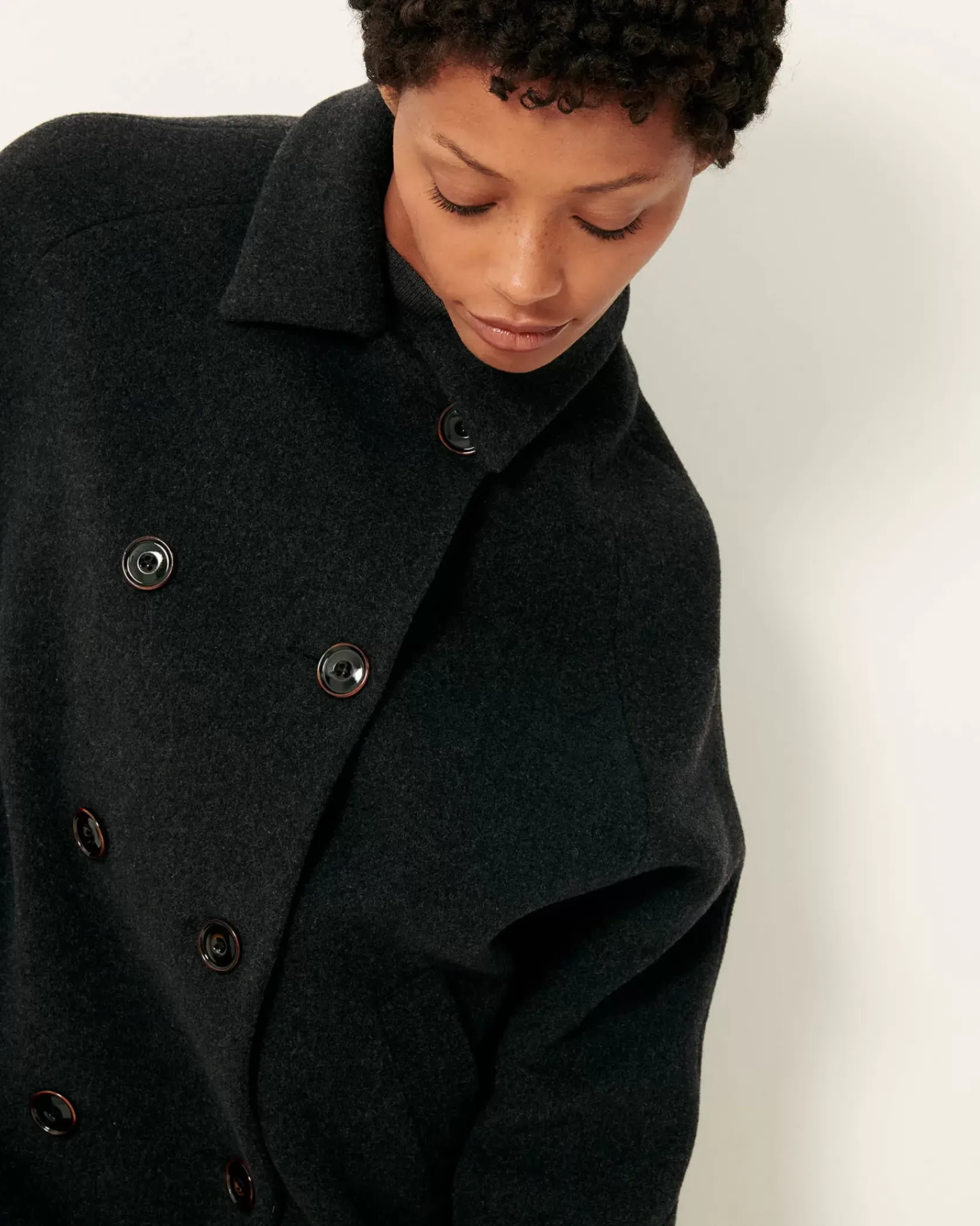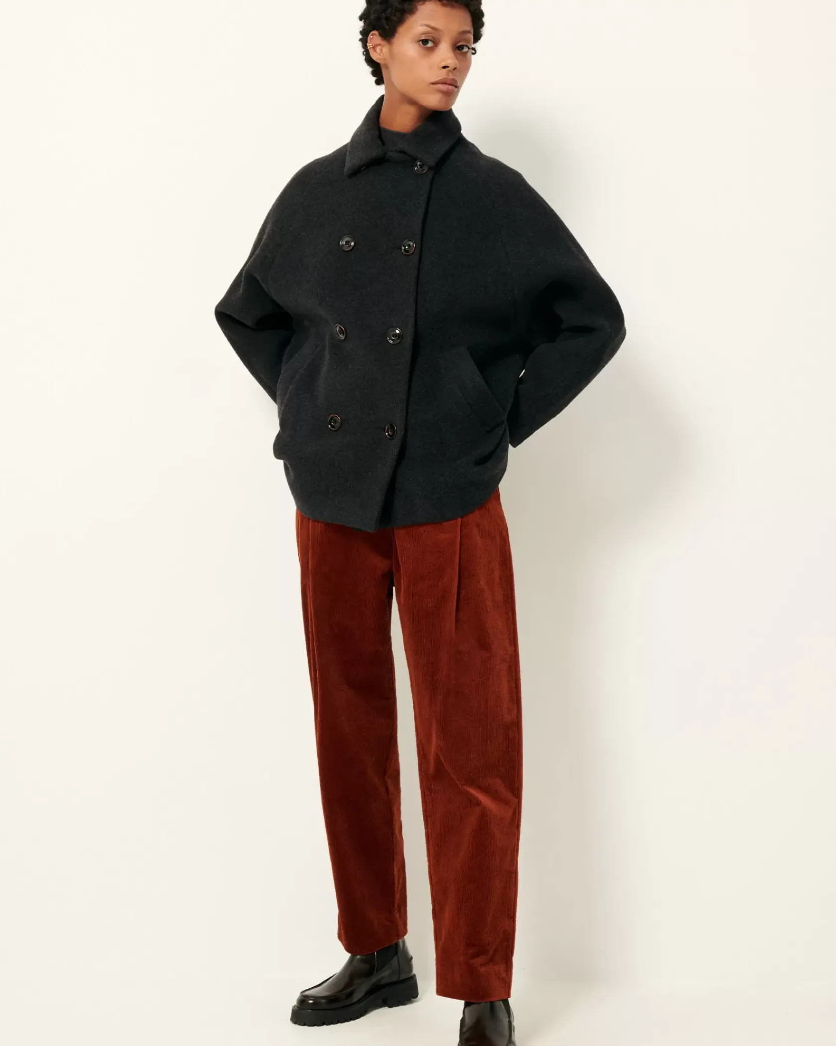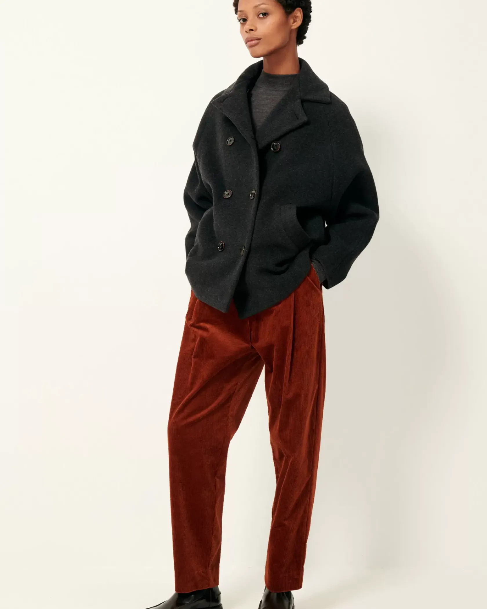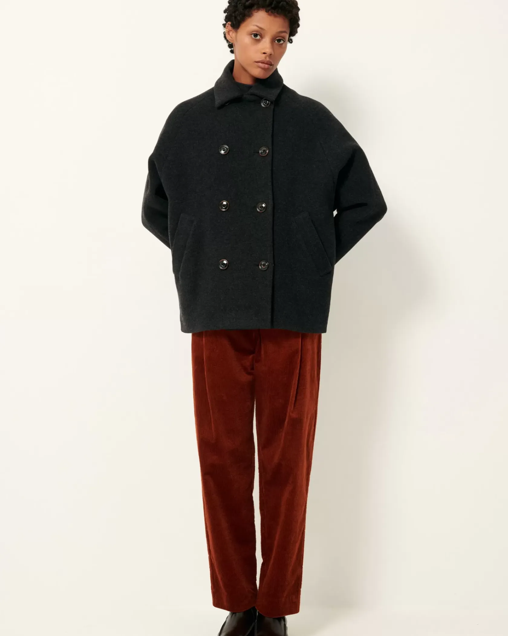 Caban à double boutonnage en flanelle double tissage finition velvet tissée en Italie.