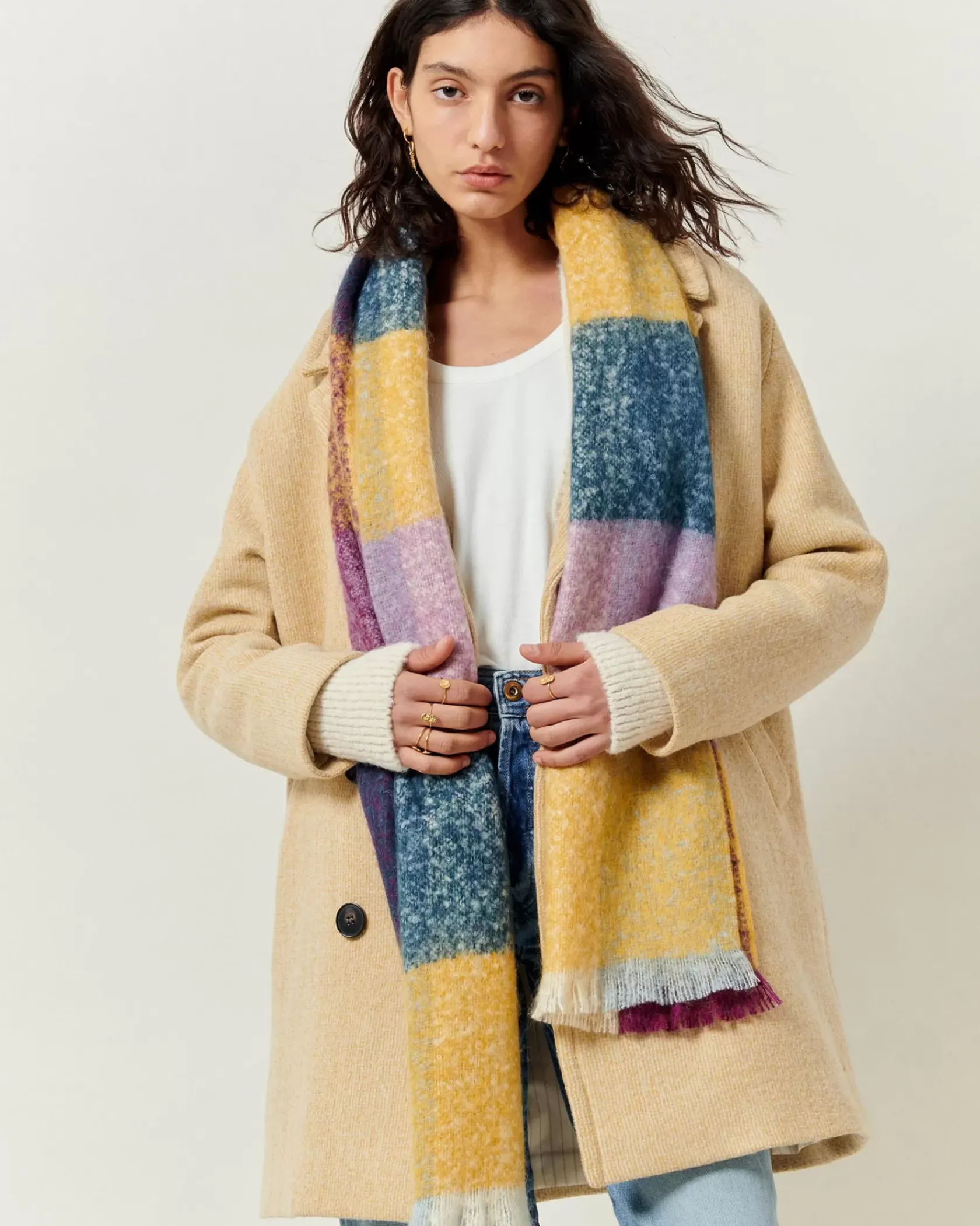 Echarpe large à carreaux fantaisie tissée en France.