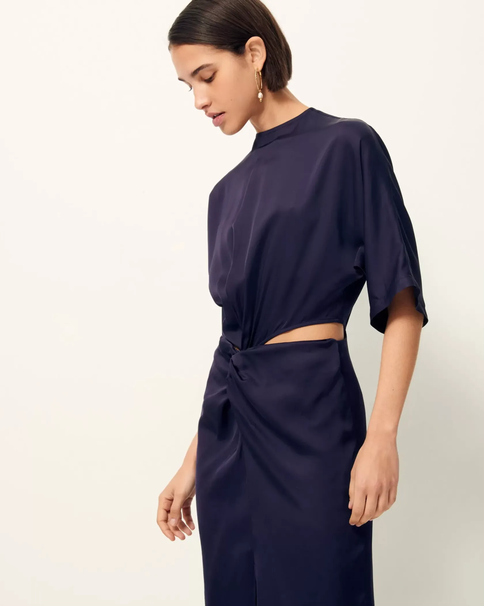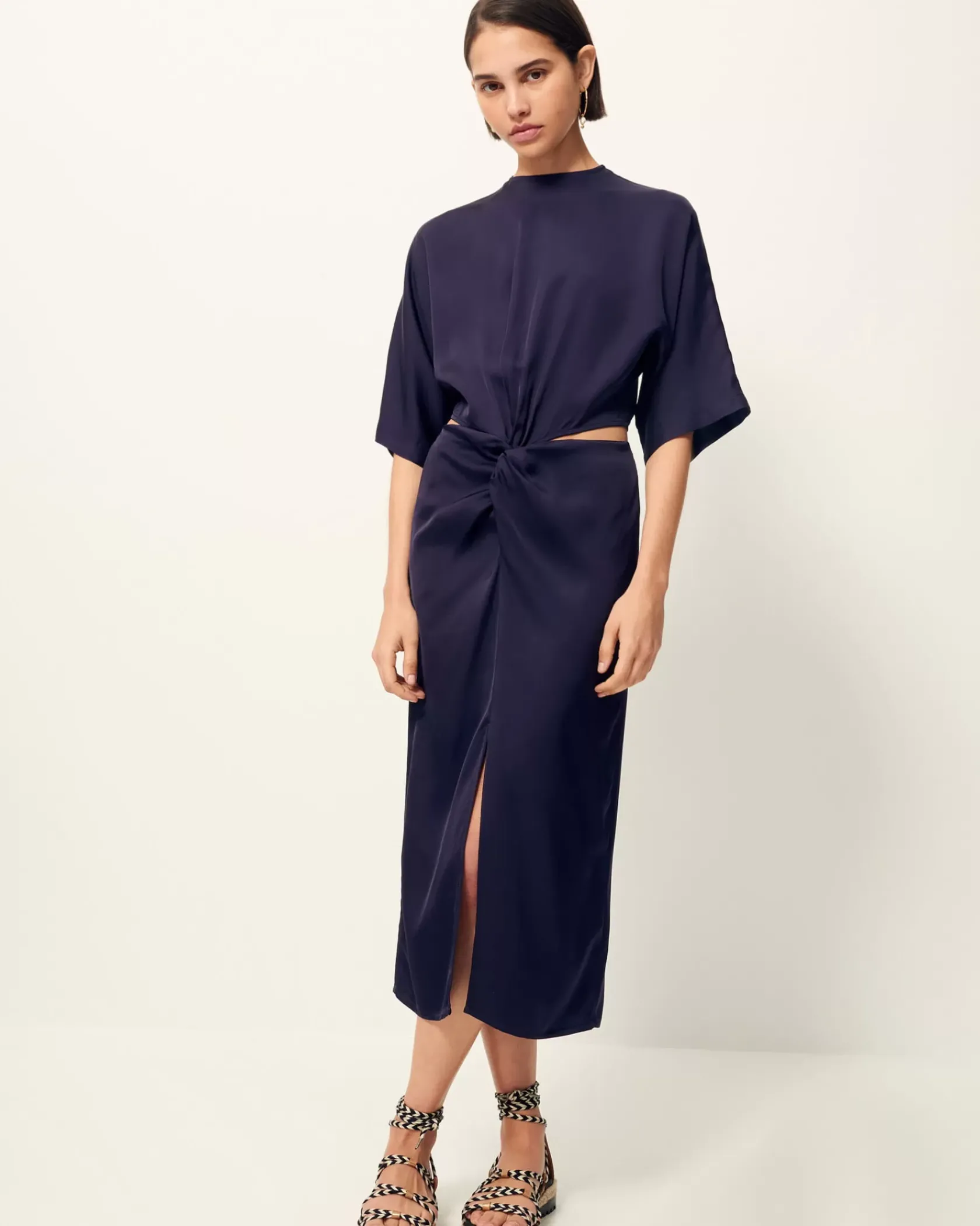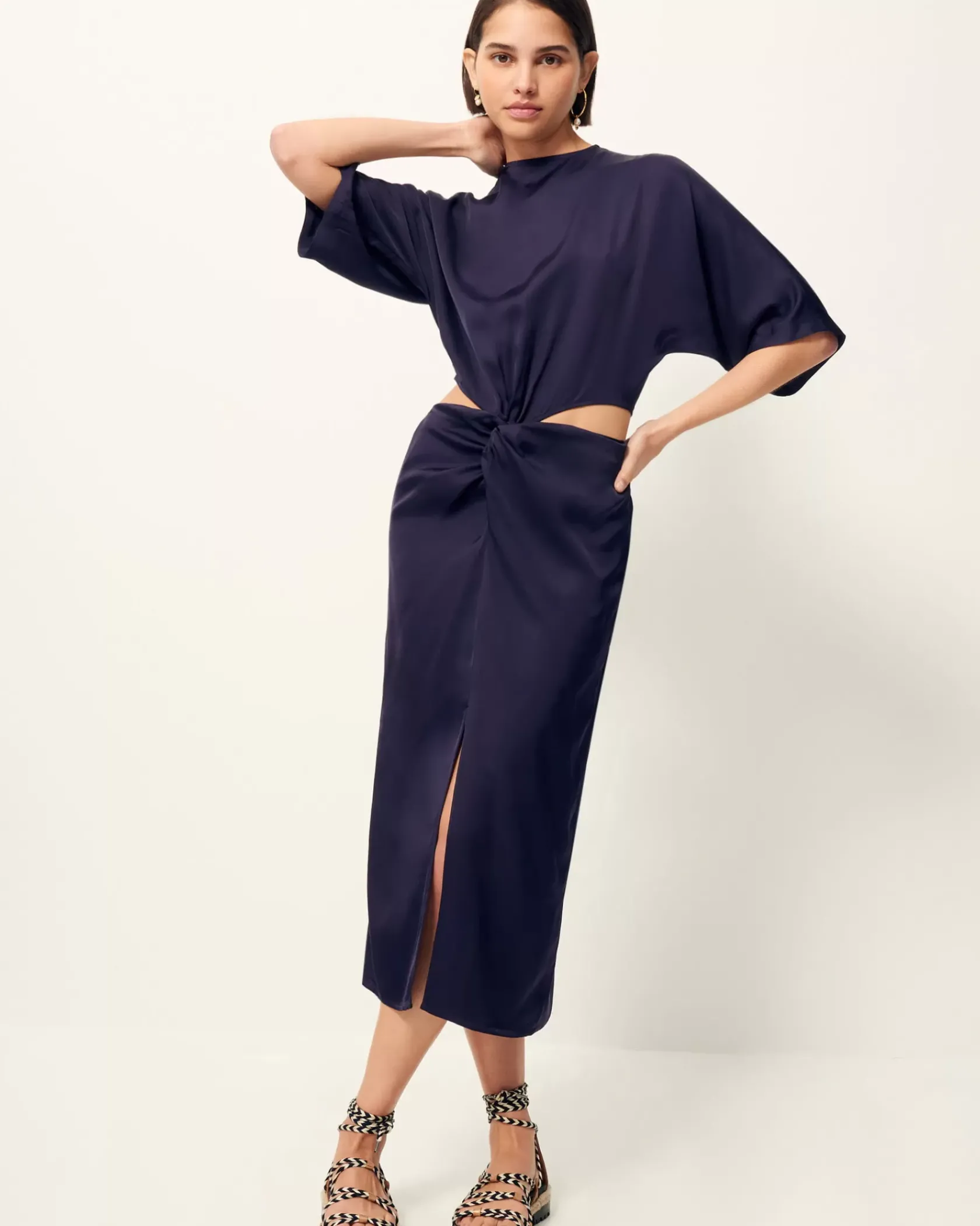 Robe mi-longue nouée ouverte sur les hanches en satin fluide de viscose.