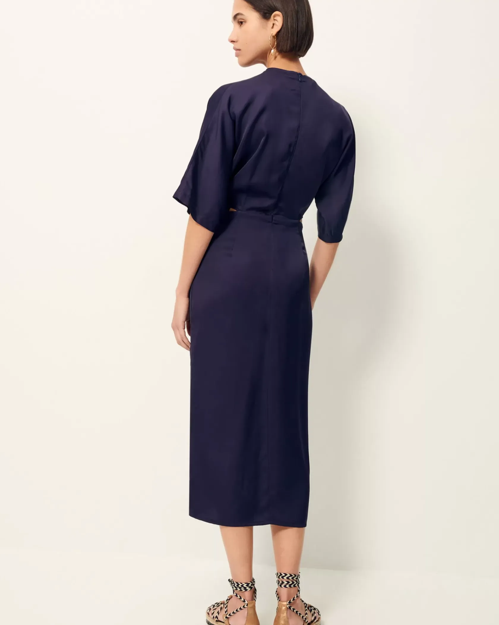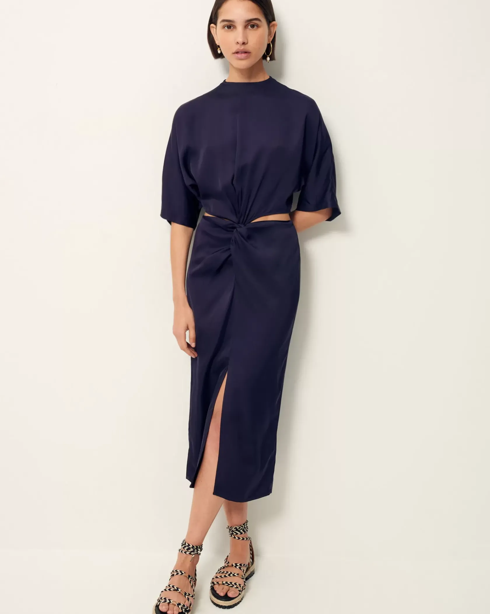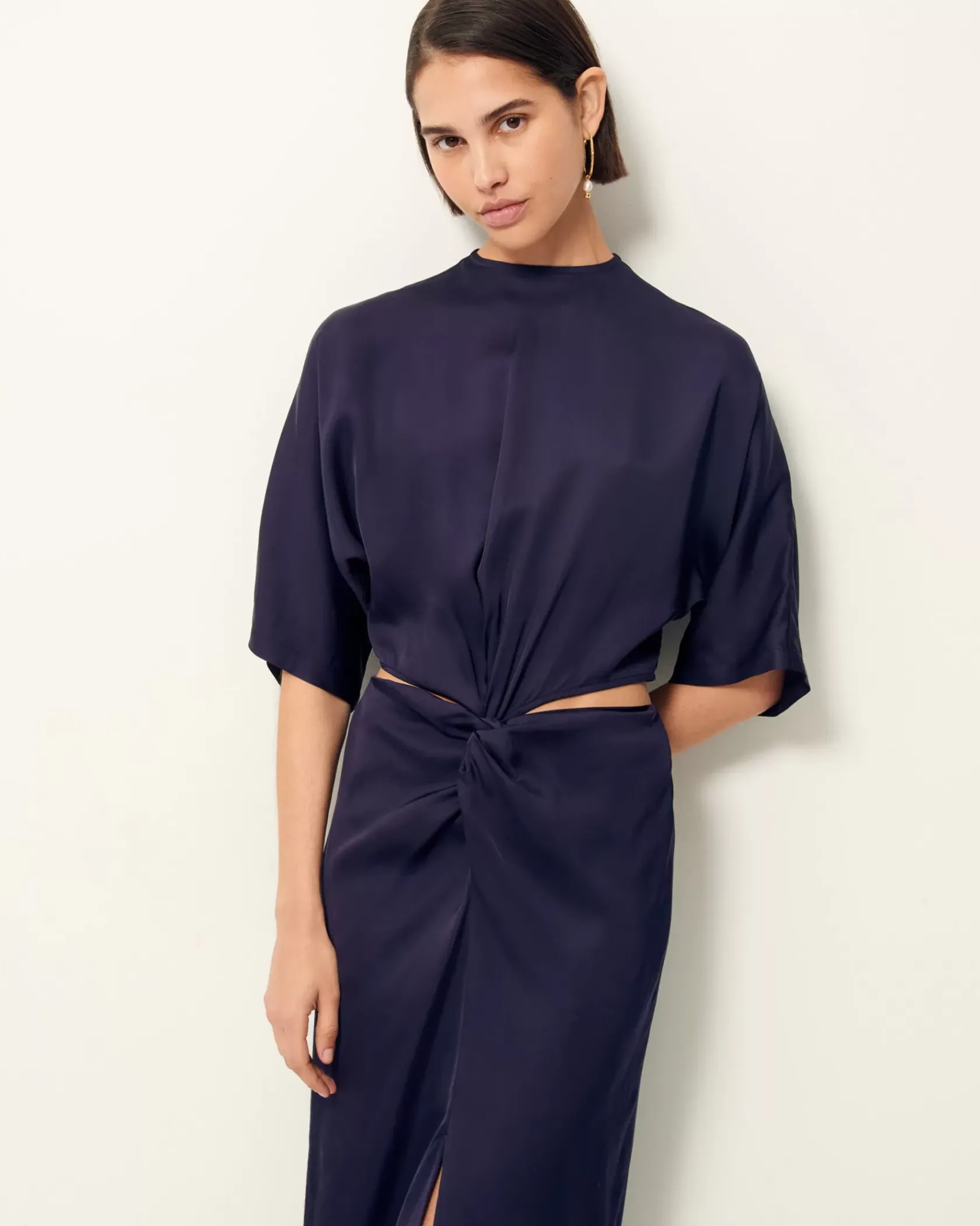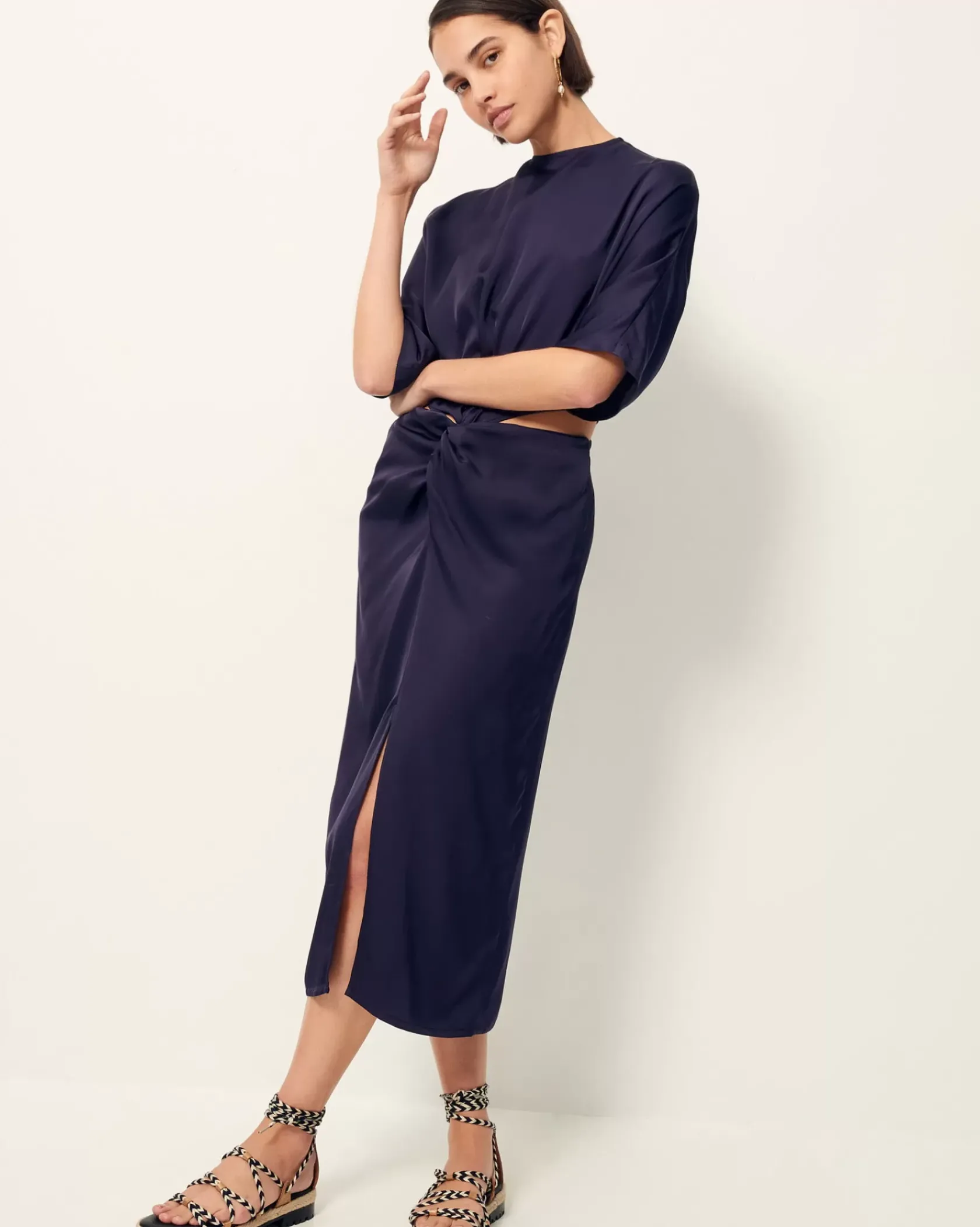 Robe mi-longue nouée ouverte sur les hanches en satin fluide de viscose.