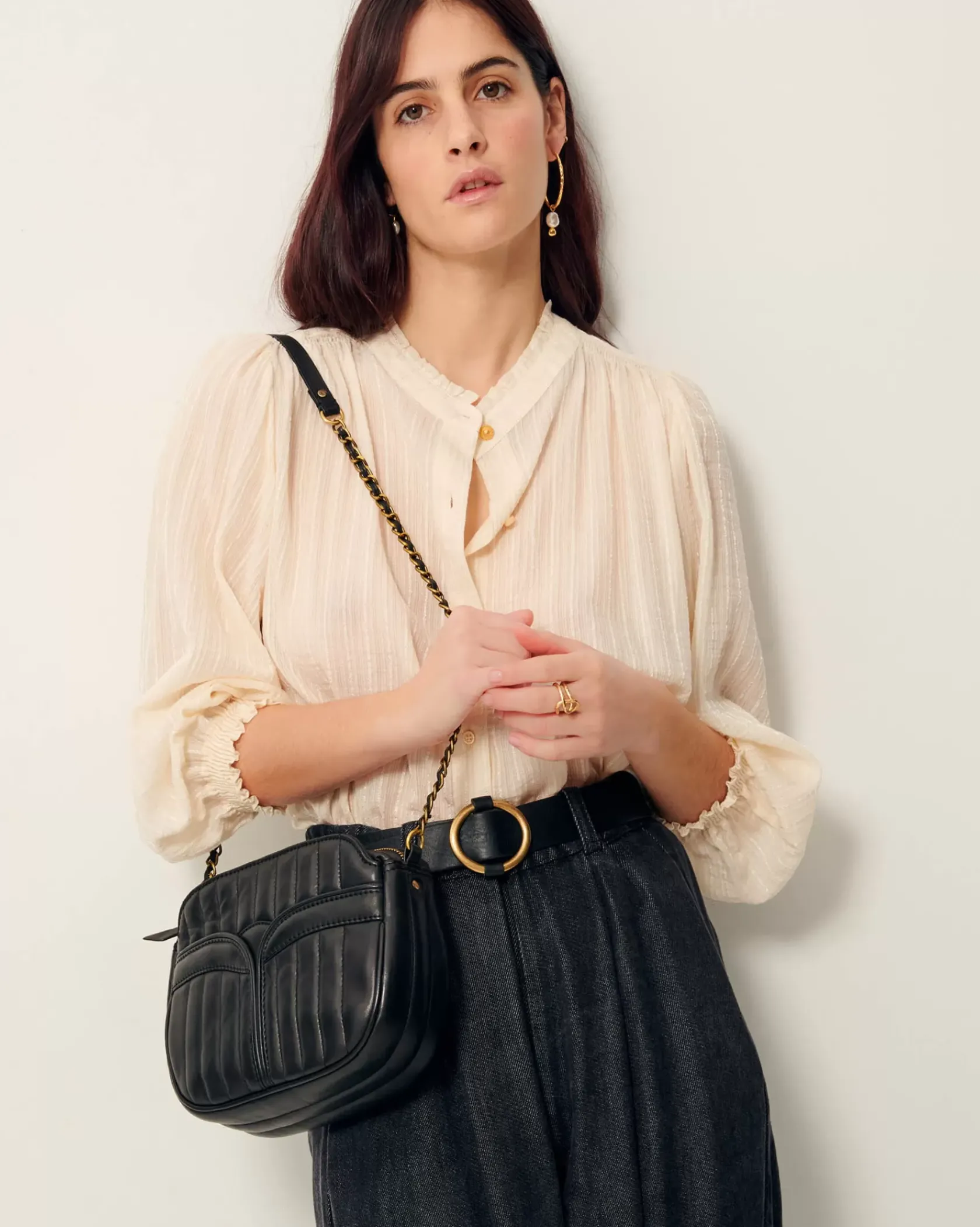 Sac en cuir d’agneau matelassé surpiqué avec anse chaine bijou.