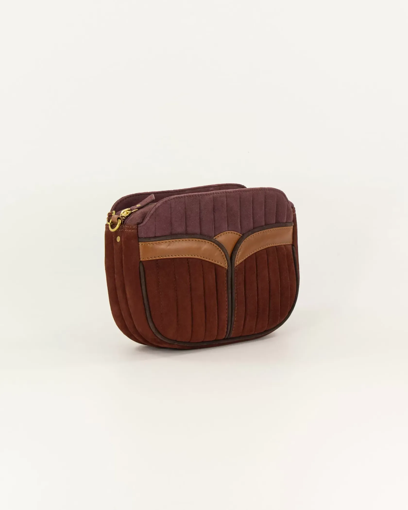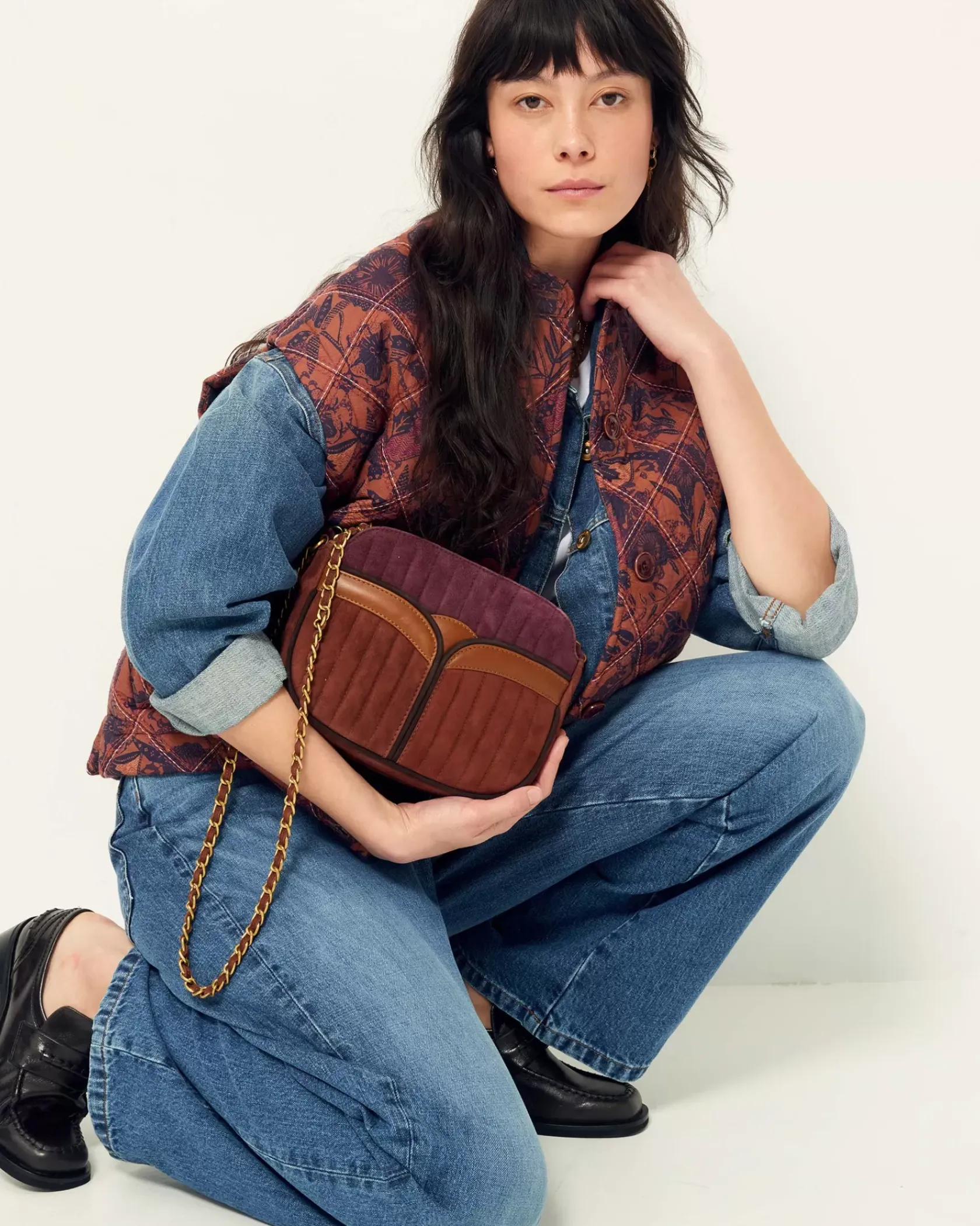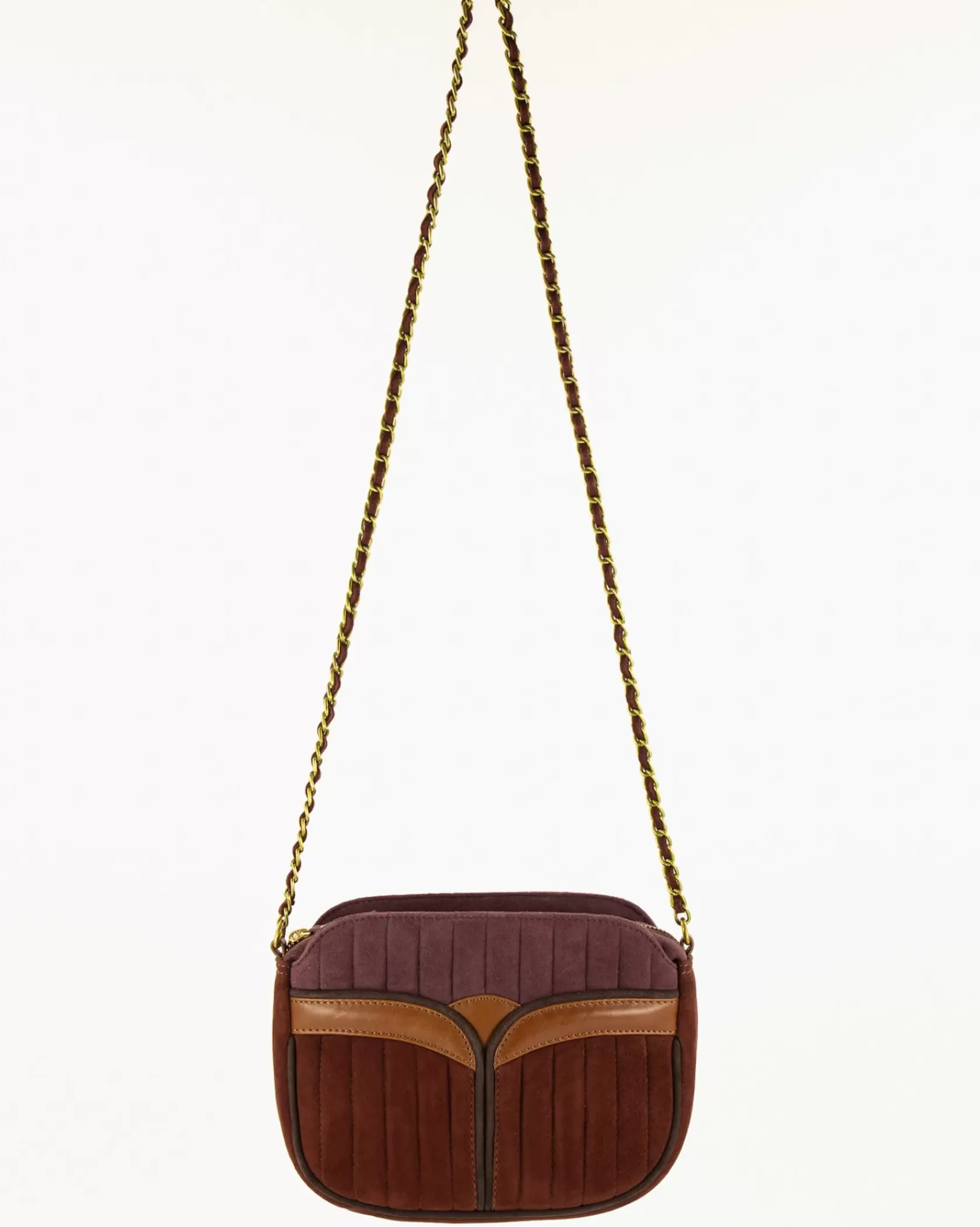 Sac en cuir de chèvre suédé matelassé surpiqué avec anse chaine bijou.