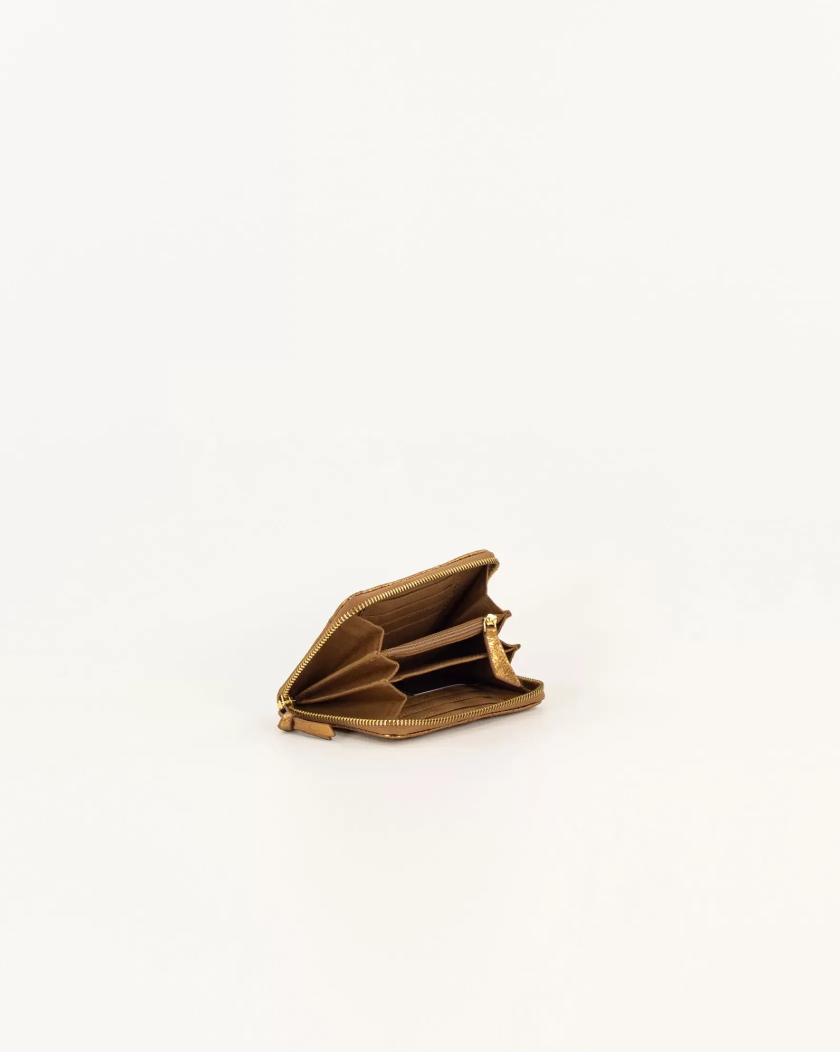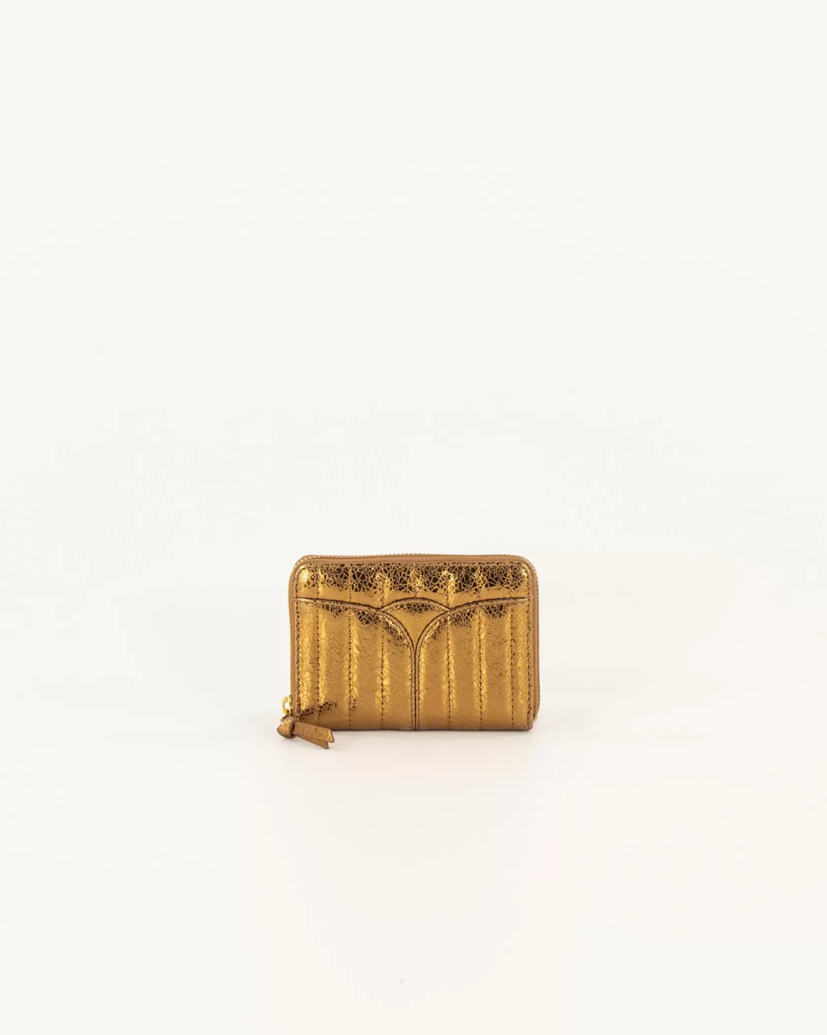 Portefeuille compact zippé en cuir de chèvre suédé métallisé matelassé et surpiqué.