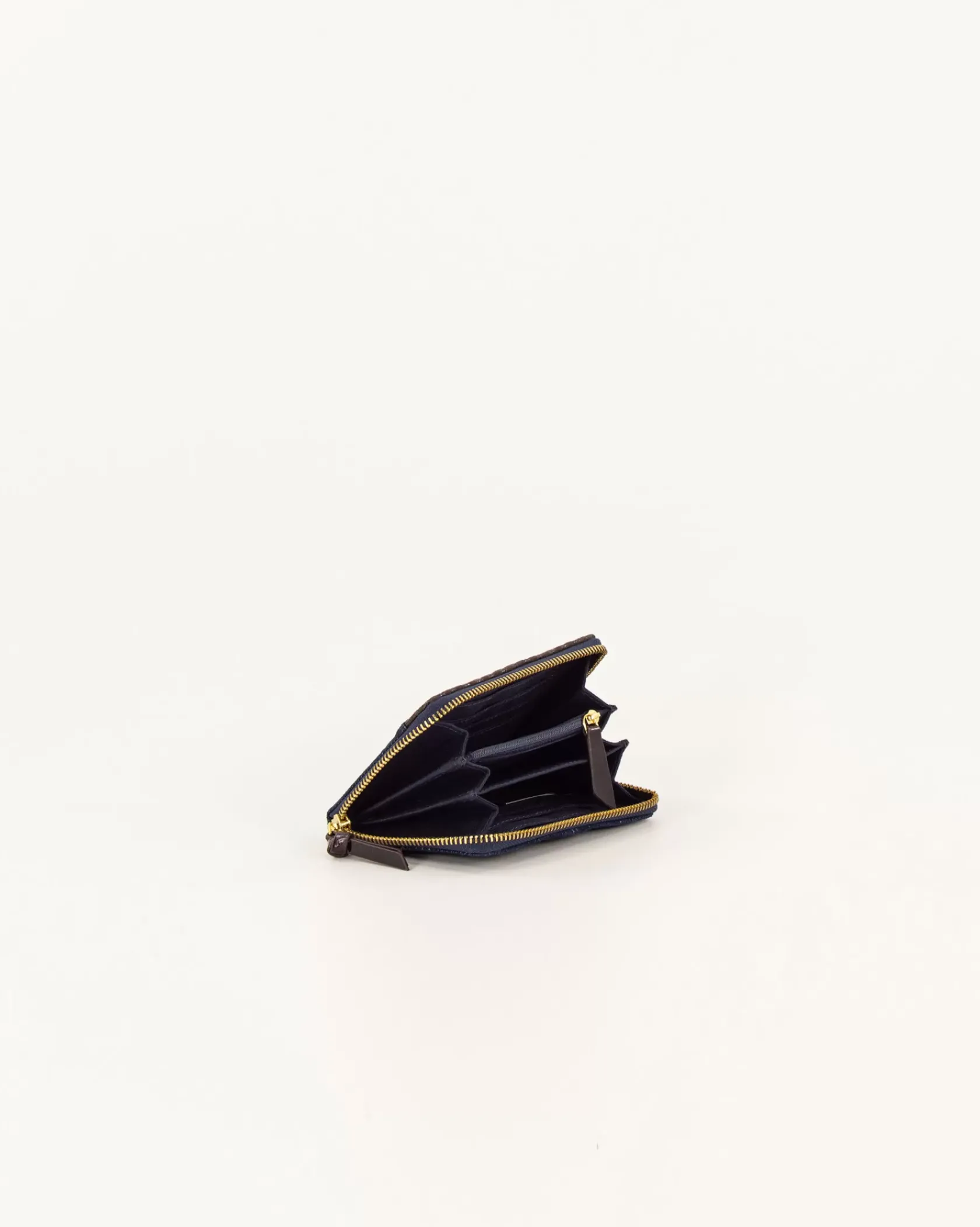 Portefeuille compact zippé en mix matières matelassé surpiqué, motif exclusif Sessùn. Empiècements et détails en cuir de chèvre suédé imprimé.