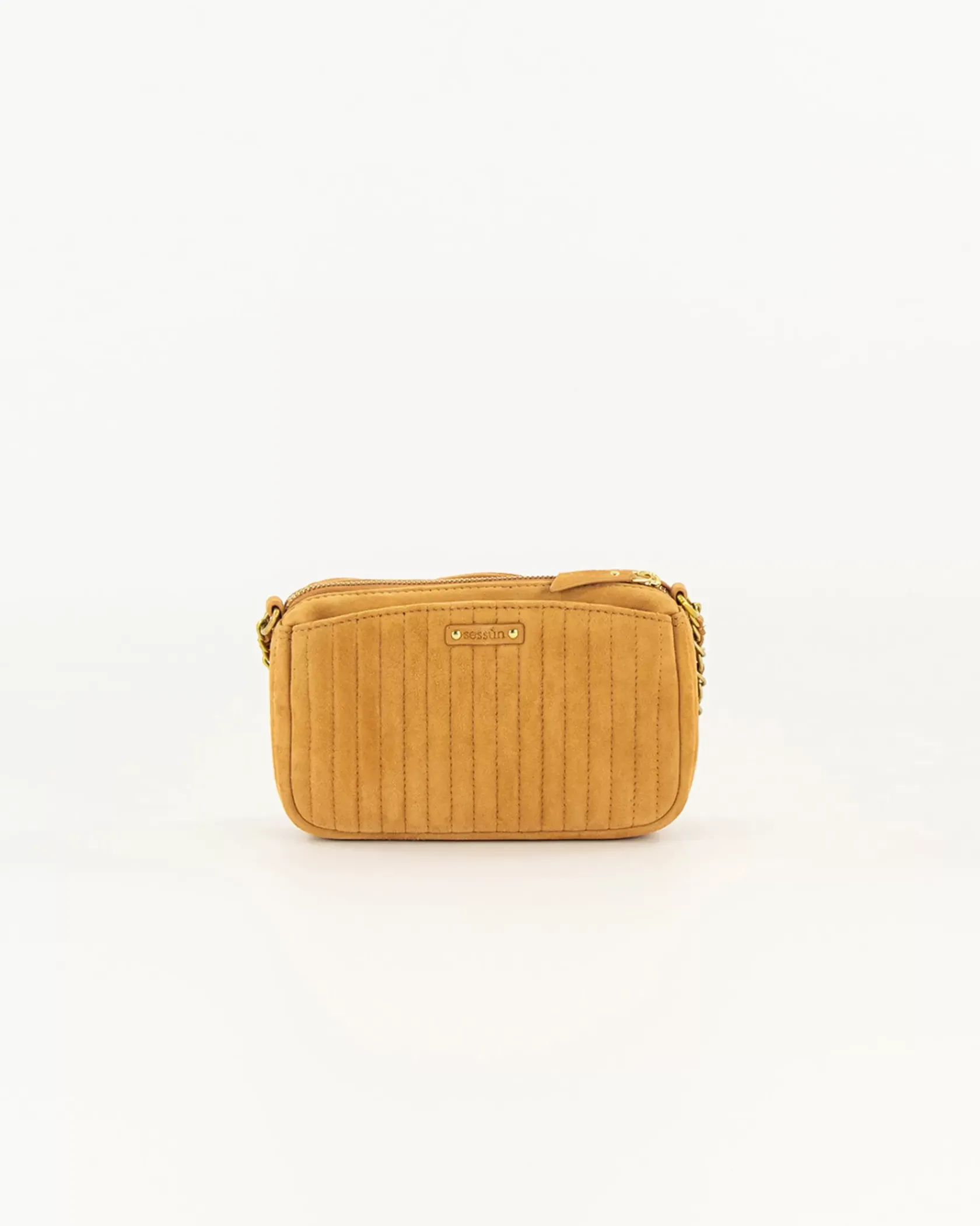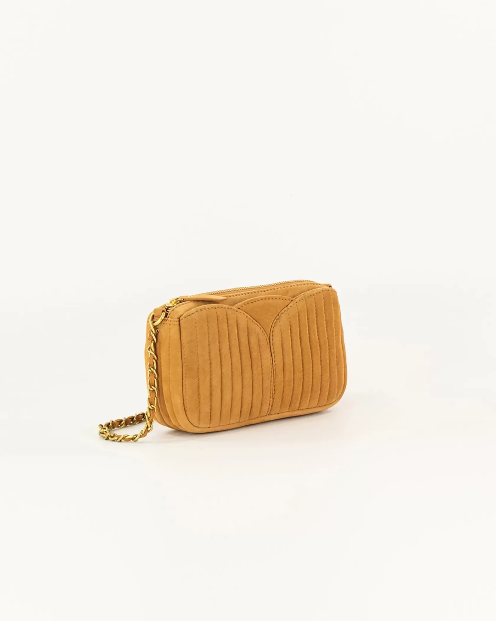Petit sac en cuir de chèvre suédé métallisé, matelassé surpiqué avec anse chaine bijou.
