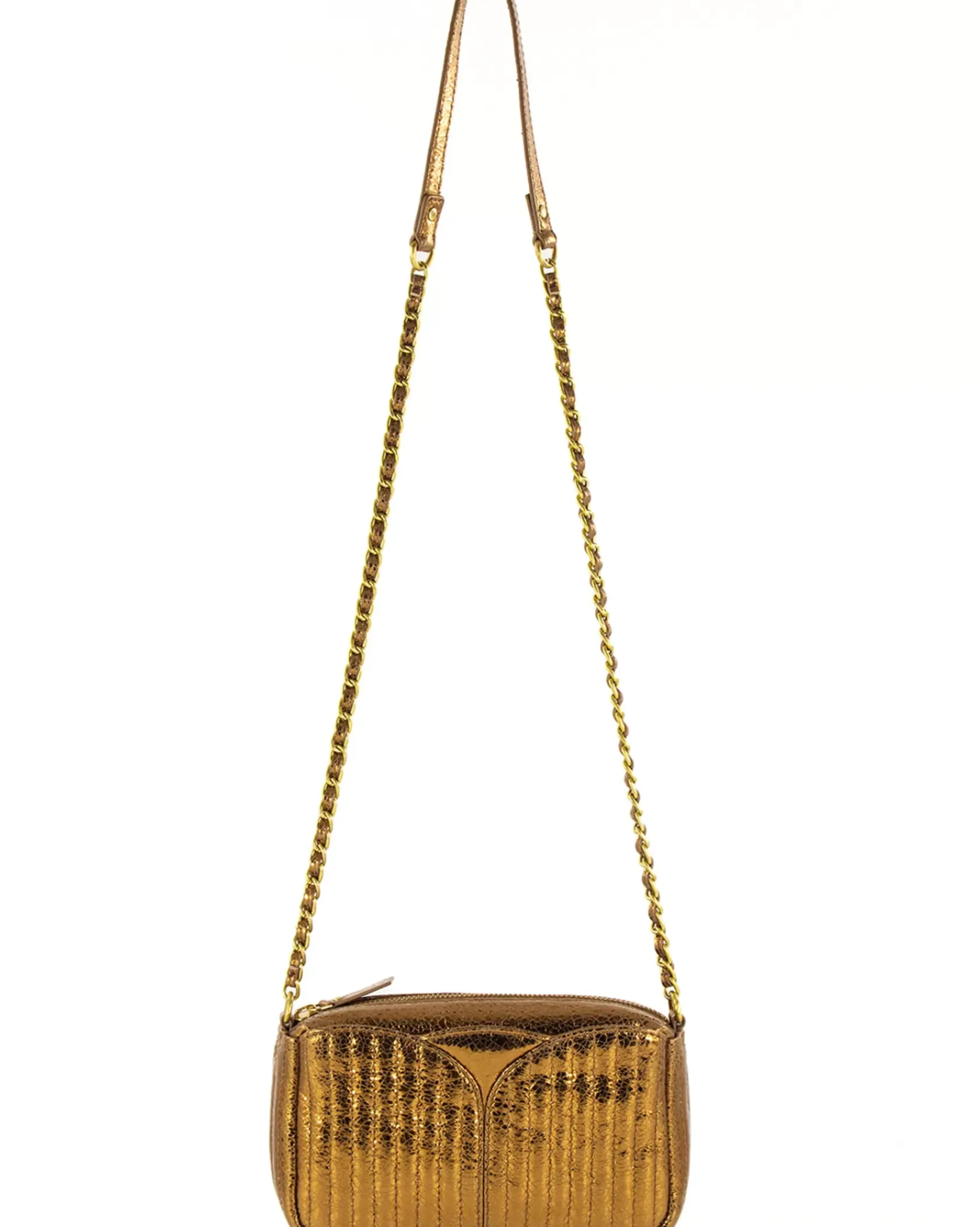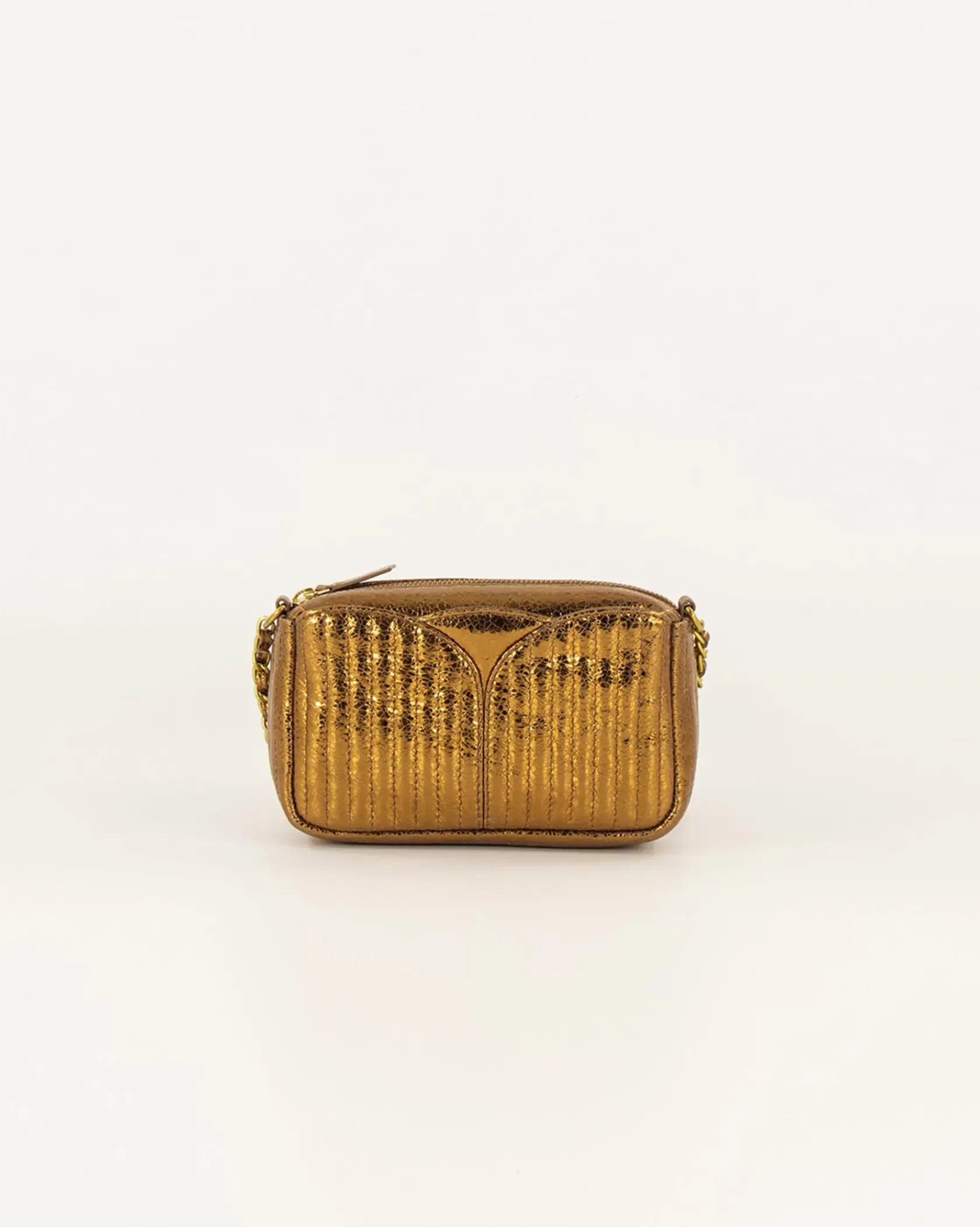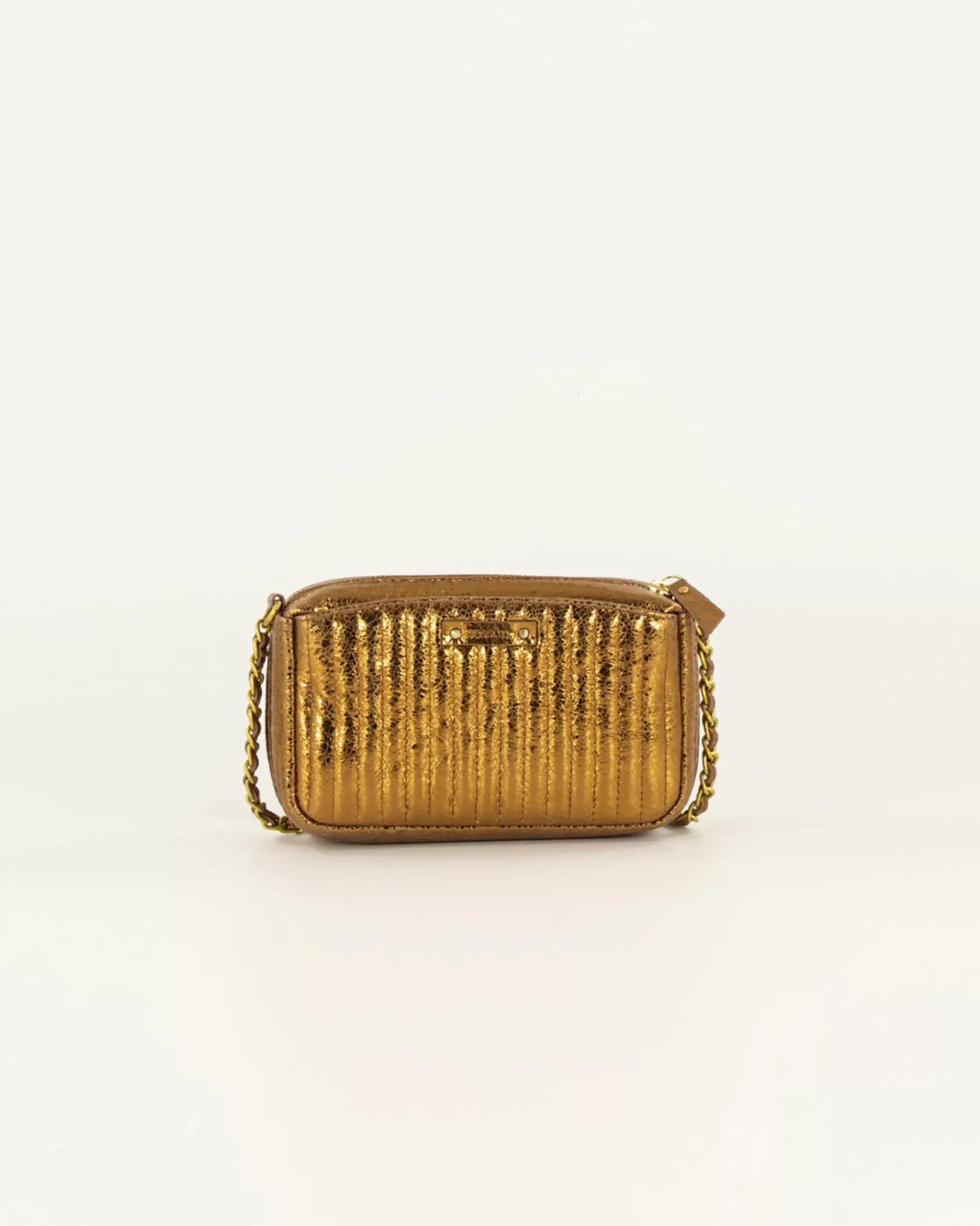 Petit sac en cuir de chèvre suédé métallisé, matelassé surpiqué avec anse chaine bijou.