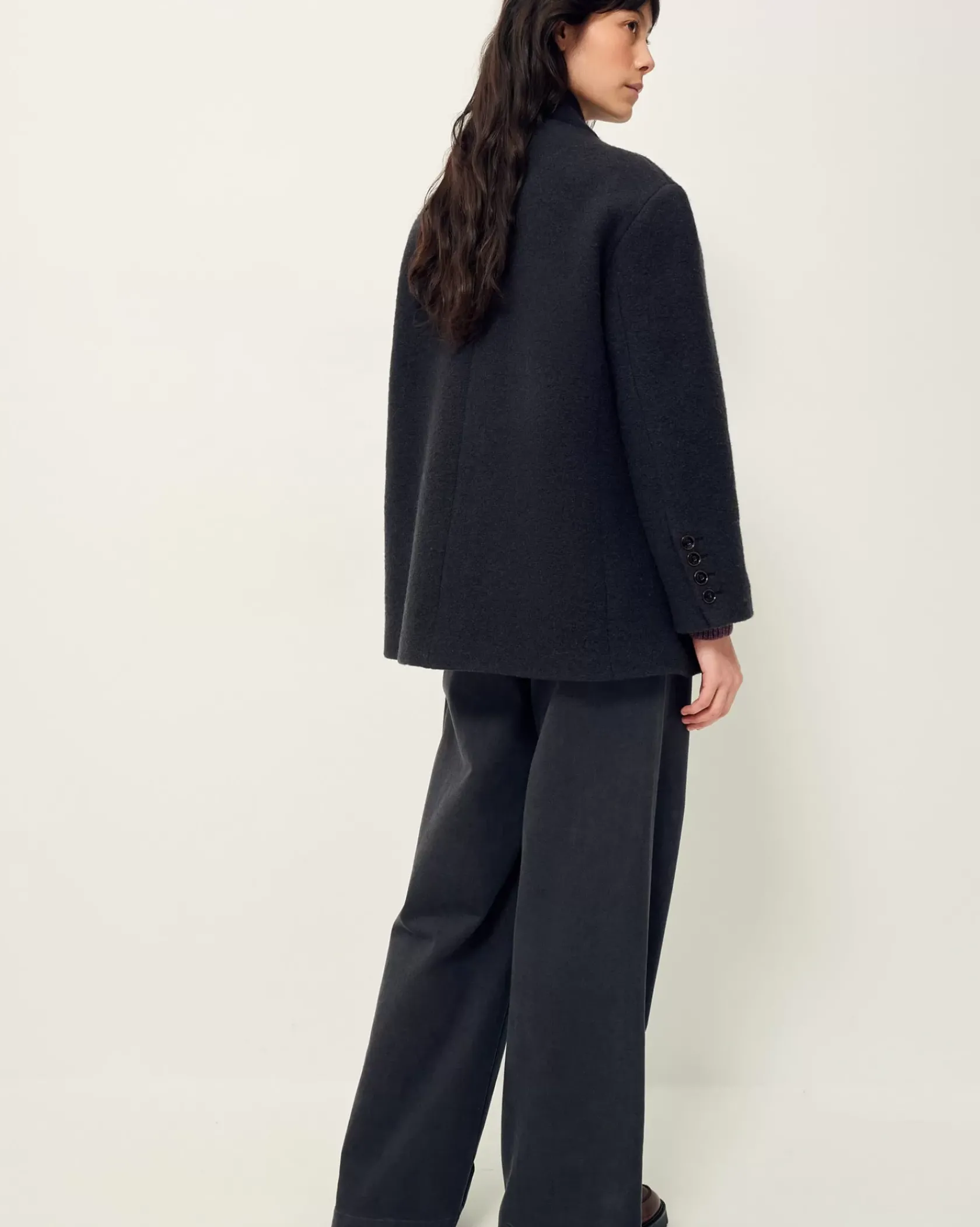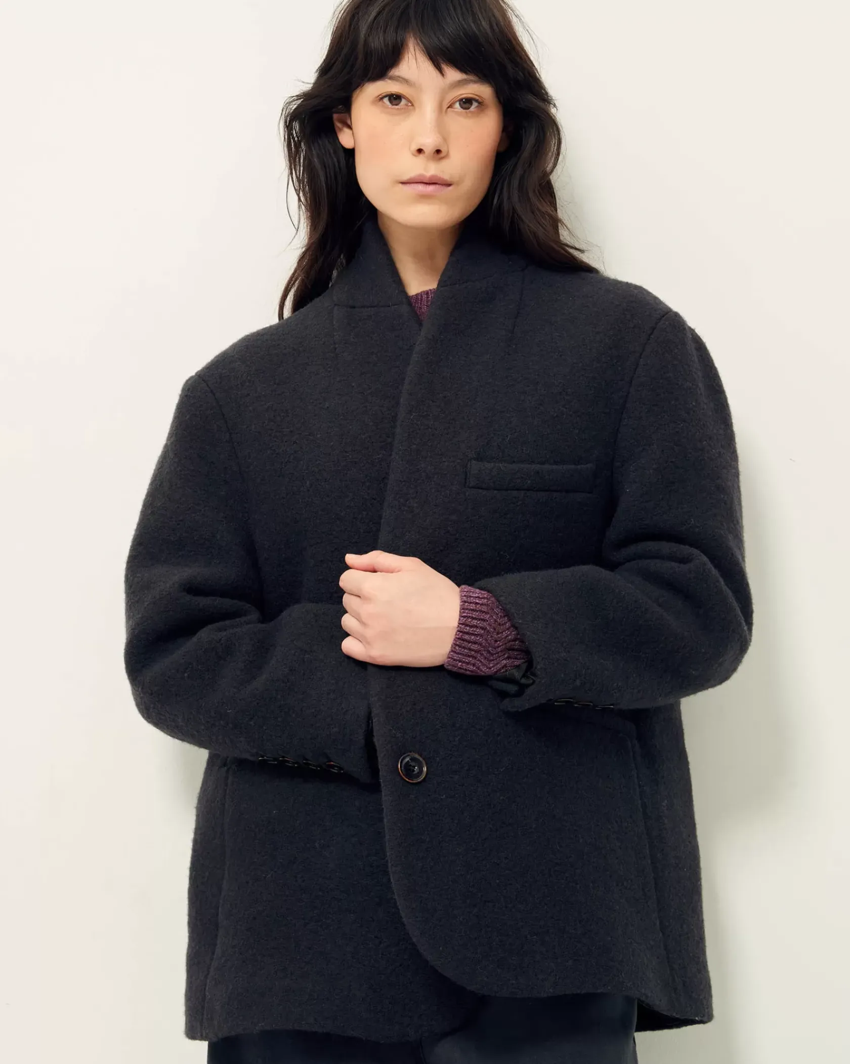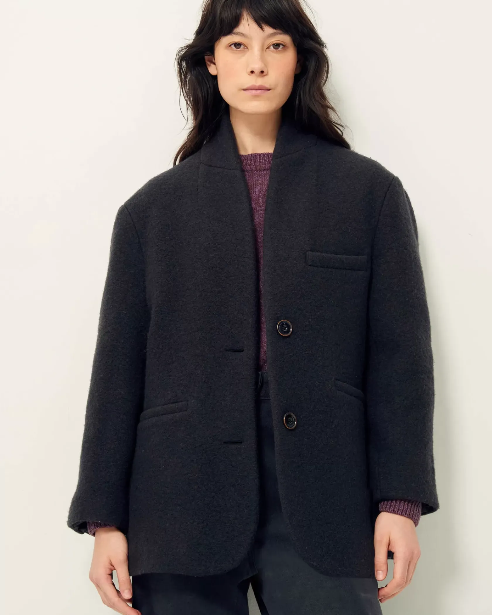 Veste droite façon veste de tailleur à col relevé en lainage lourd loden (laine bouillie) en armure toile, tissé en Italie.