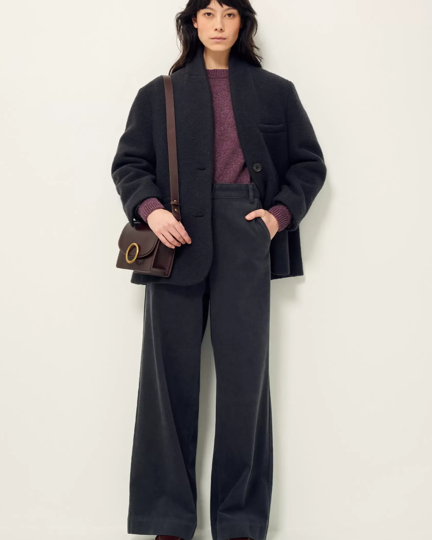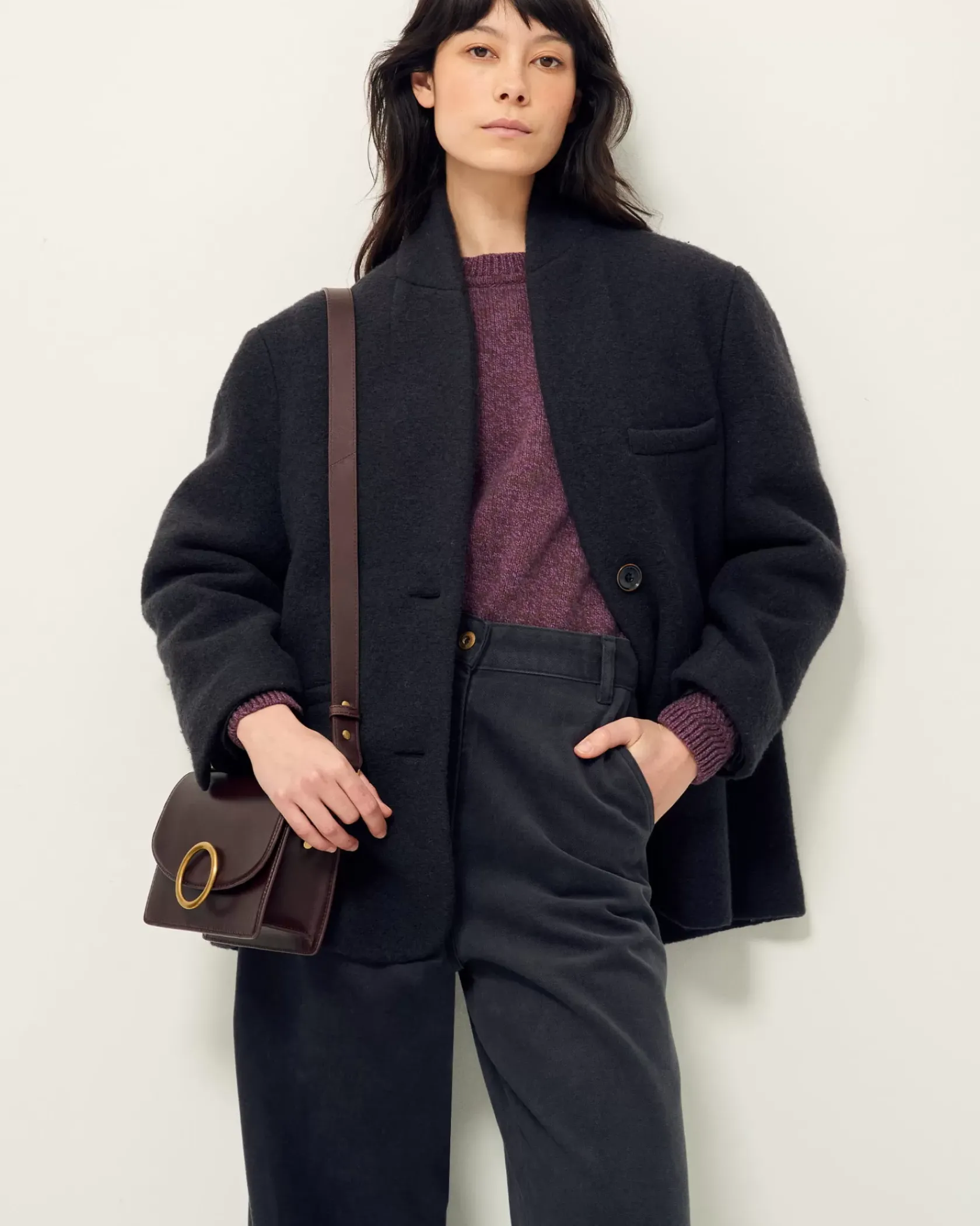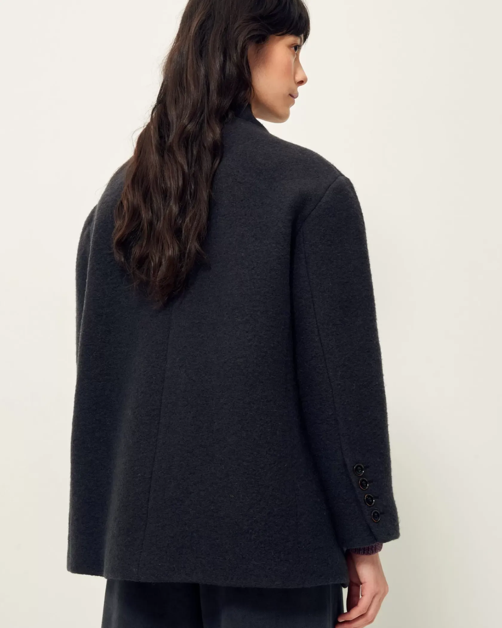 Veste droite façon veste de tailleur à col relevé en lainage lourd loden (laine bouillie) en armure toile, tissé en Italie.