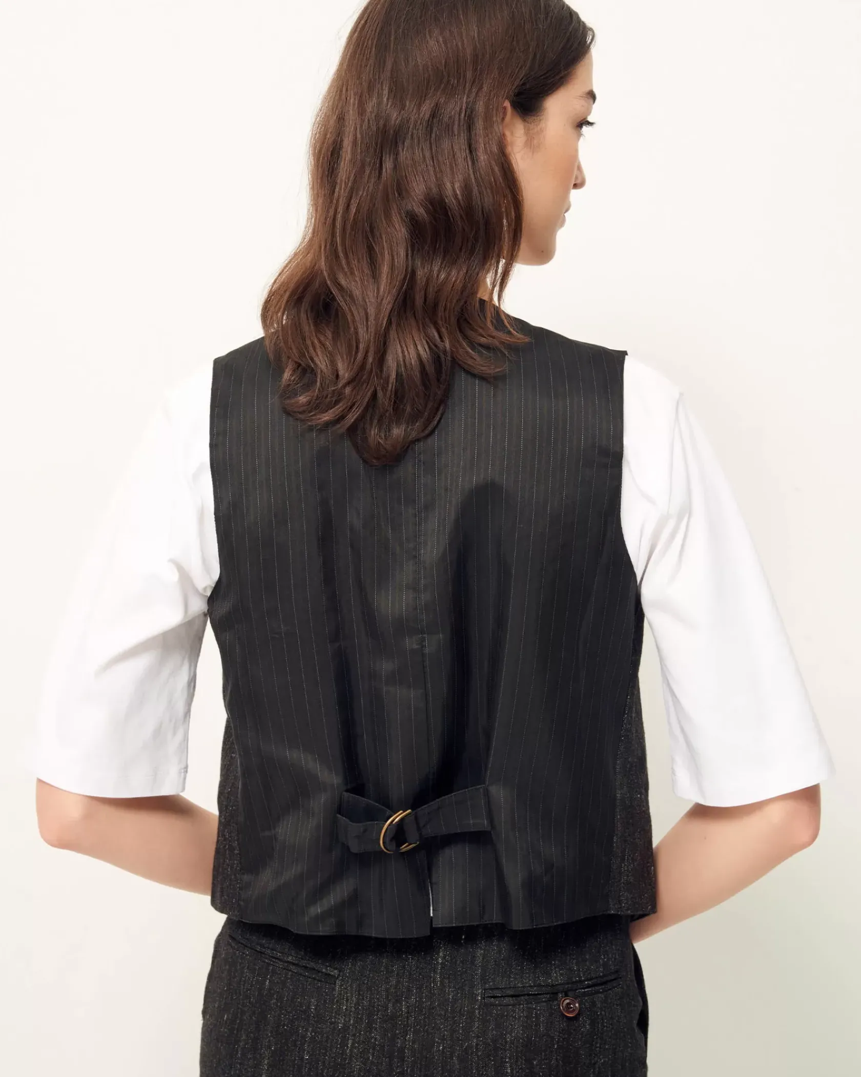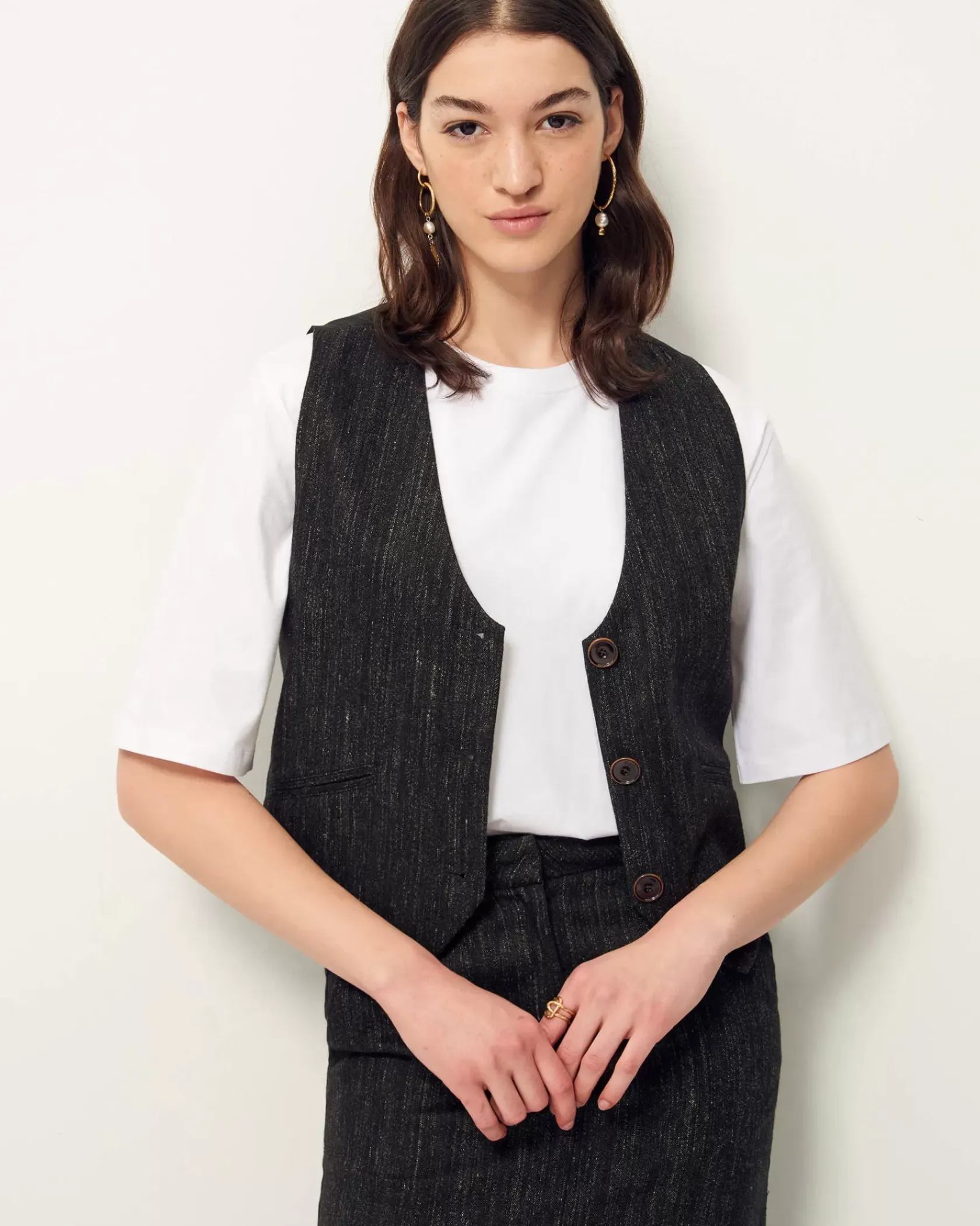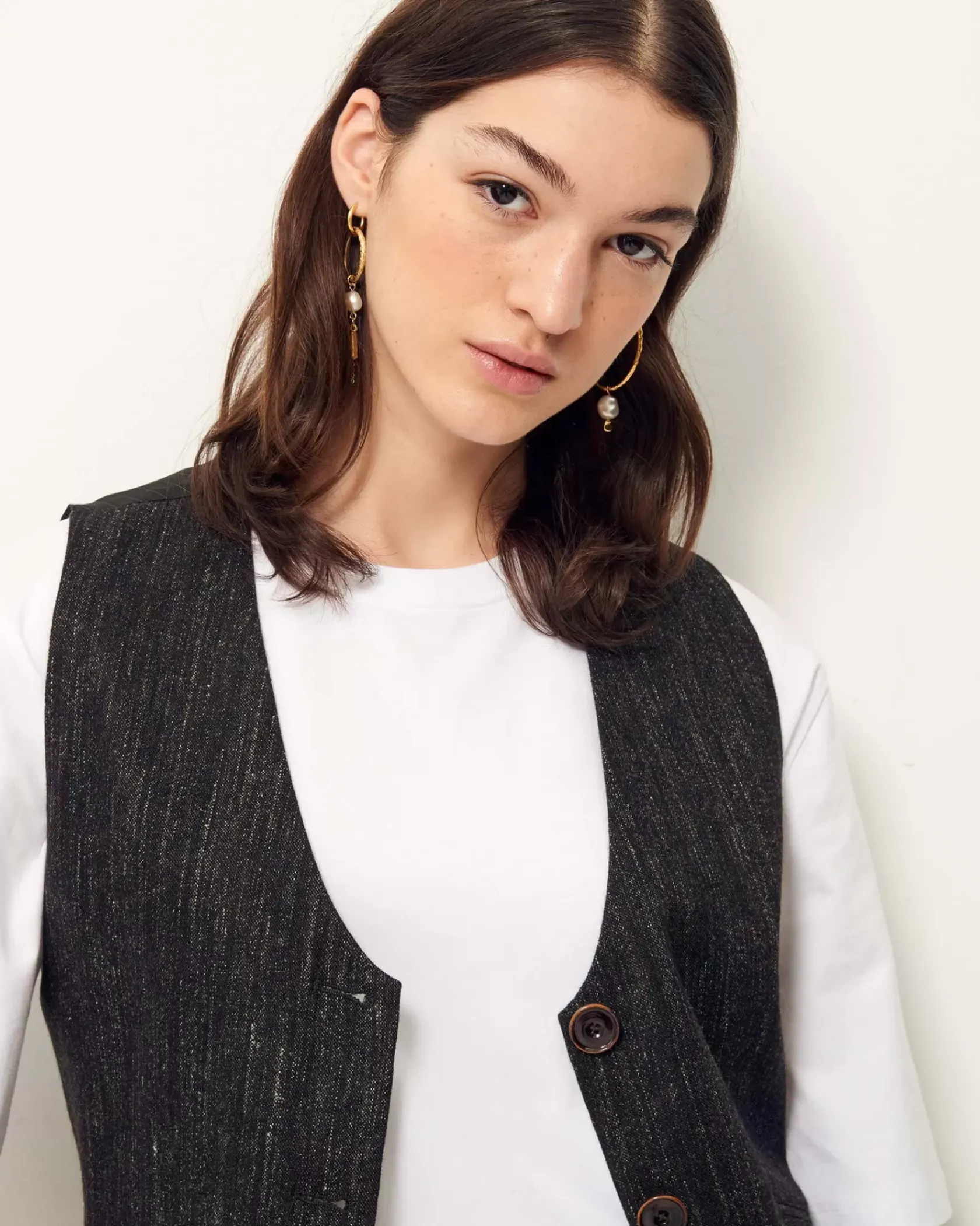 Veston sans manches esprit tailleur en flanelle fantaisie de fils chinés tissé en Italie.