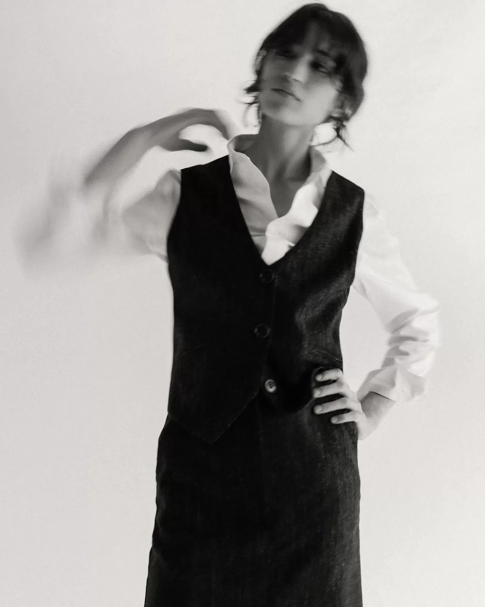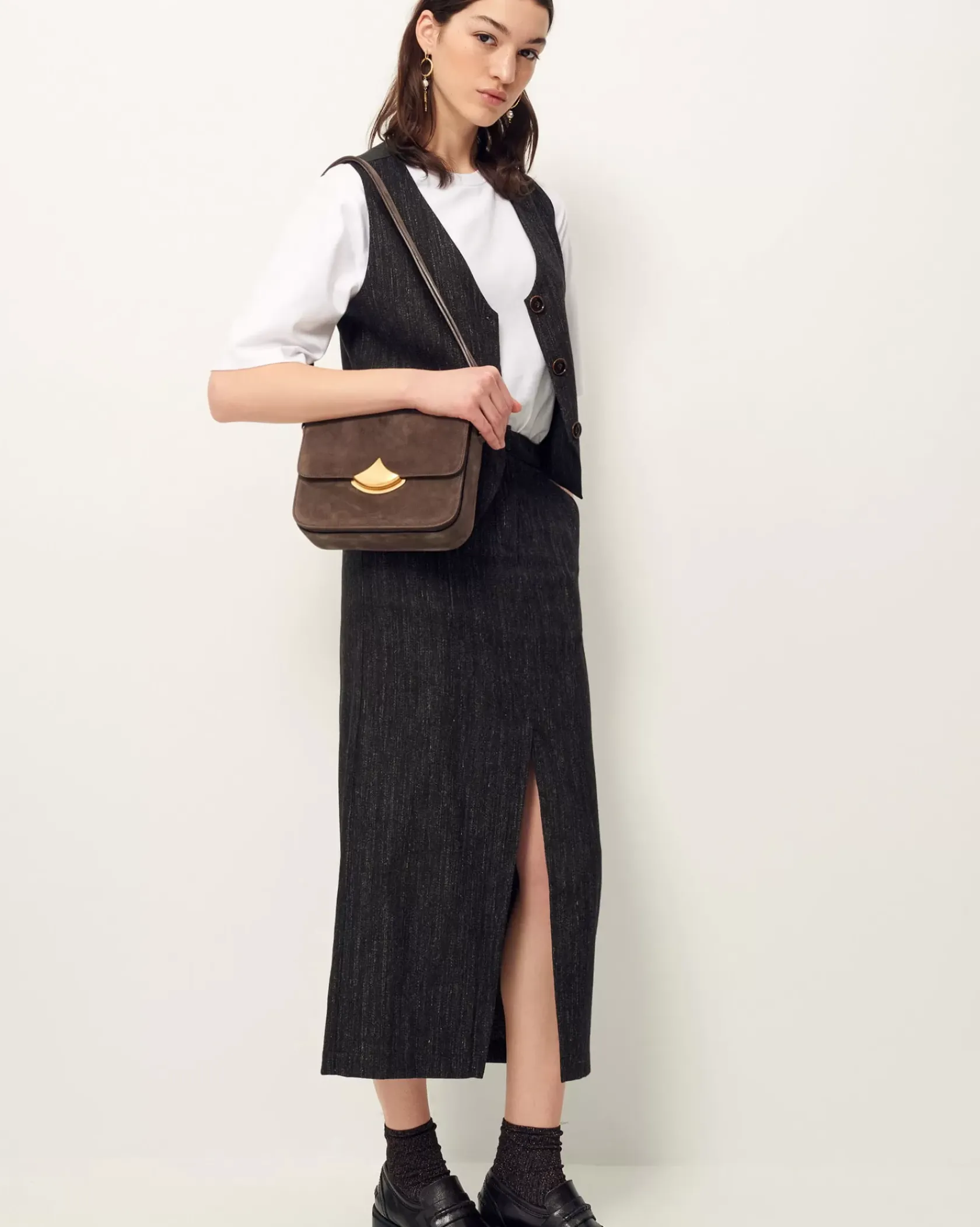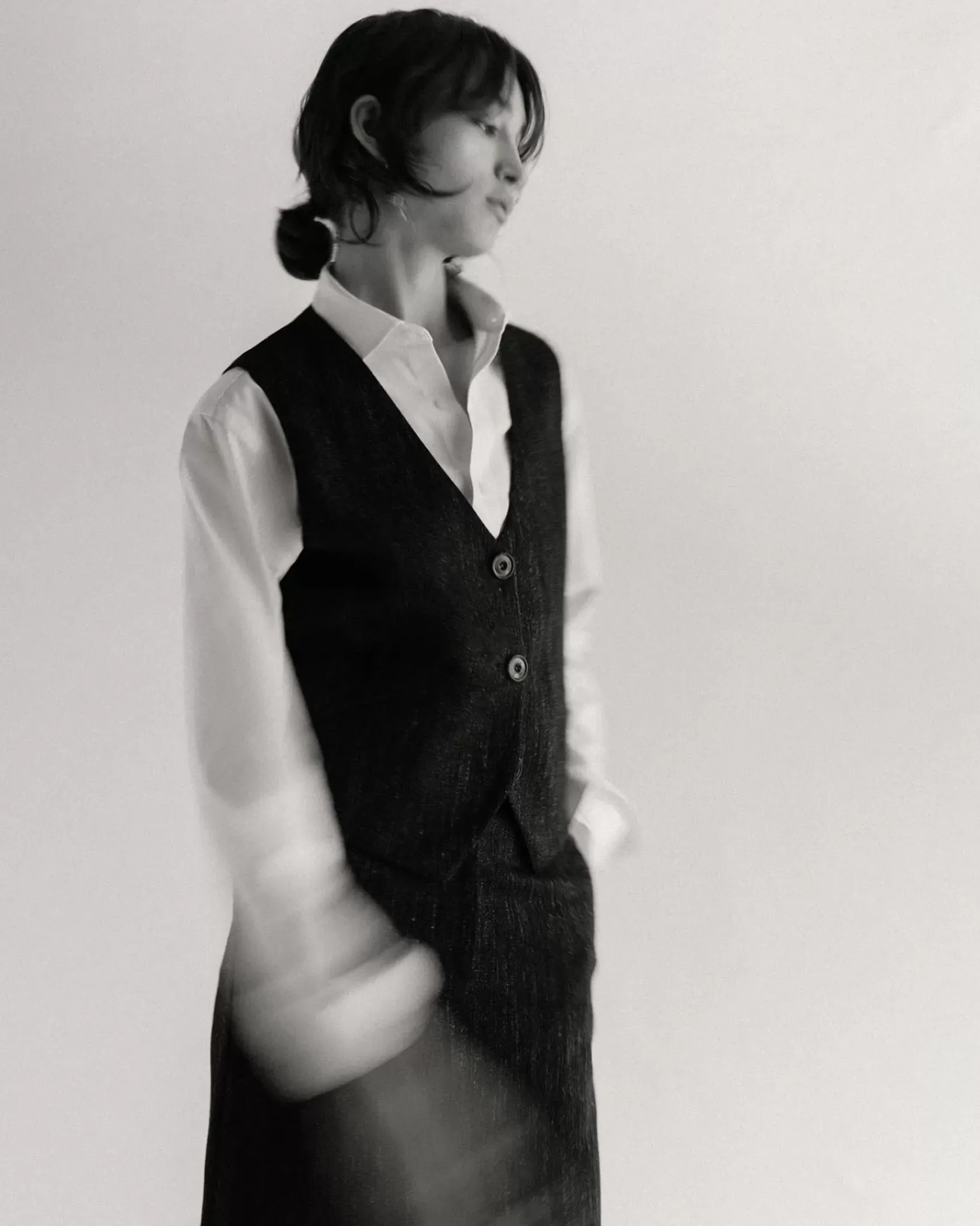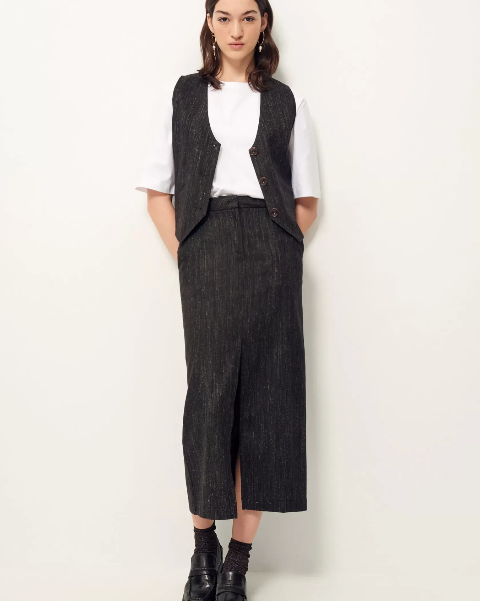 Veston sans manches esprit tailleur en flanelle fantaisie de fils chinés tissé en Italie.