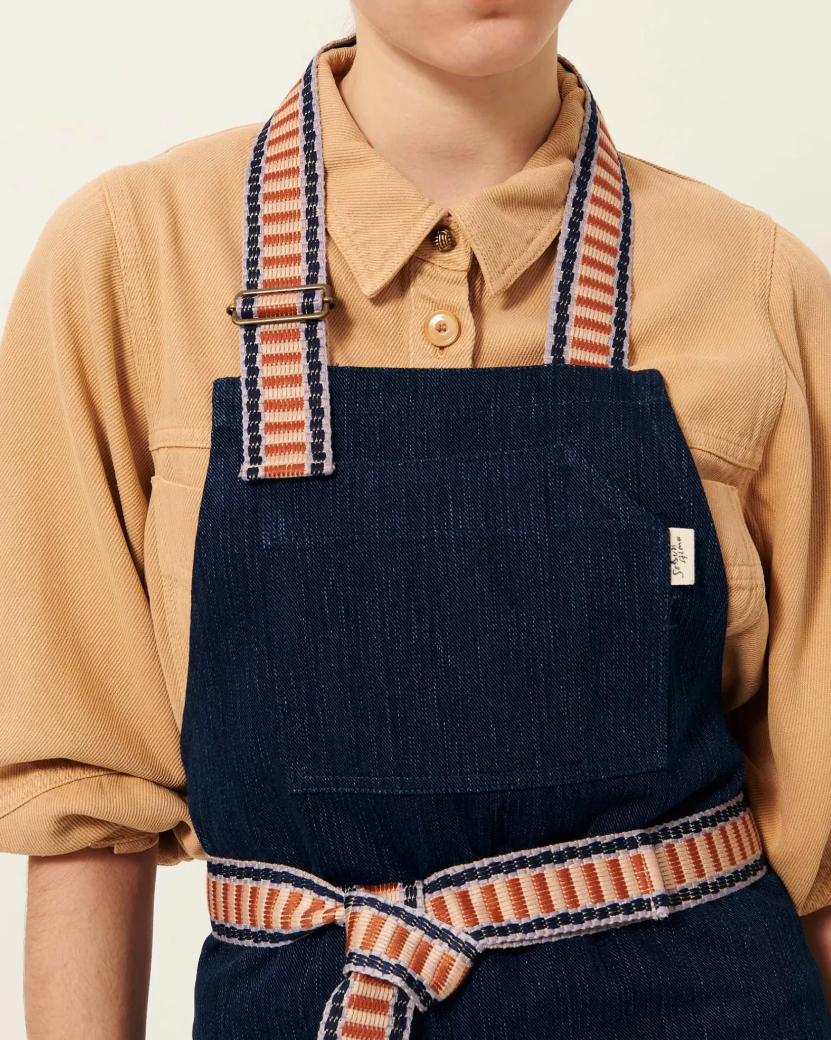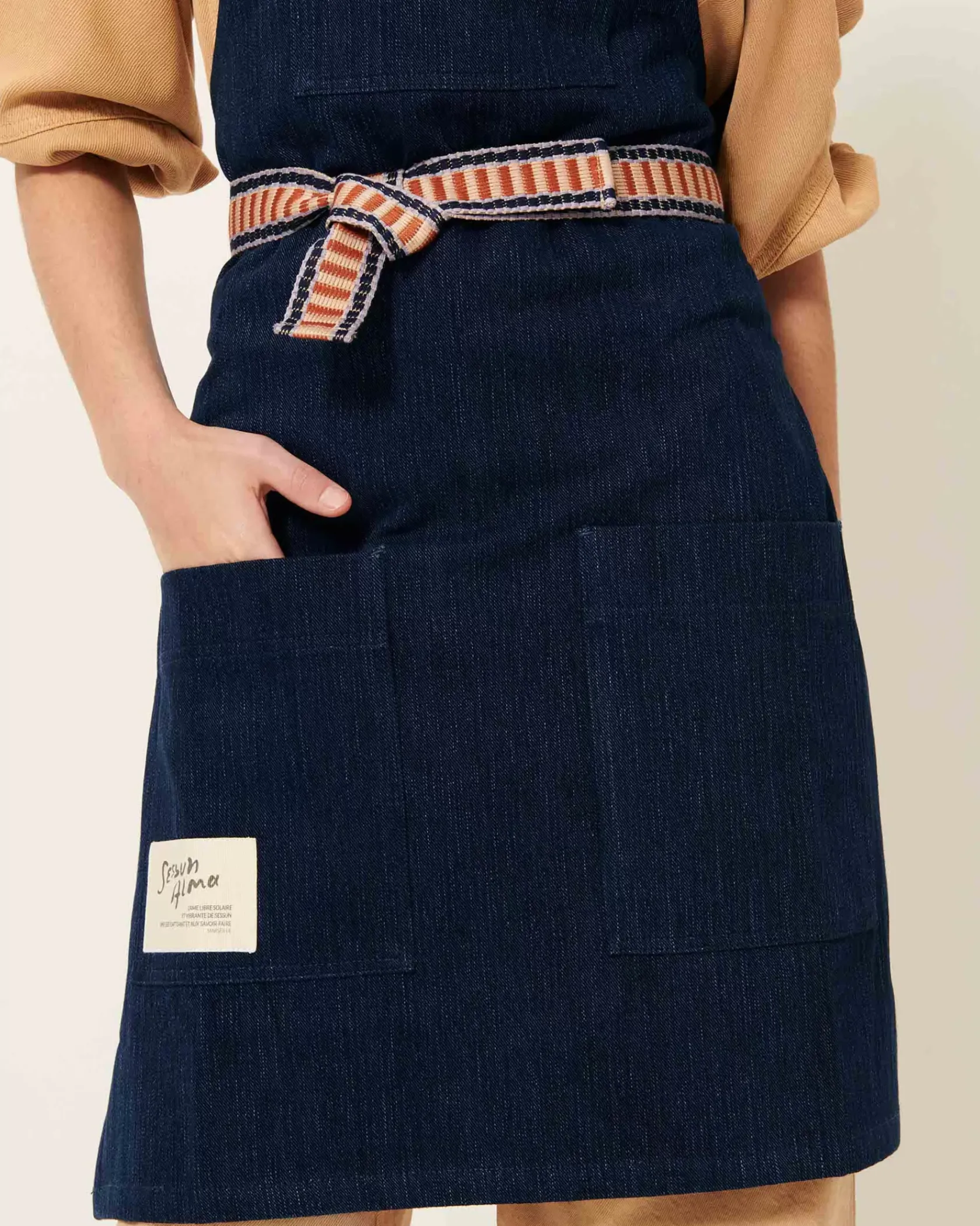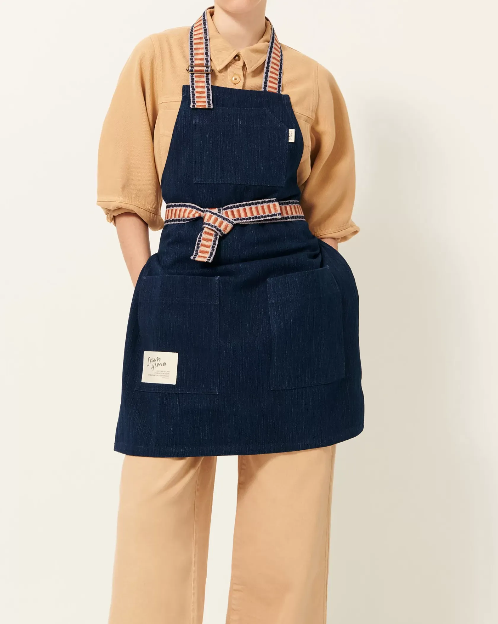 Tablier à poches en sergé de coton, fils teints en indigo, tissé en Italie.
