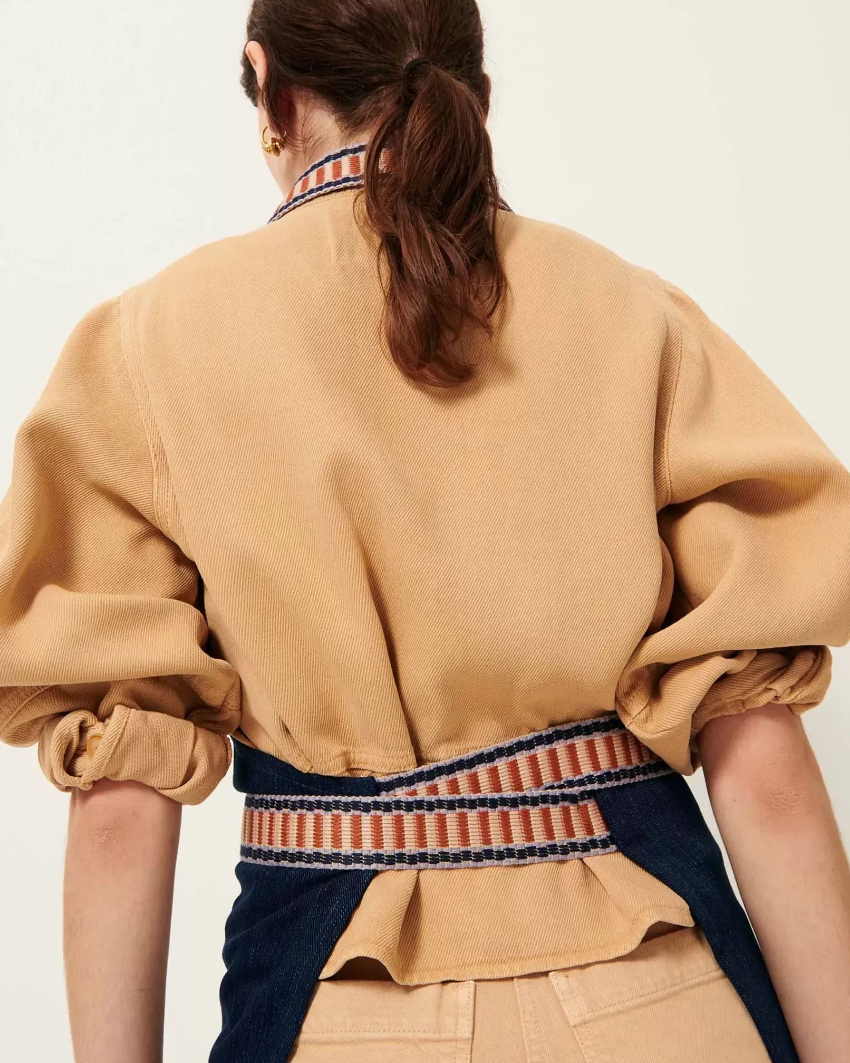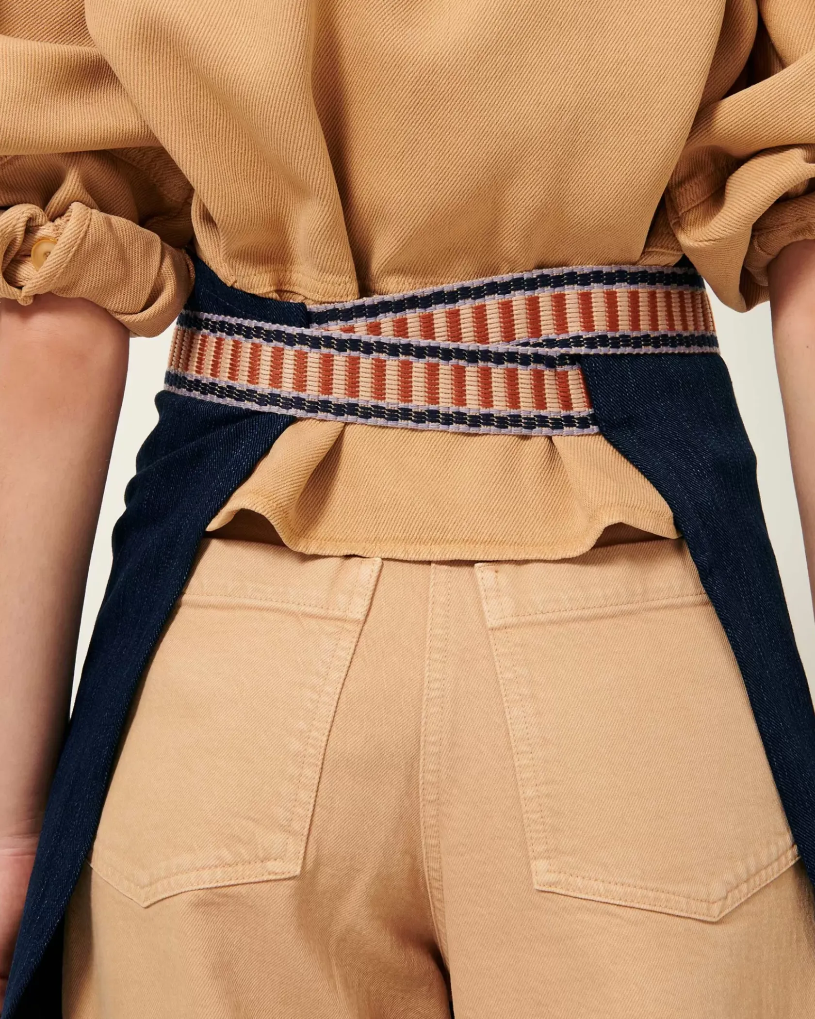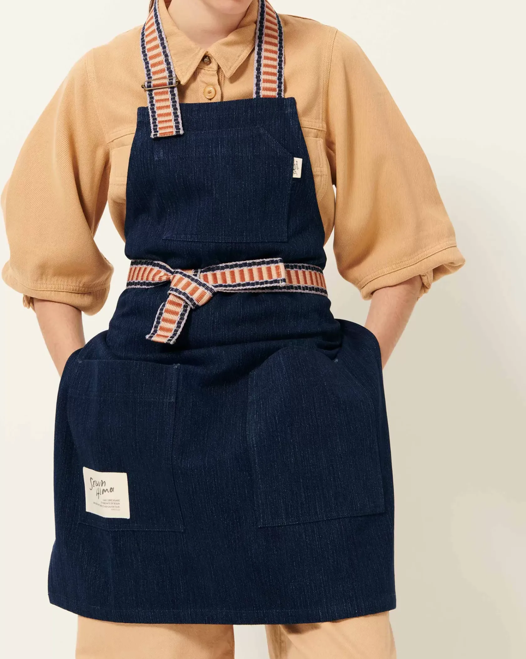Tablier à poches en sergé de coton, fils teints en indigo, tissé en Italie.
