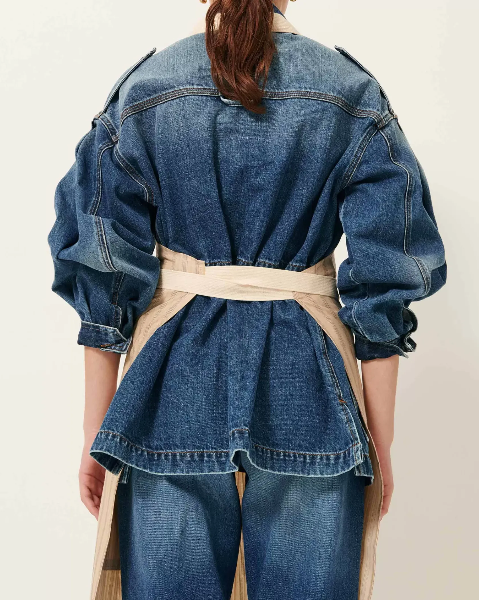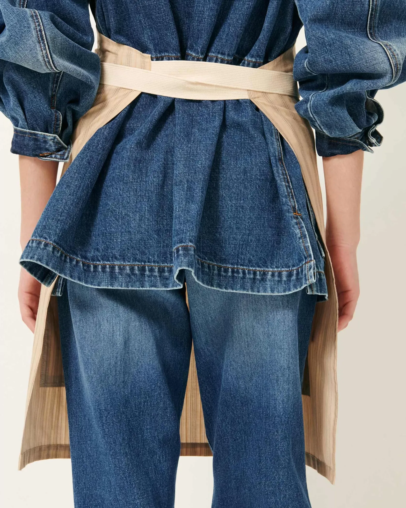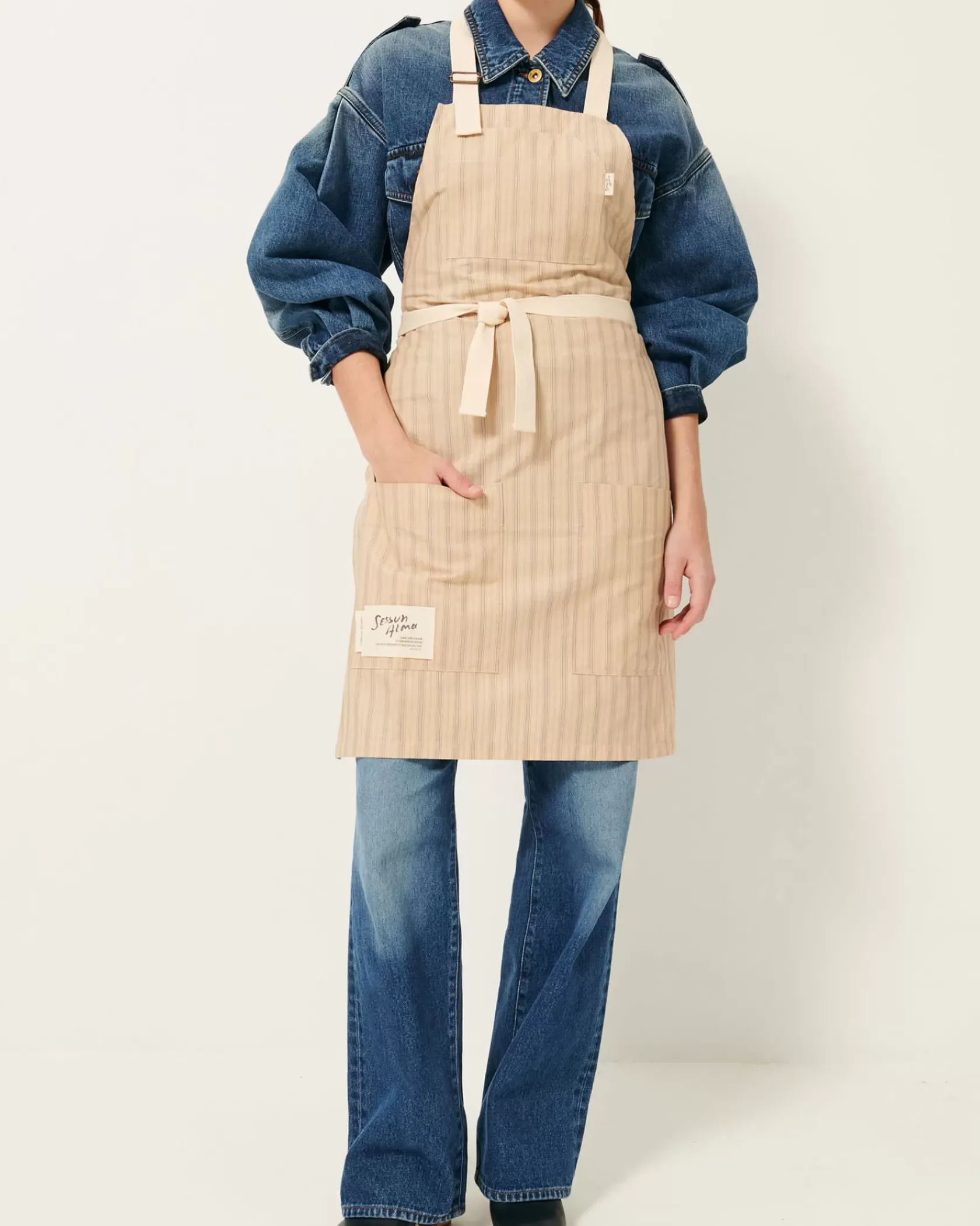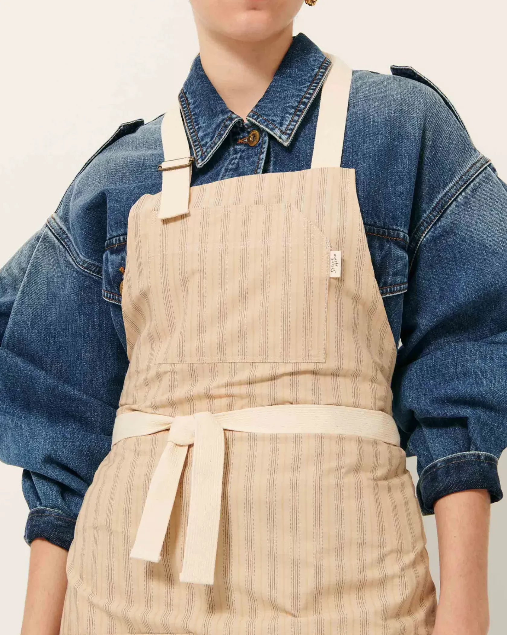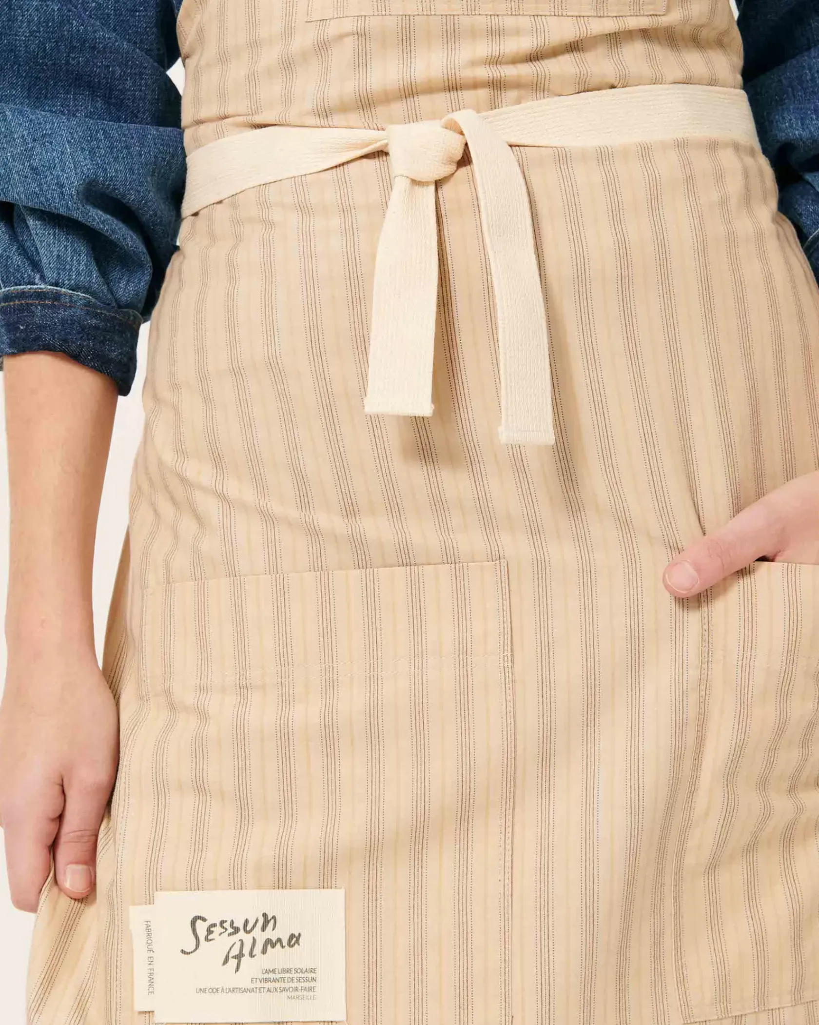 Tablier à poches en sergé de coton organique, rayures fantaisies tissées en jacquard en France.