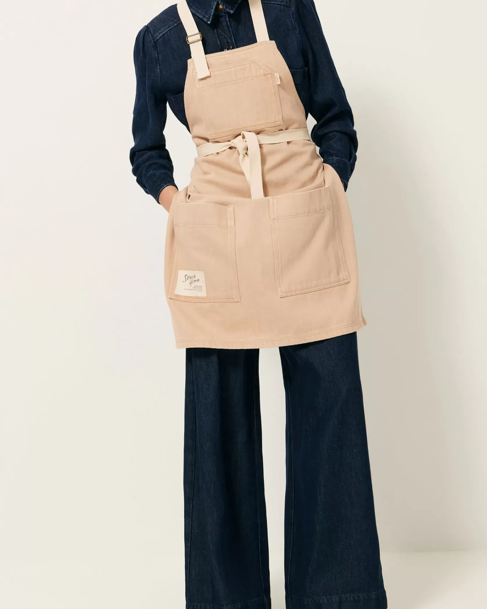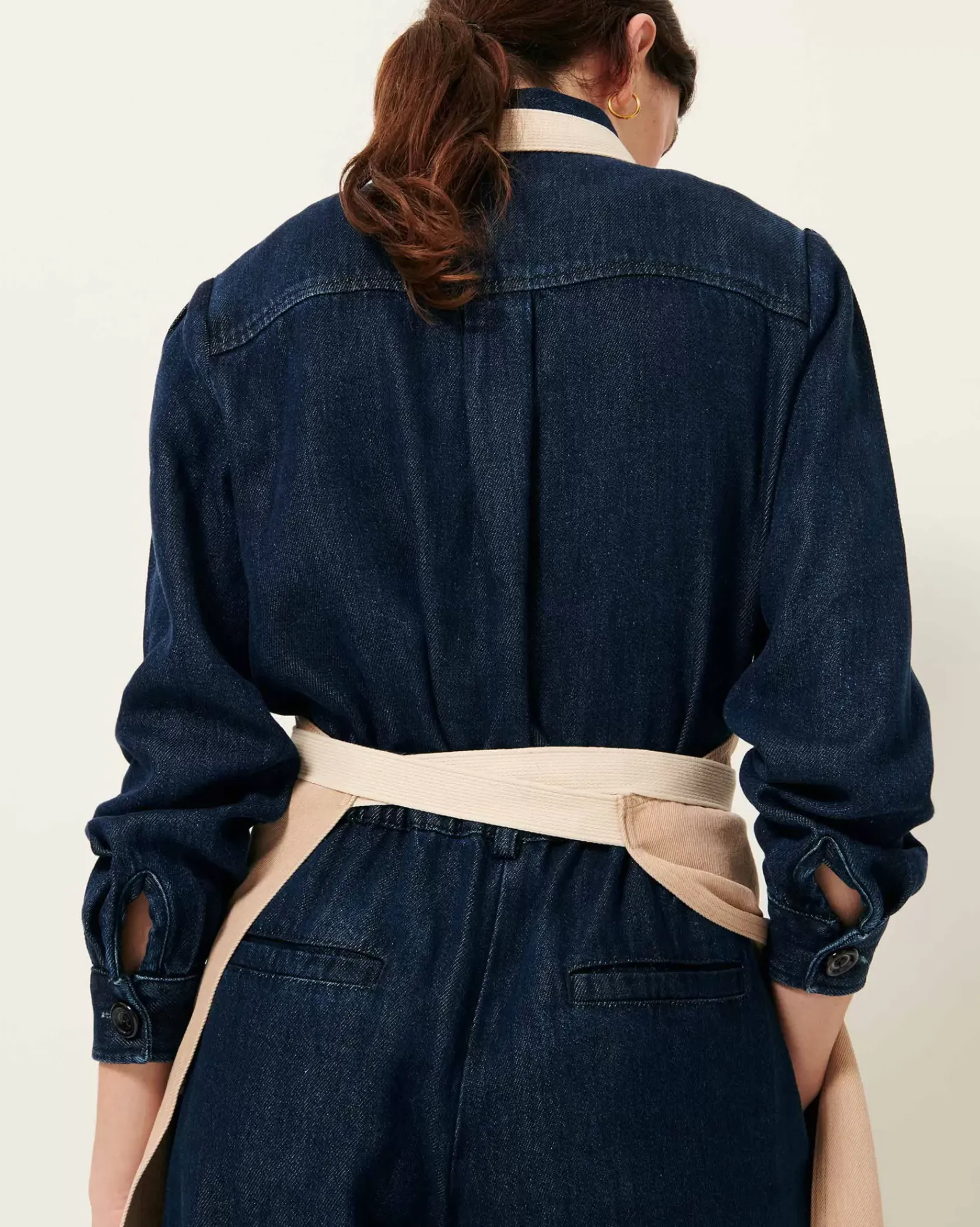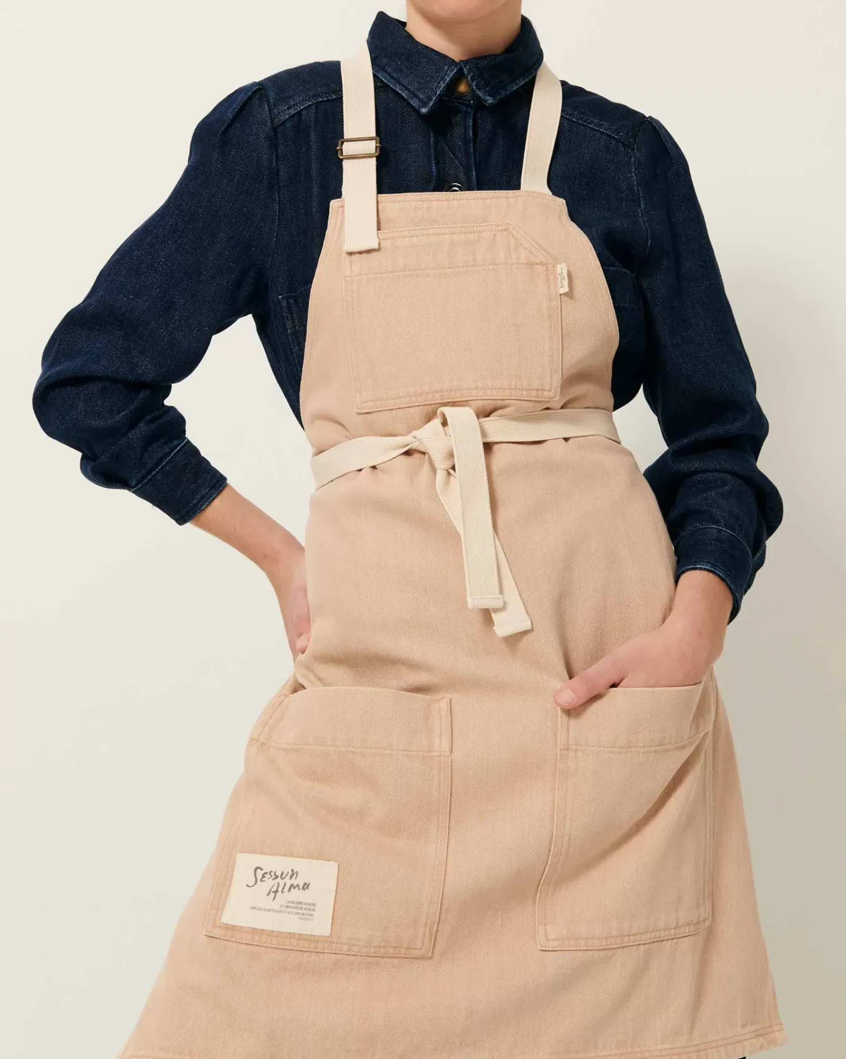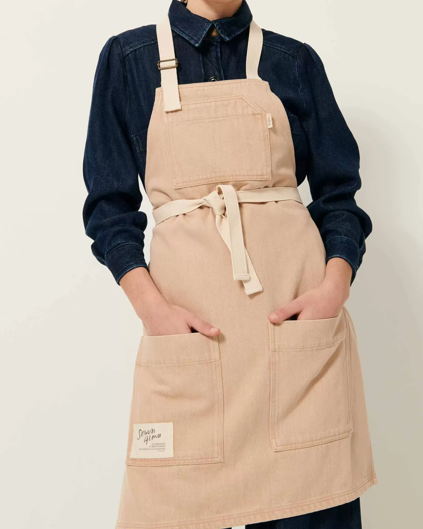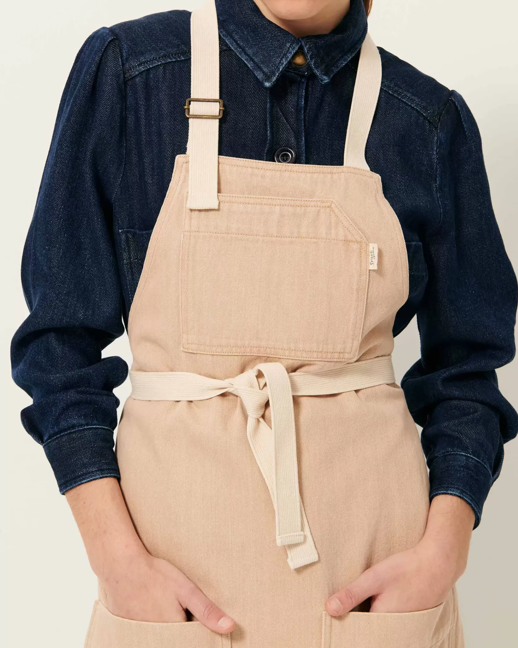 Tablier à poches en sergé de coton, fils teints, effet chambray.