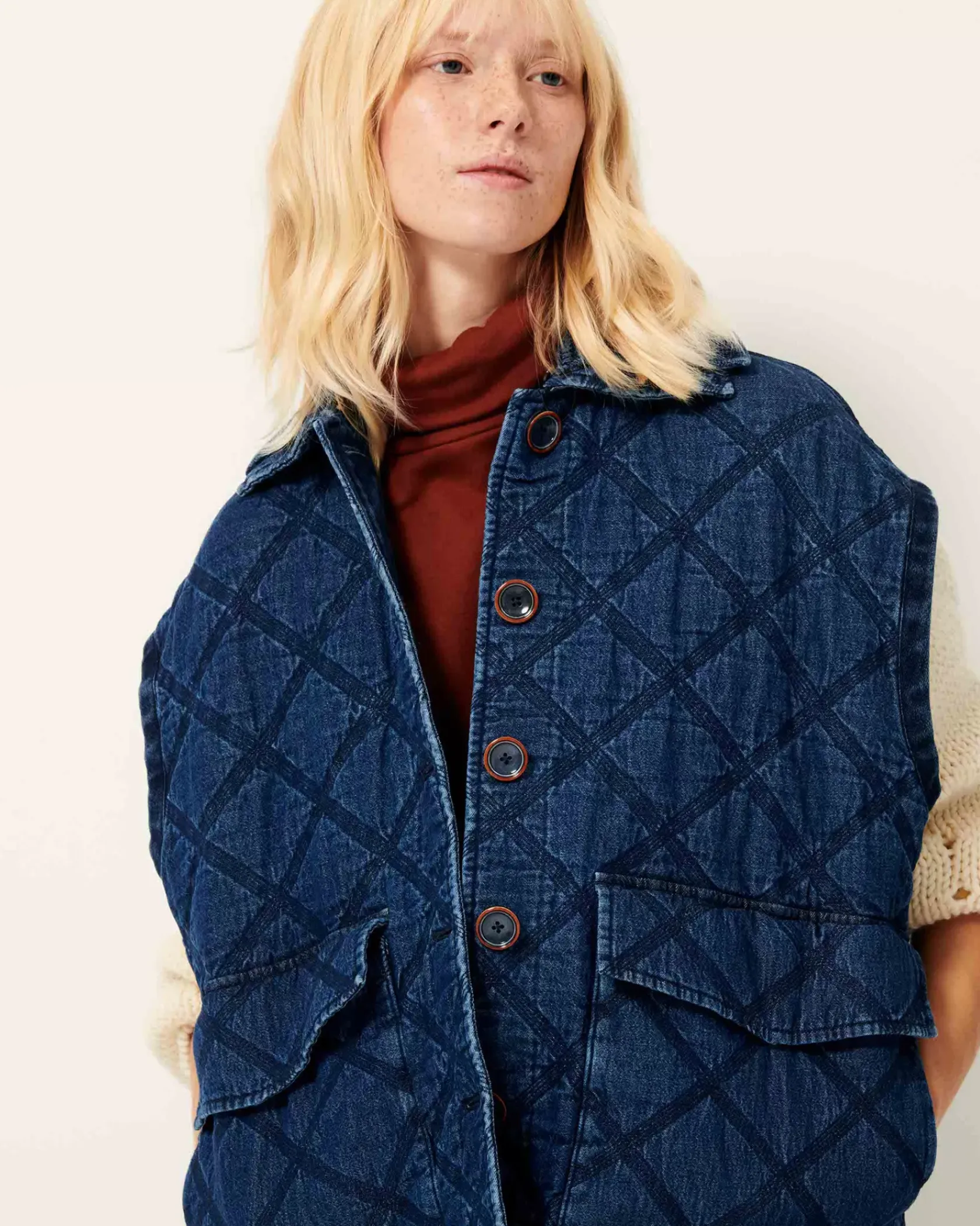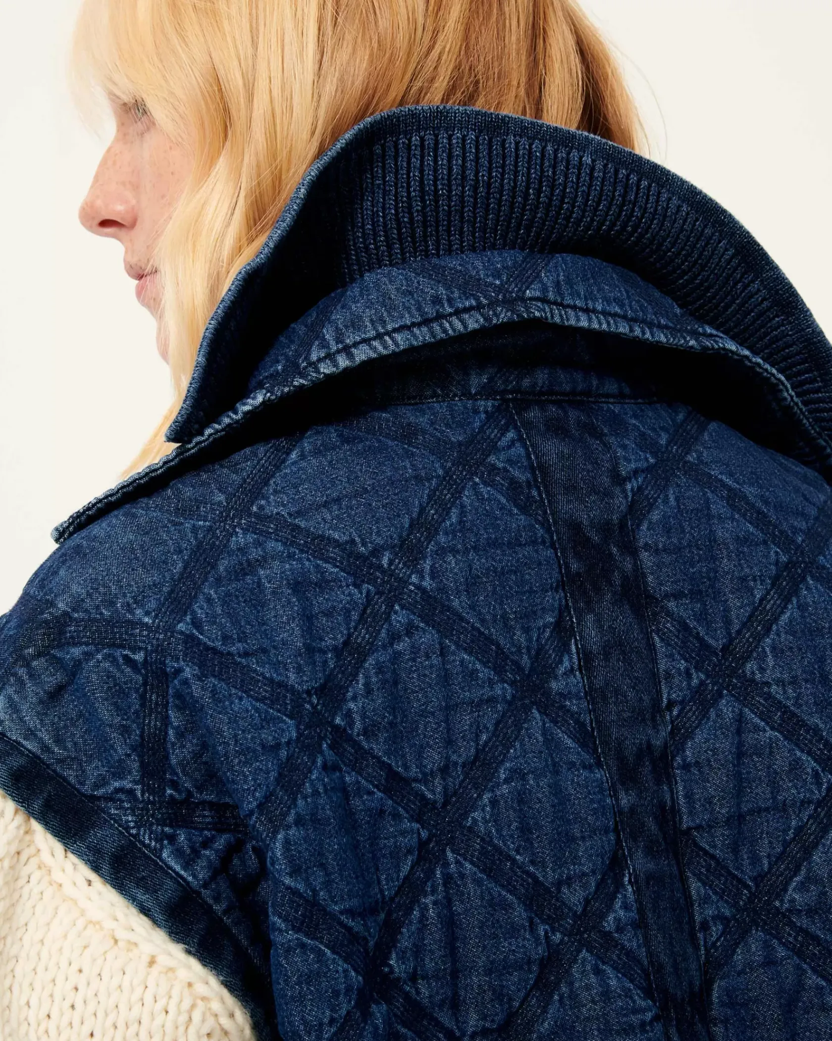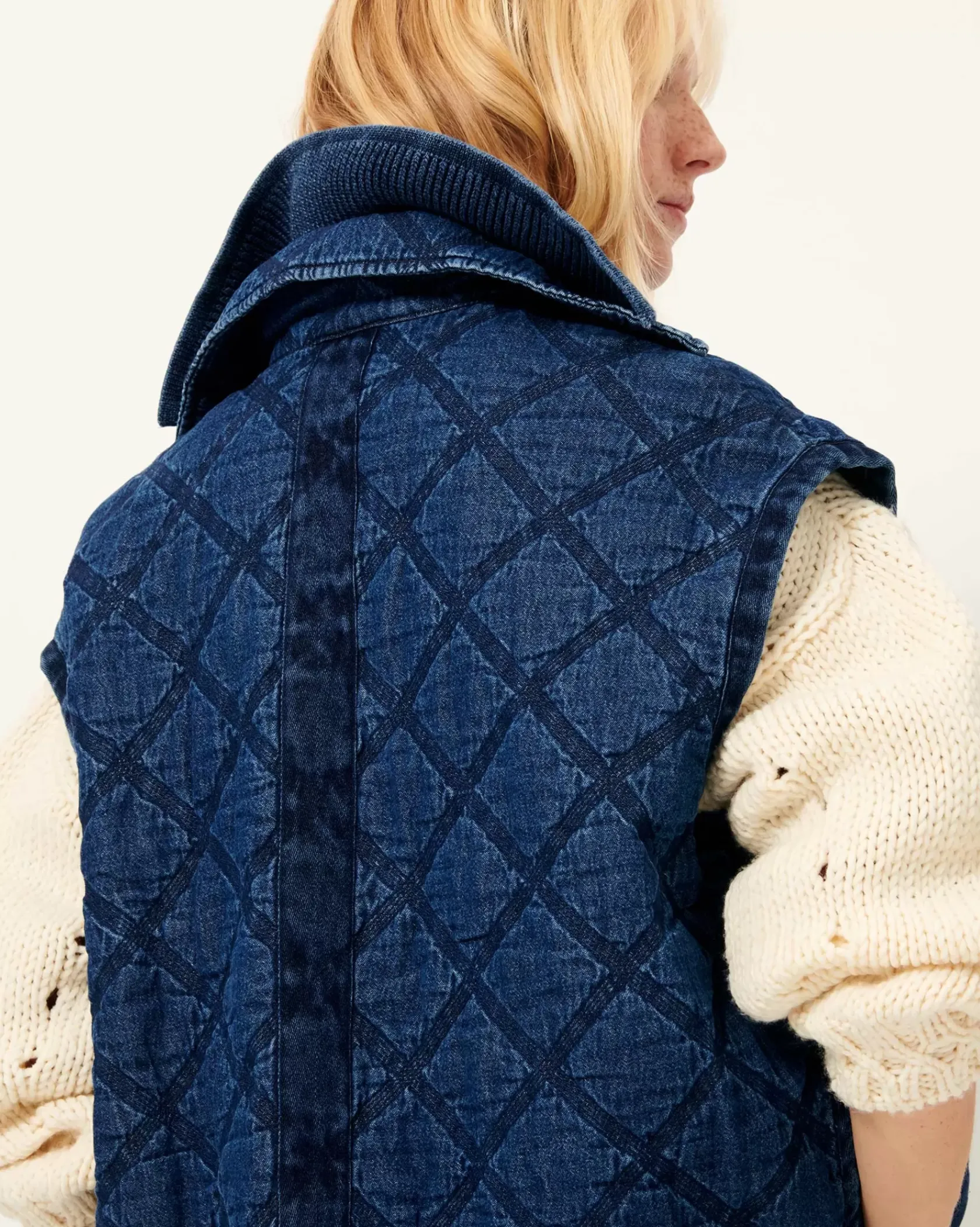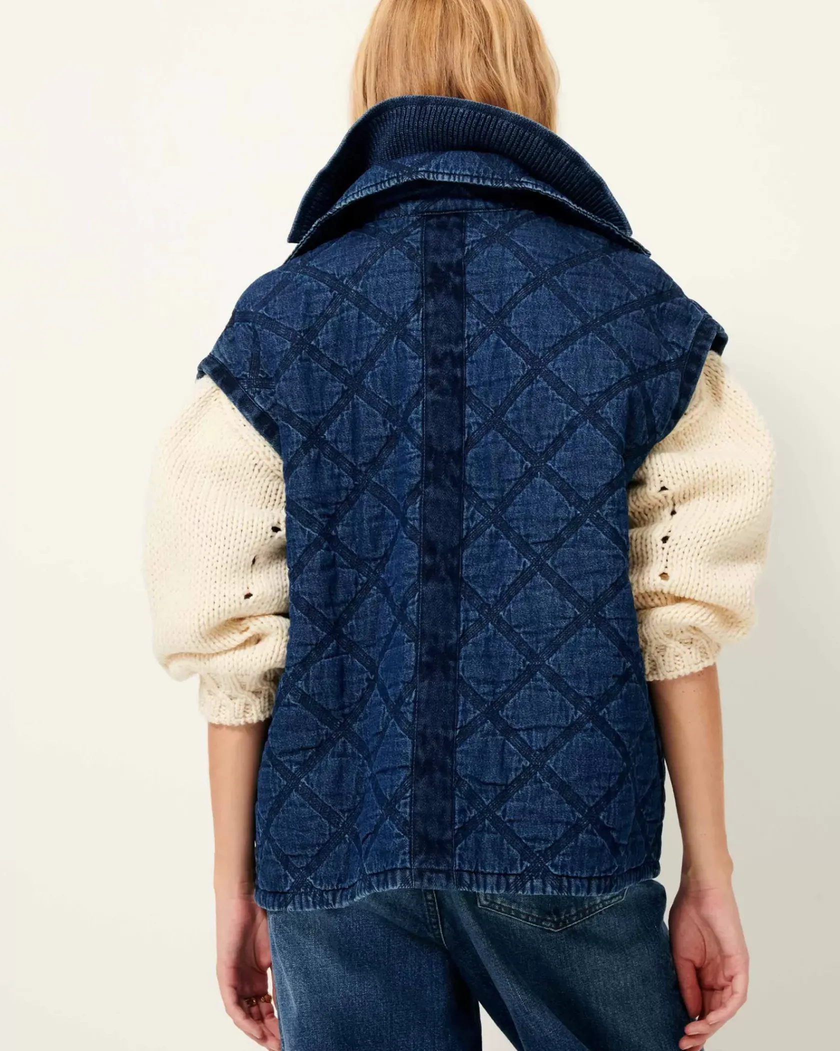 Veste sans manches à col amovible en matelassage stonewashé de toile de denim.