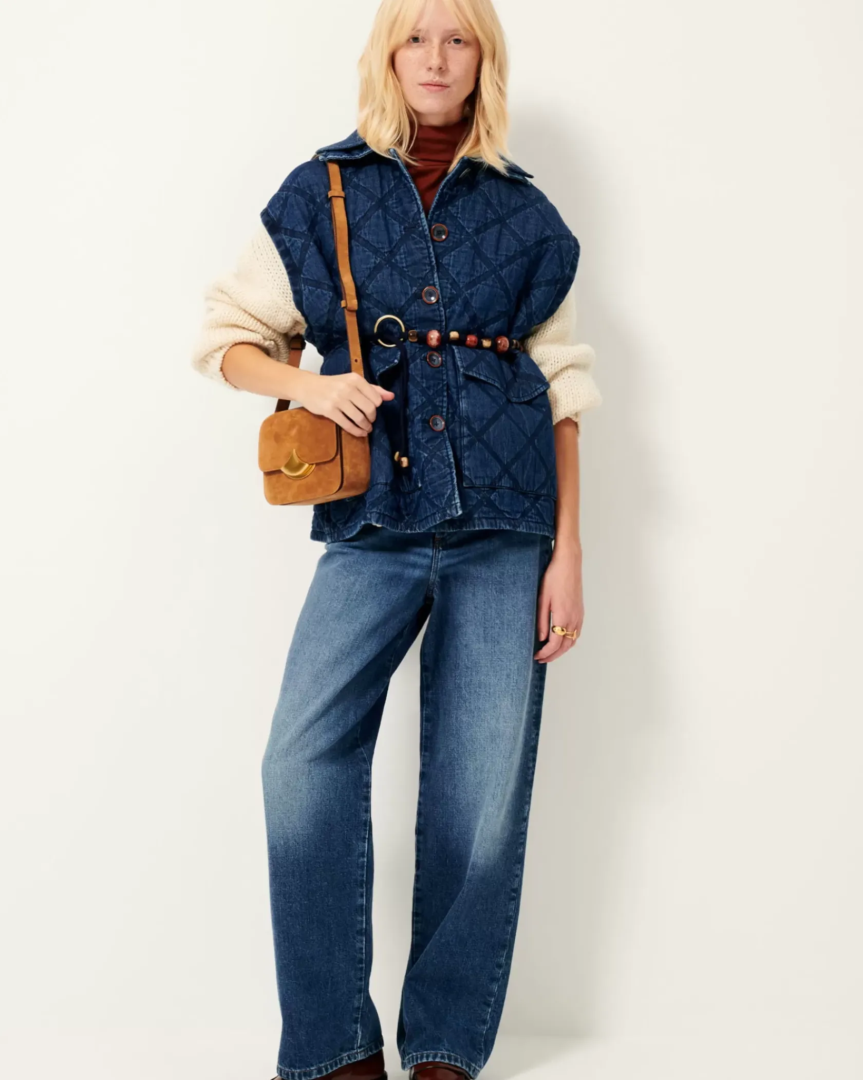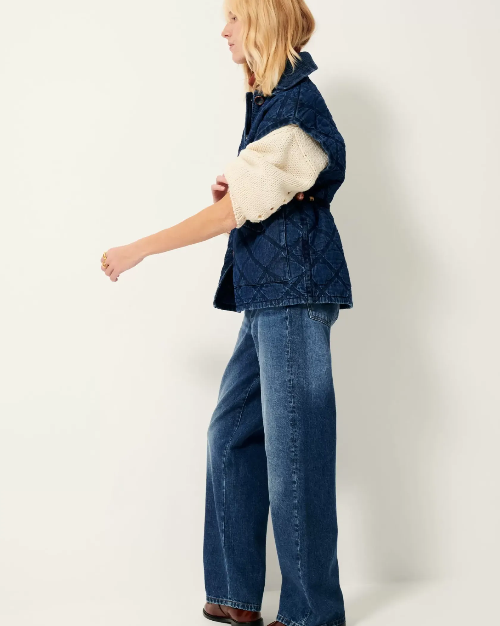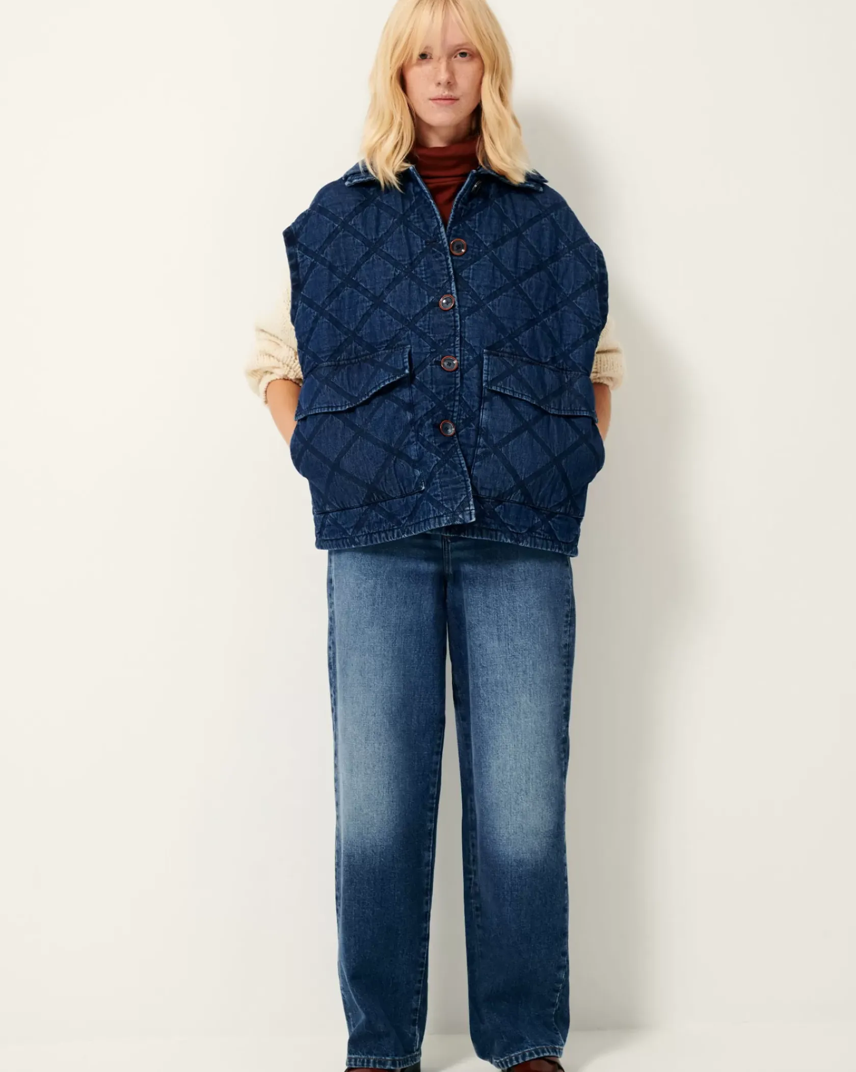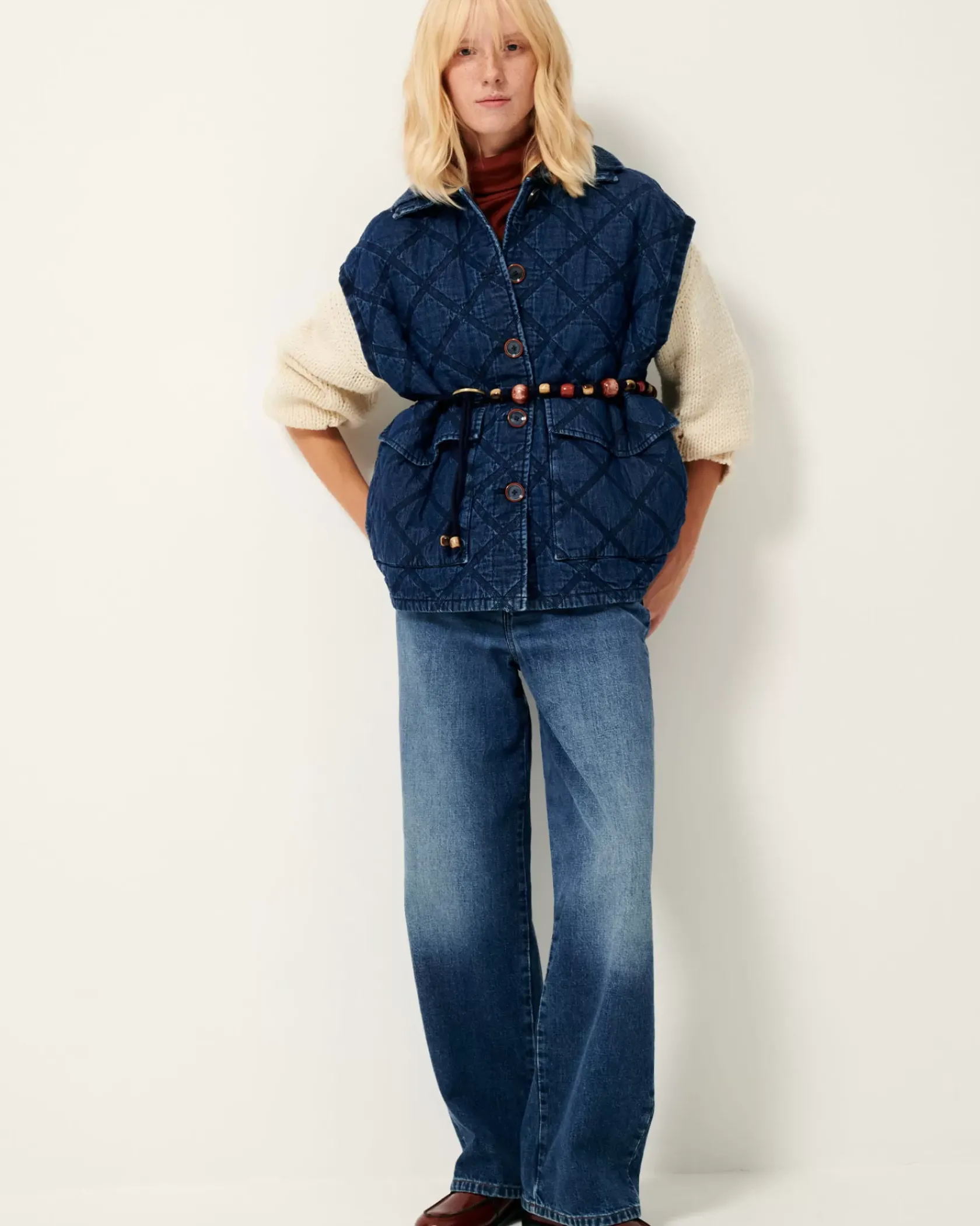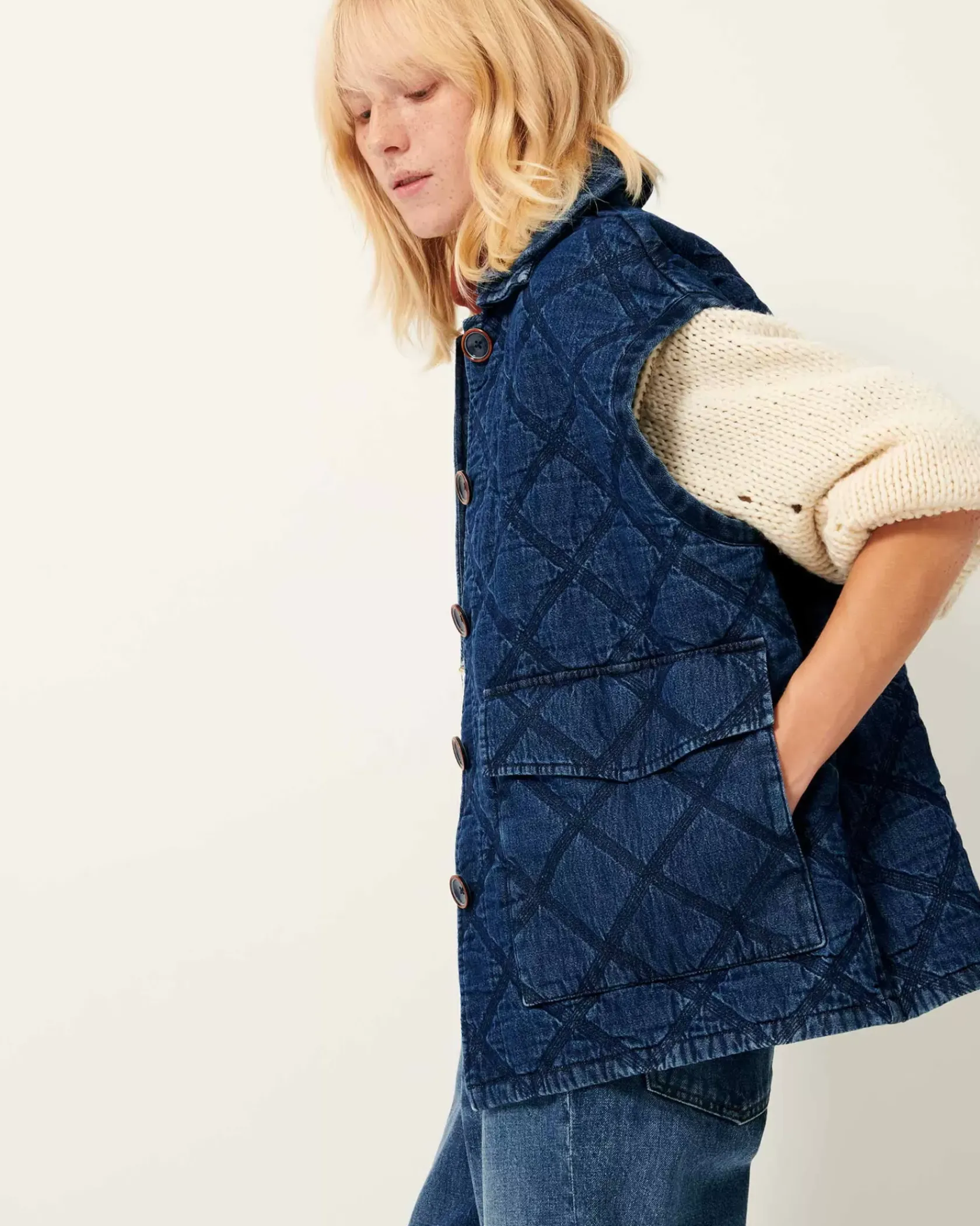 Veste sans manches à col amovible en matelassage stonewashé de toile de denim.