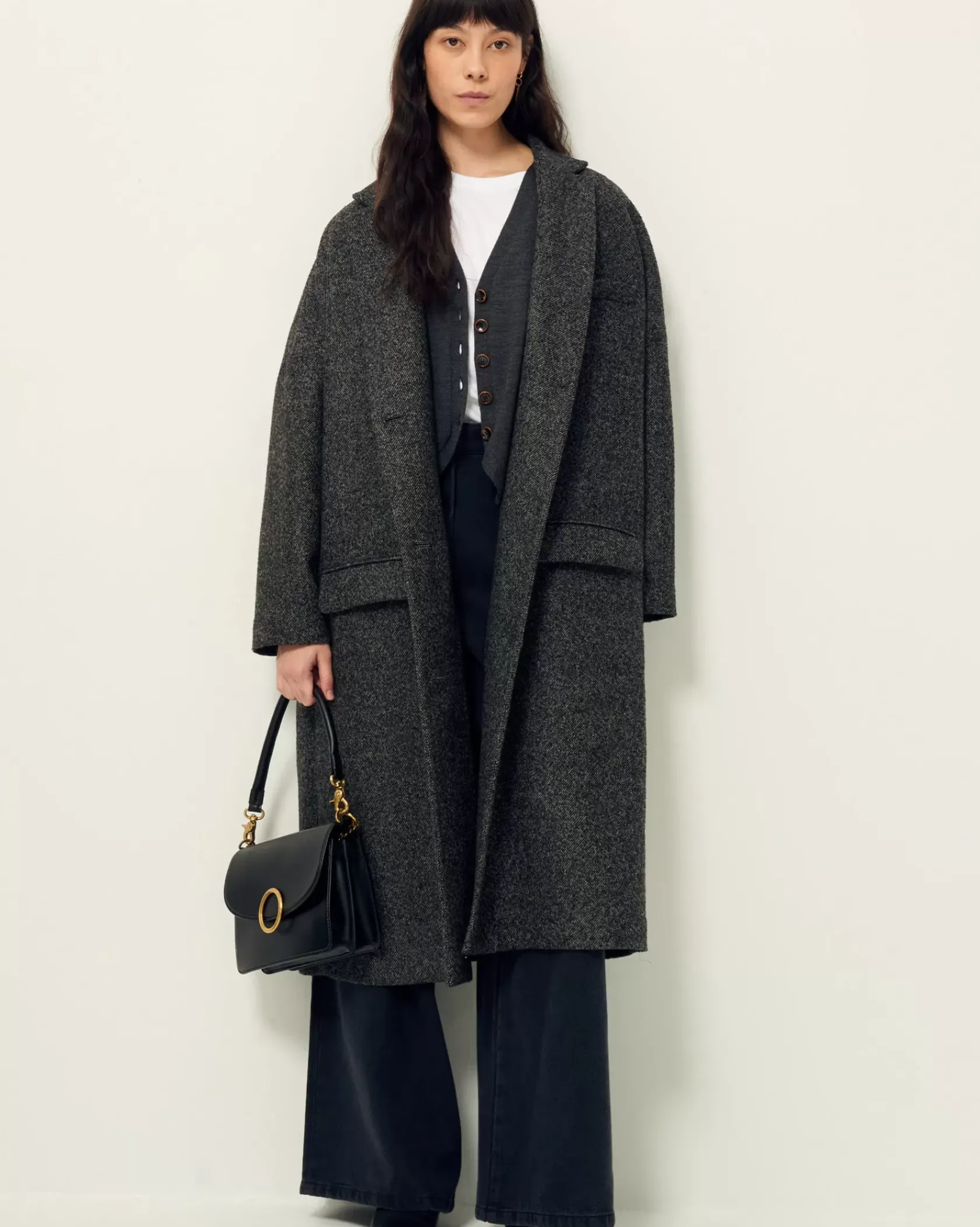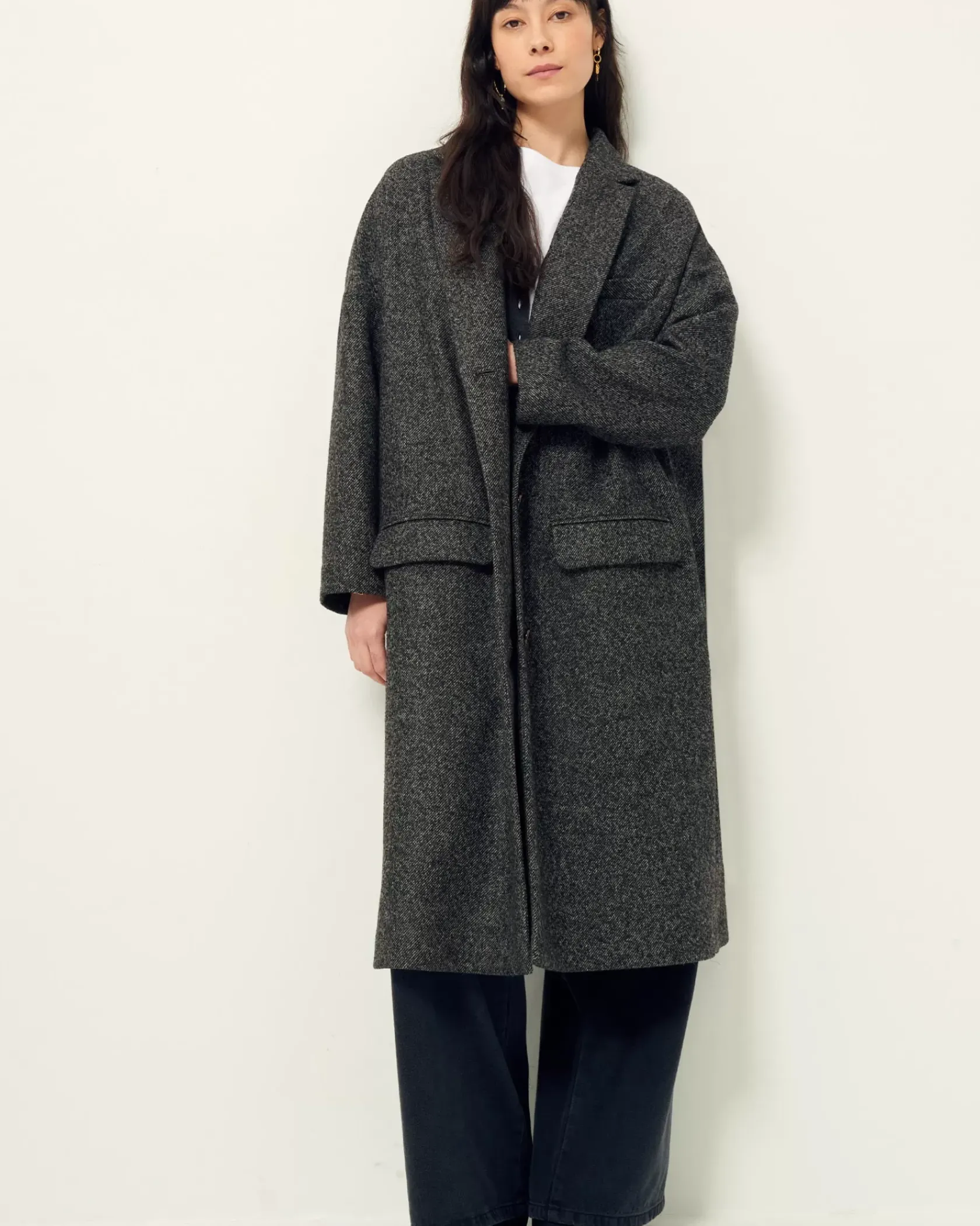 Manteau long non doublé à emmanchures bases en tissage twill fantaisie de fils chinés tissé en Italie.