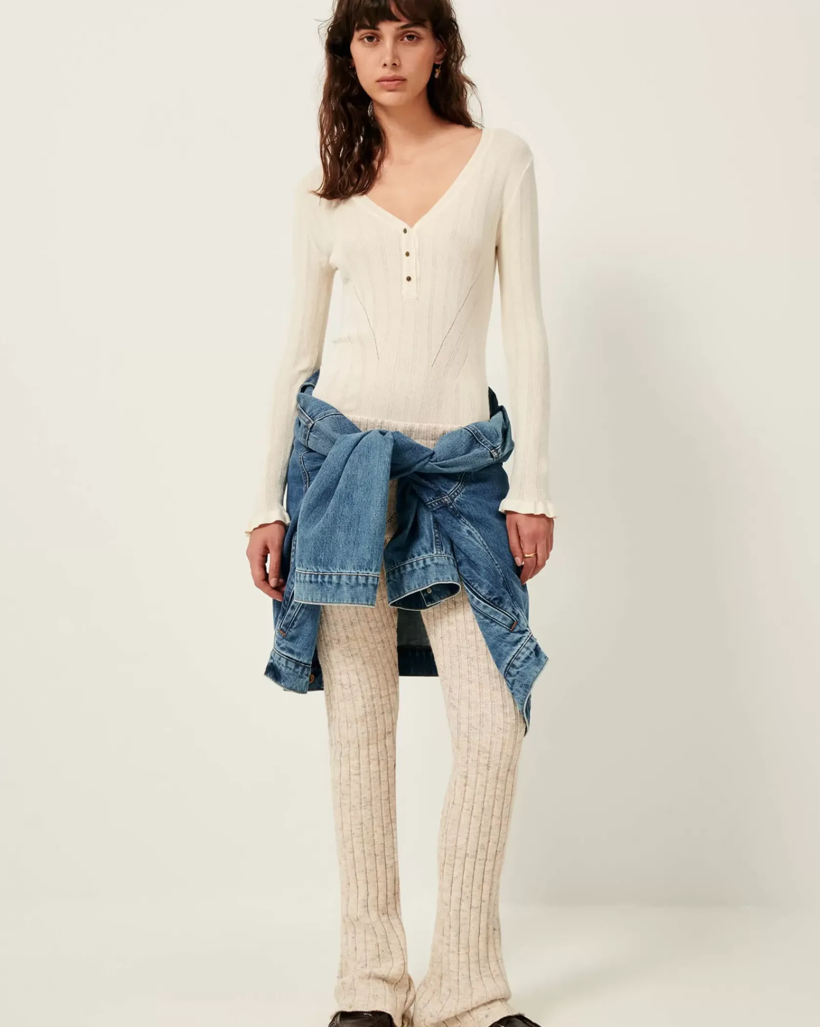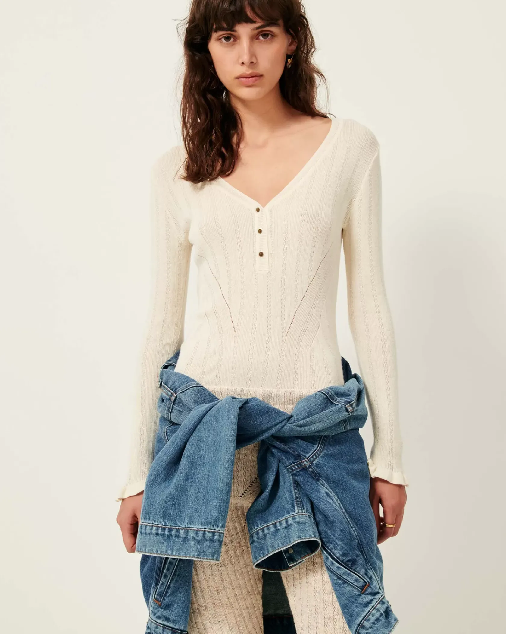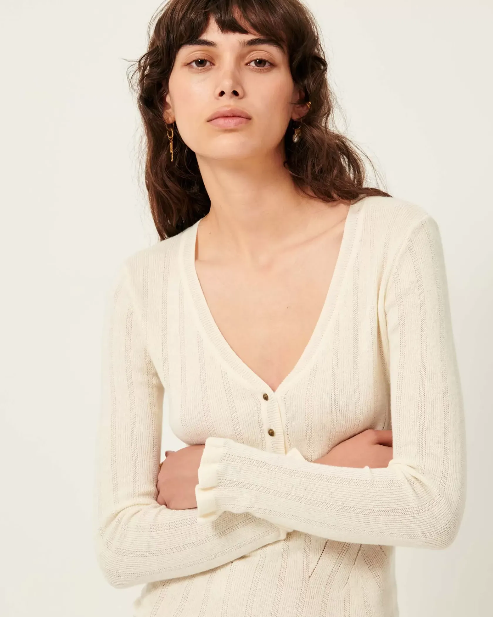 Top ajusté encolure boutonnée en maille fine jauge et jeu de côtes graphique aux côtés.