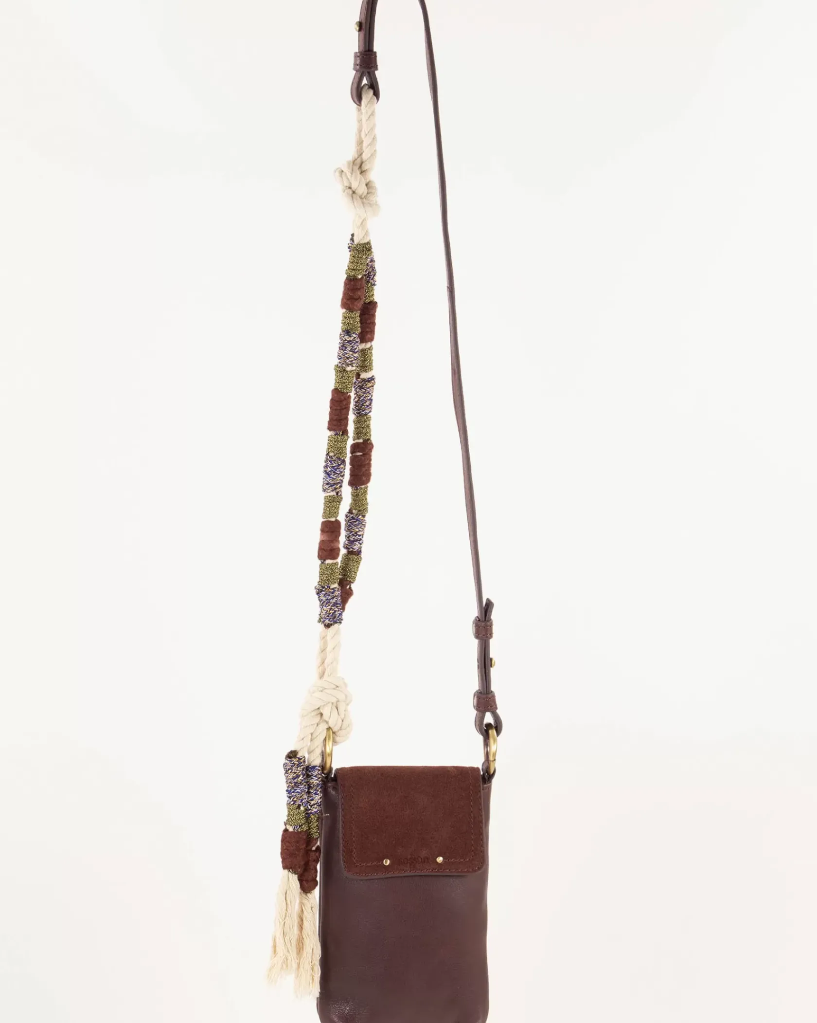 Porte portable en cuir de vache et rabat en cuir de vache suédé, anse corde tressée.
