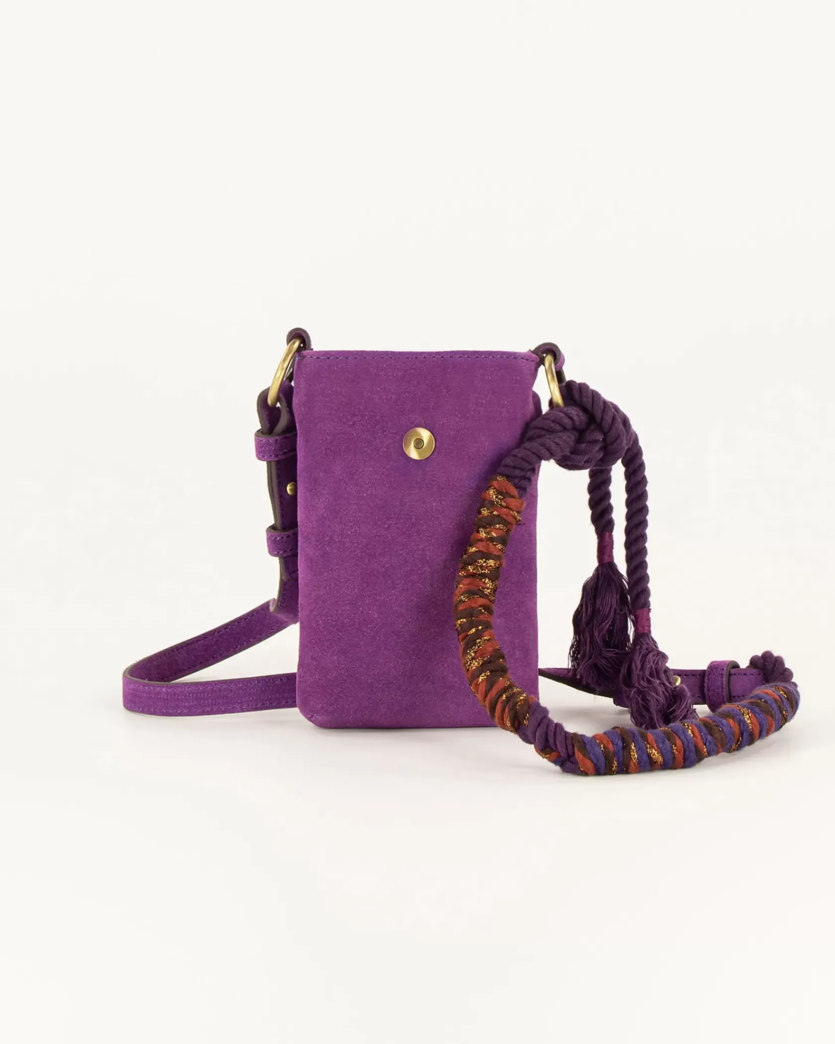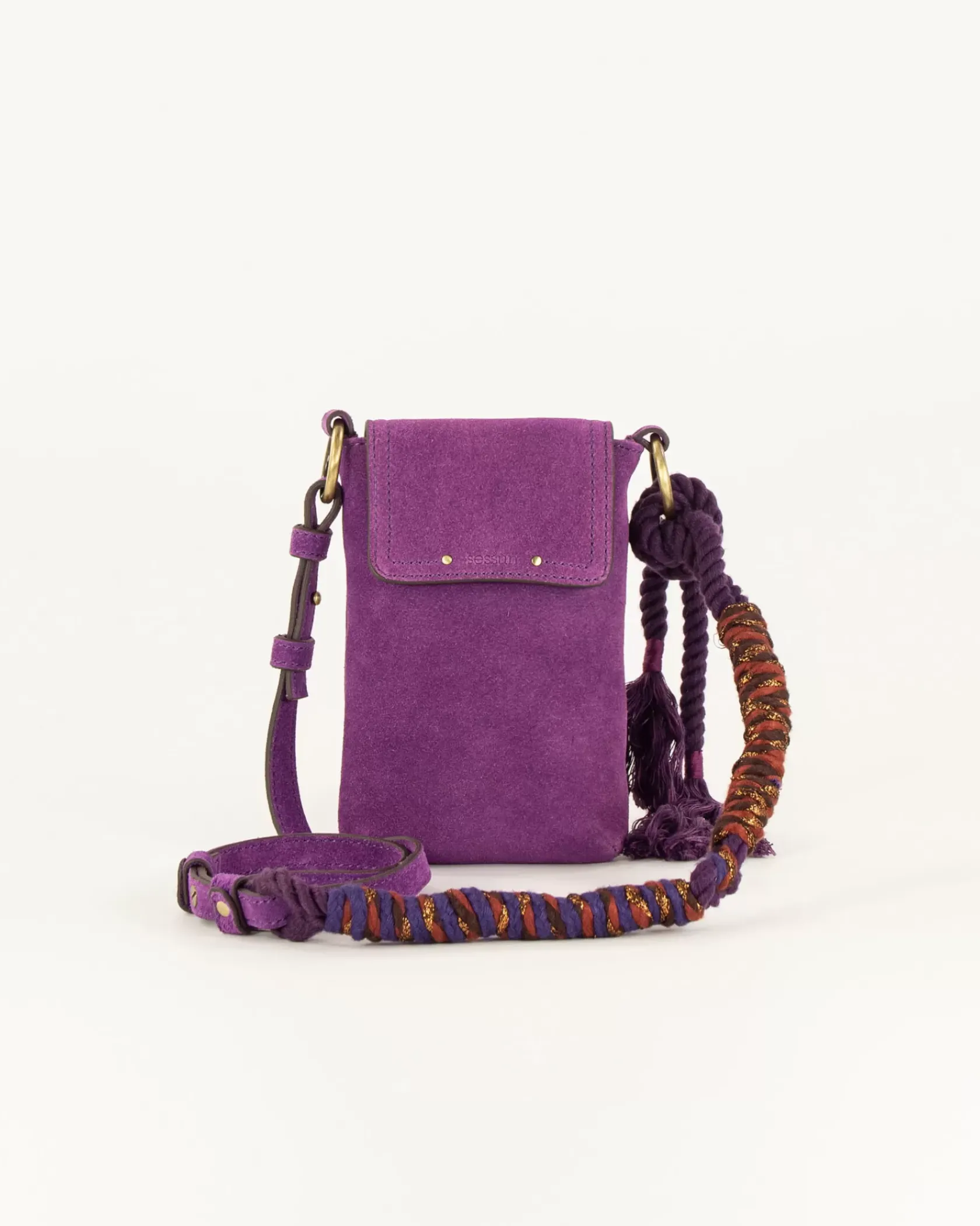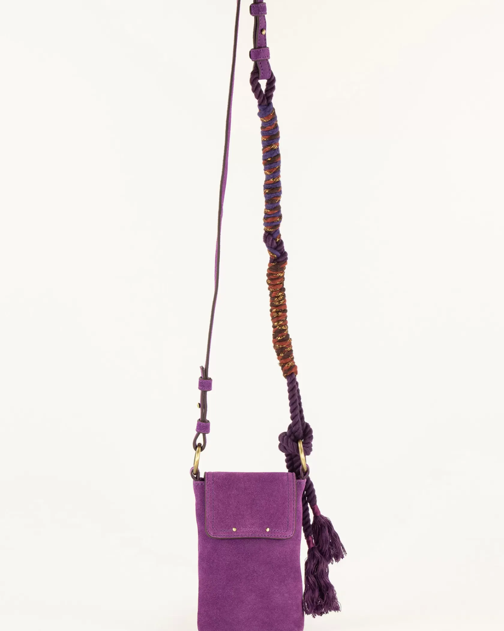 Porte portable en cuir de vache et rabat en cuir de vache suédé, anse corde tressée.
