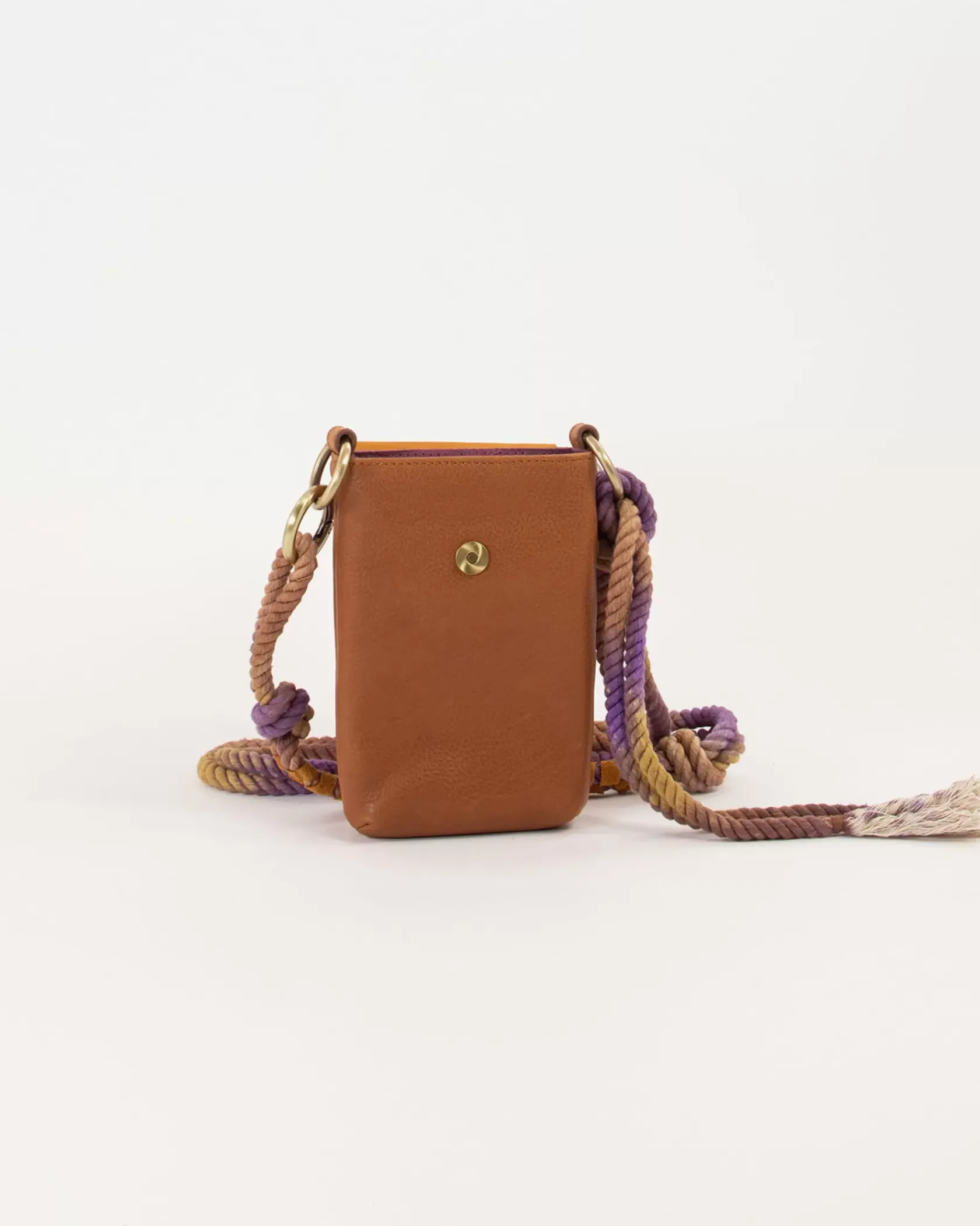 Porte portable en cuir de vache et rabat en cuir de vache suédé, anse corde tressée.