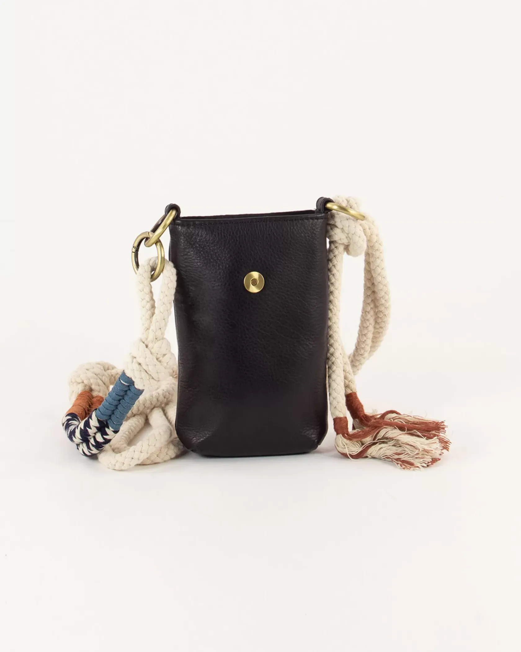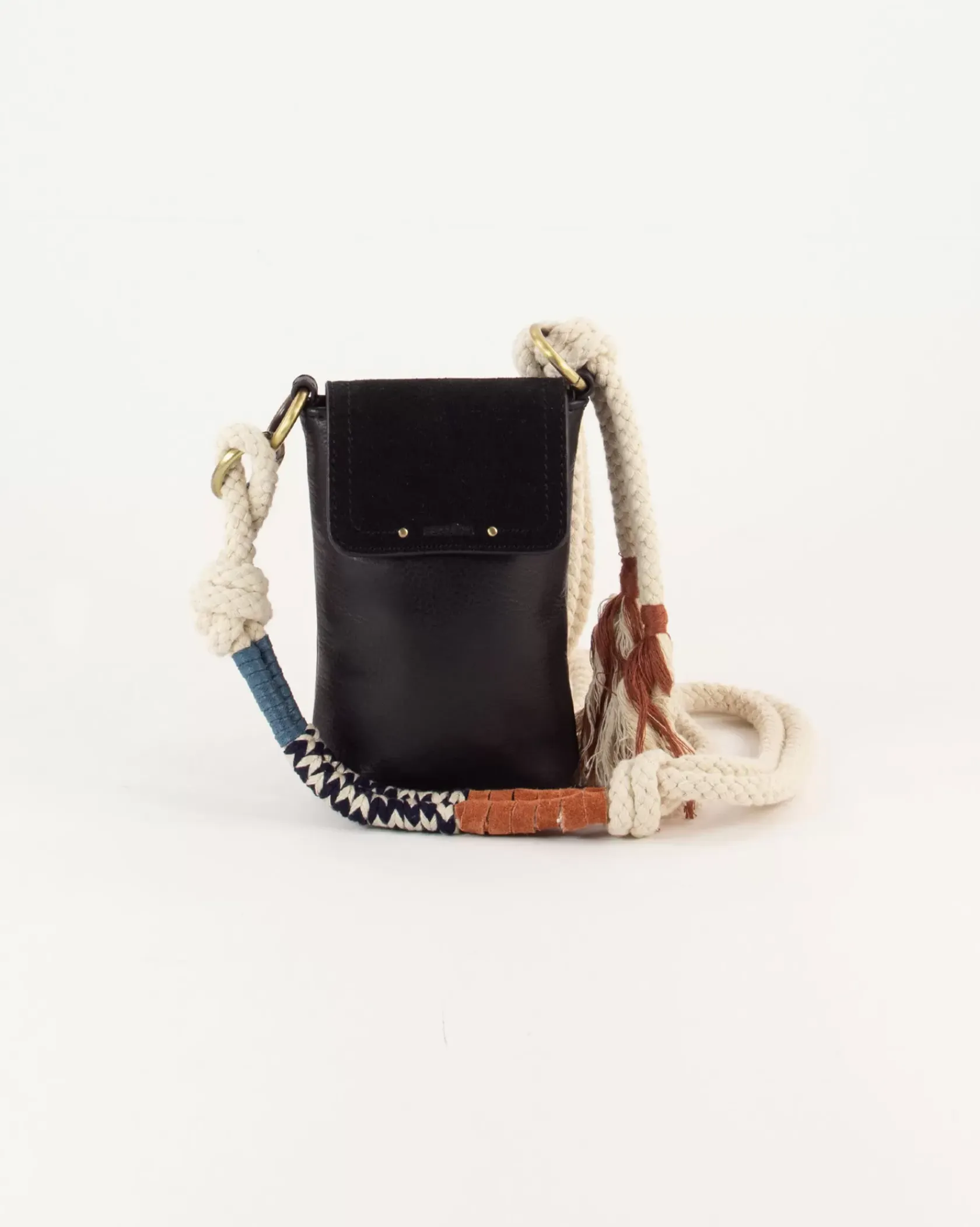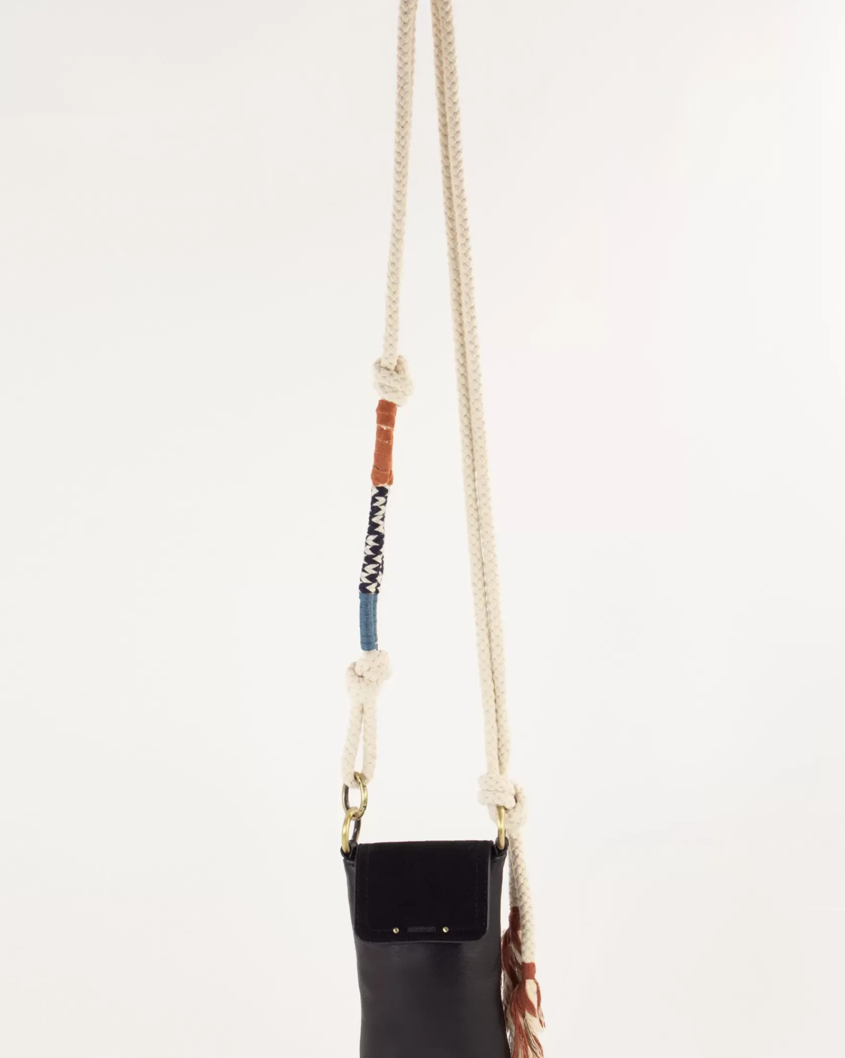 Porte portable en cuir de vache et rabat en cuir de vache suédé, anse corde tressée.