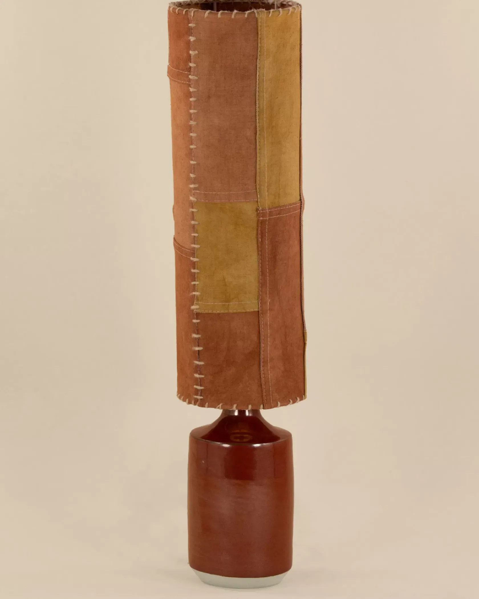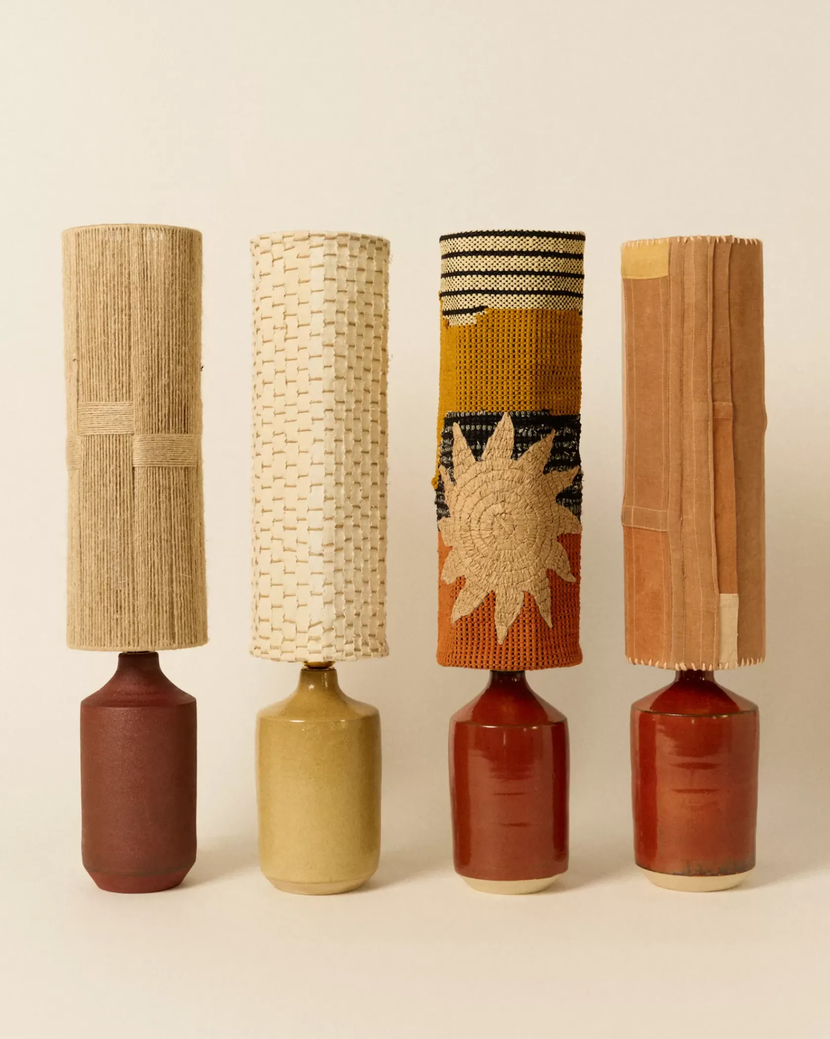 La lampe Ezia signée Sessùn en terre cuite émaillée aux allures 70’s, réalisée au tour par un potier de Forcalquier (Luberon) est surmontée d’un abat-jour façonné grâce à des teintures végétales, dans une déclinaison de patchworks.