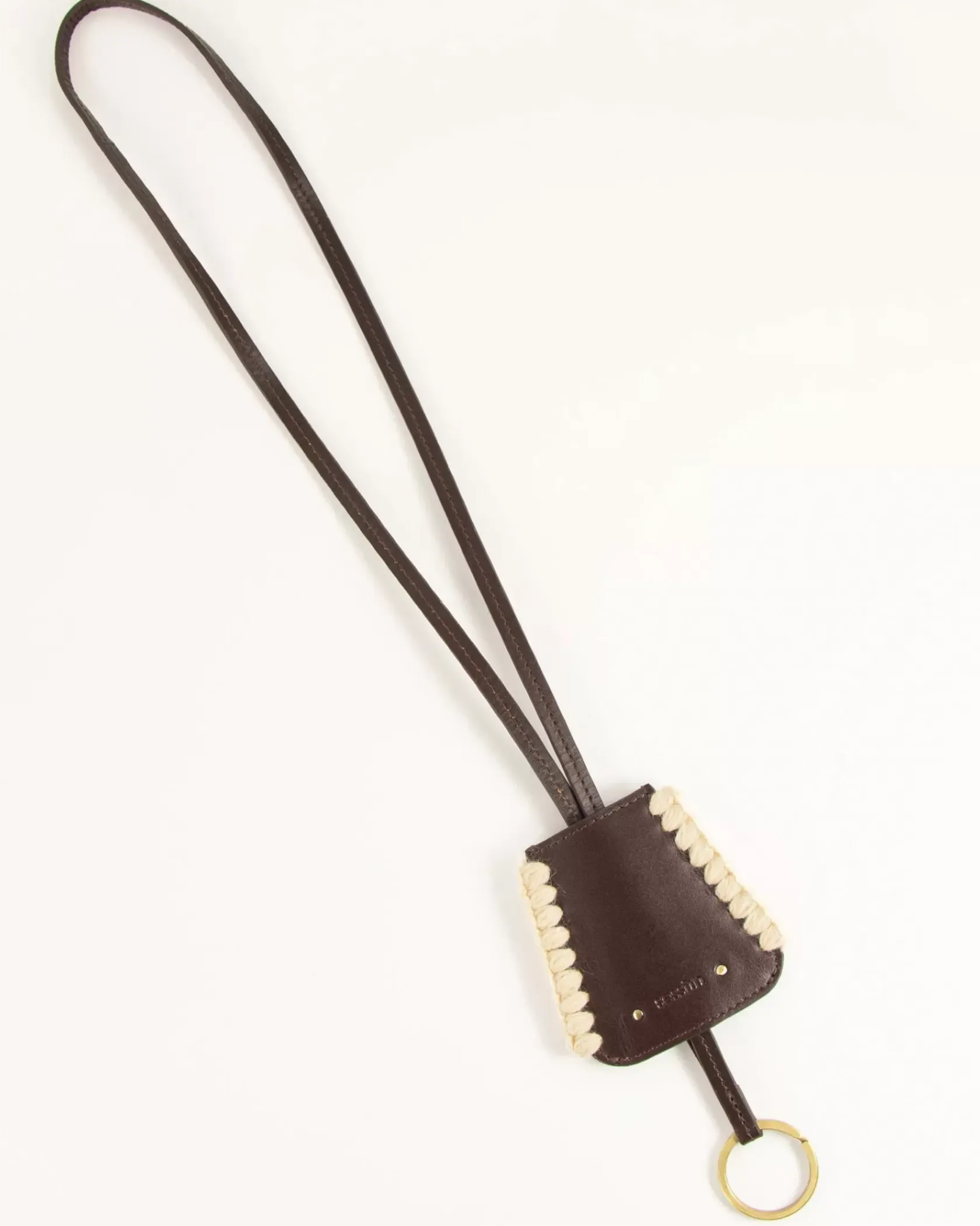 Porte clé cloche en cuir de vache tannage végétal brodé de laine.